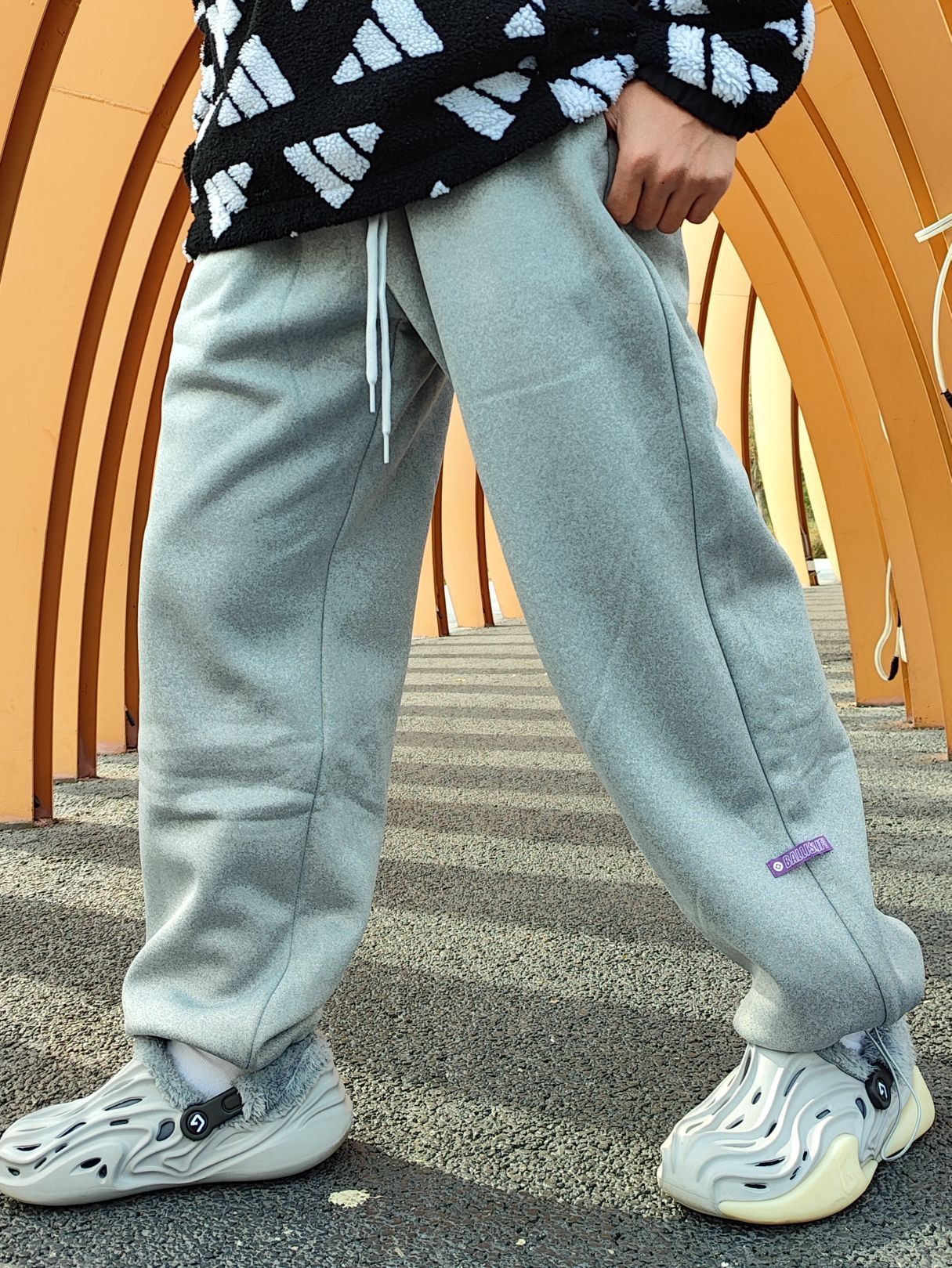 ☑️冬季来了就得安排软和的裤子,即适合穿搭又适合运动的裤子是首选,今天推荐一下这条冬季必备的准者加绒卫裤! ☑️有黑.灰两个配色,今天上身的是灰色加绒裤。首先说说大家最关心的尺码问题。我165上身的是M码,偏大,适合170-175的小伙们上身。垂顺感挺不错的,版型也是偏大的版型,上身很舒适,加绒的内里很不错,很保暖。 ☑️腿部也有准者的身份标识,紫色的挺醒目。裤口是设计的束脚裤,有调节器可以自...