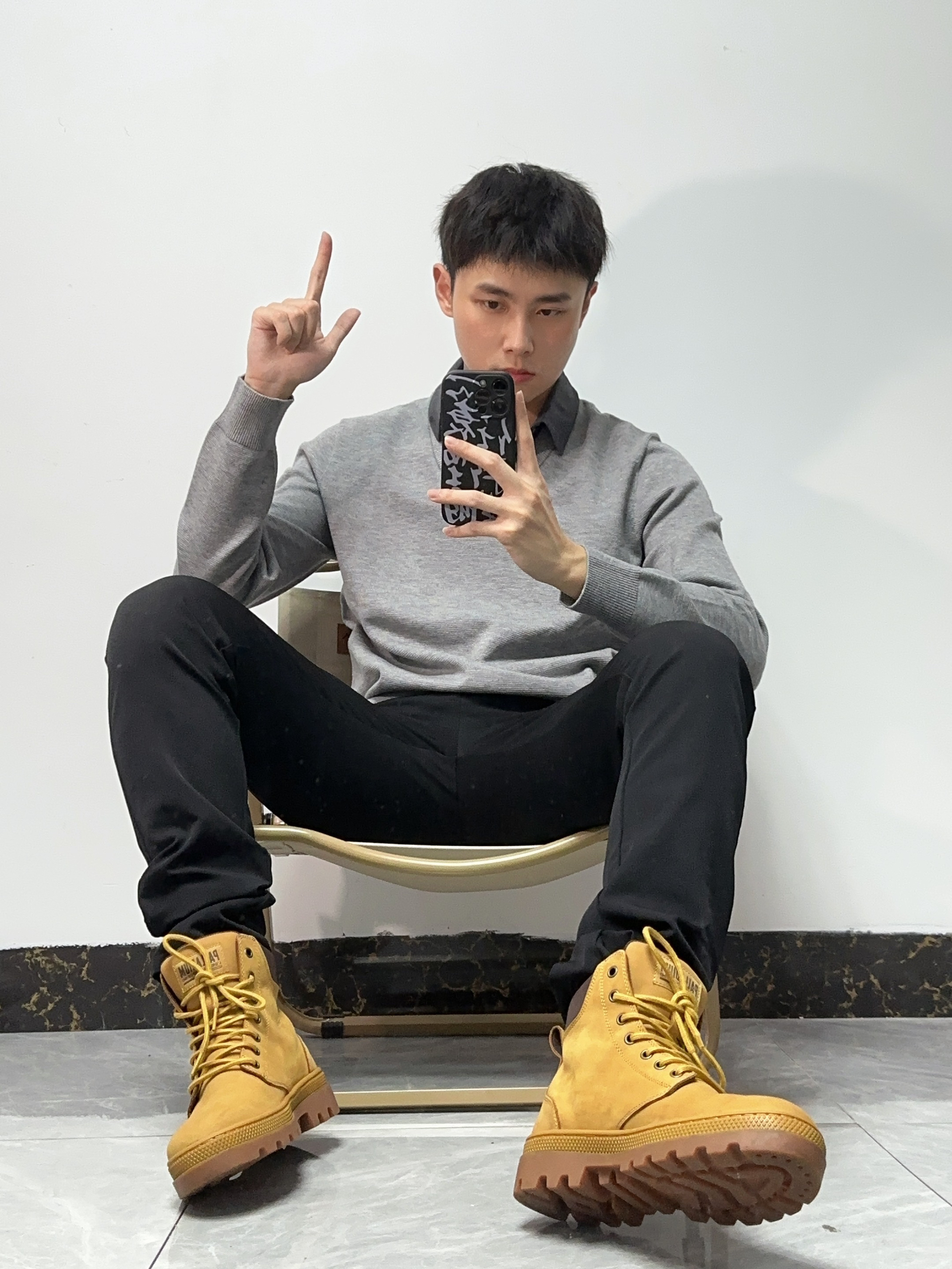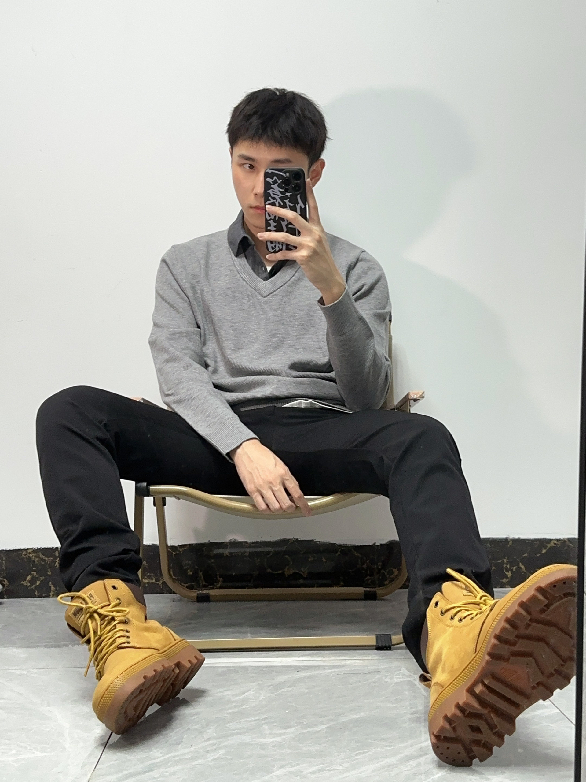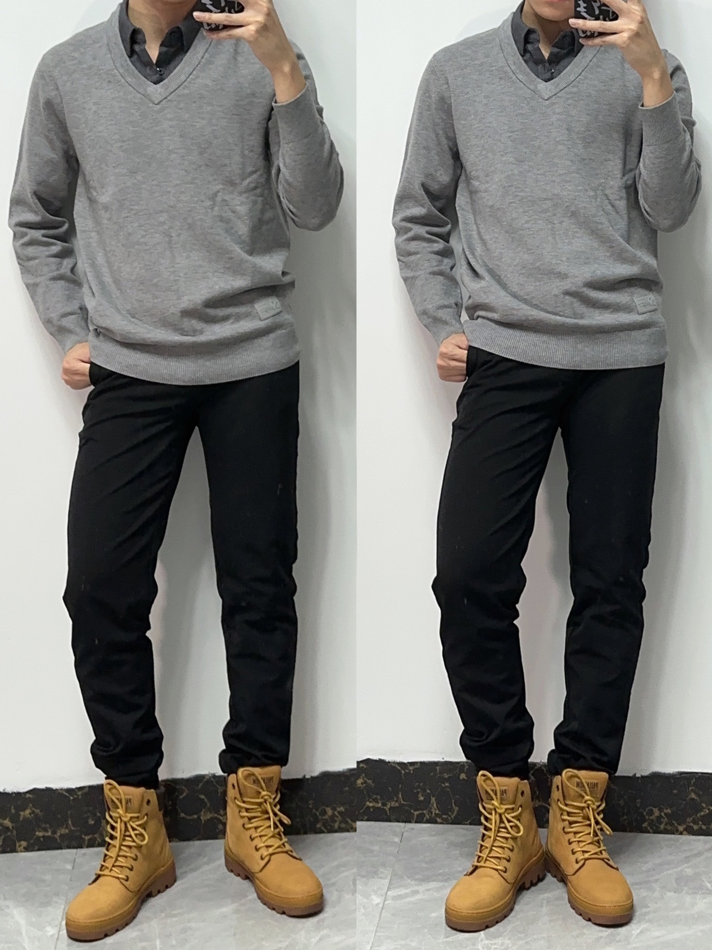 🛬商务风穿搭简单但出彩!很显男人气质,职场穿搭给人稳重的感觉 🛬假两件毛衣polo搭配黑色西裤,再穿上大黄靴,搭配起来很nice,显高又有气质!