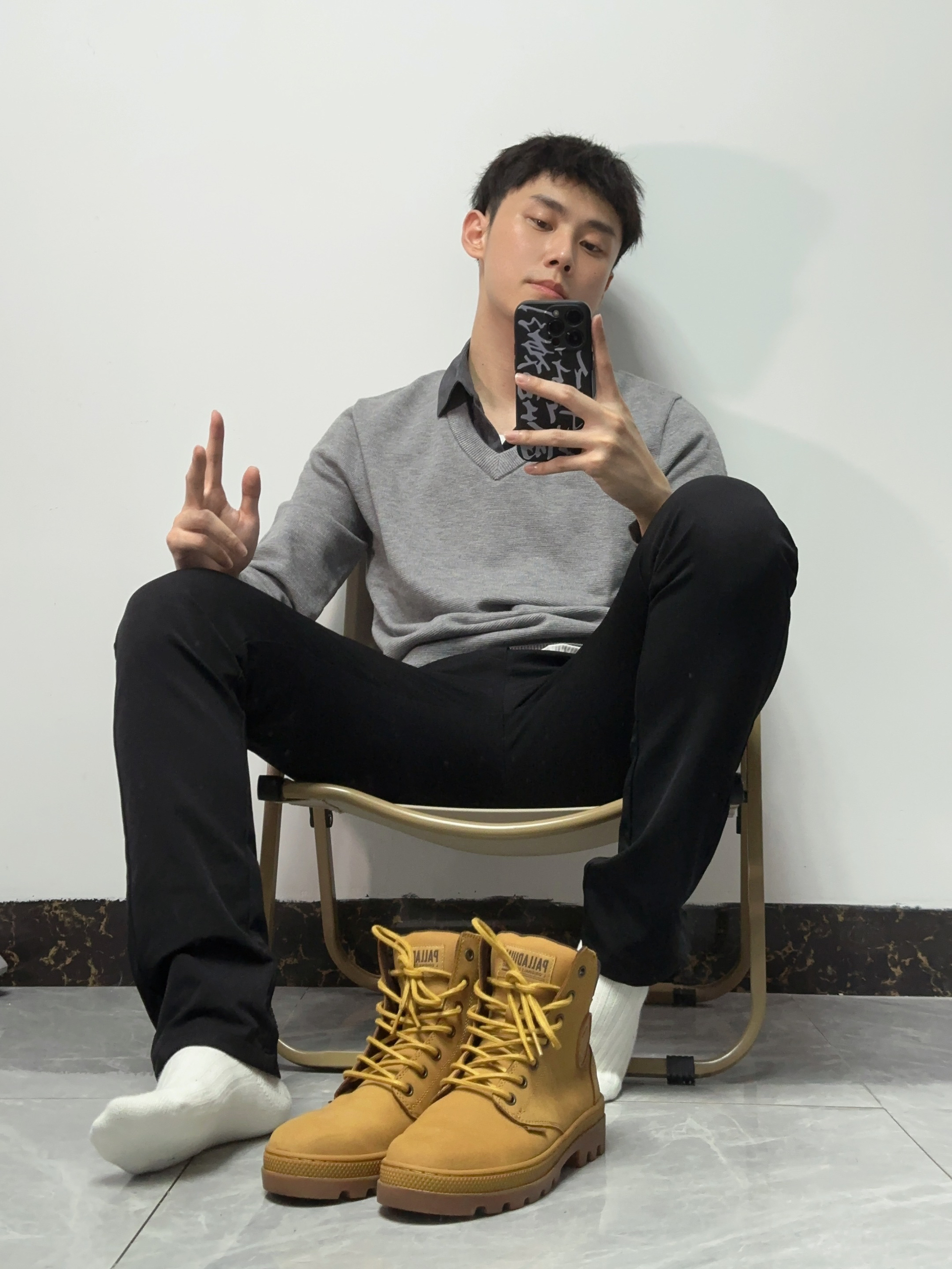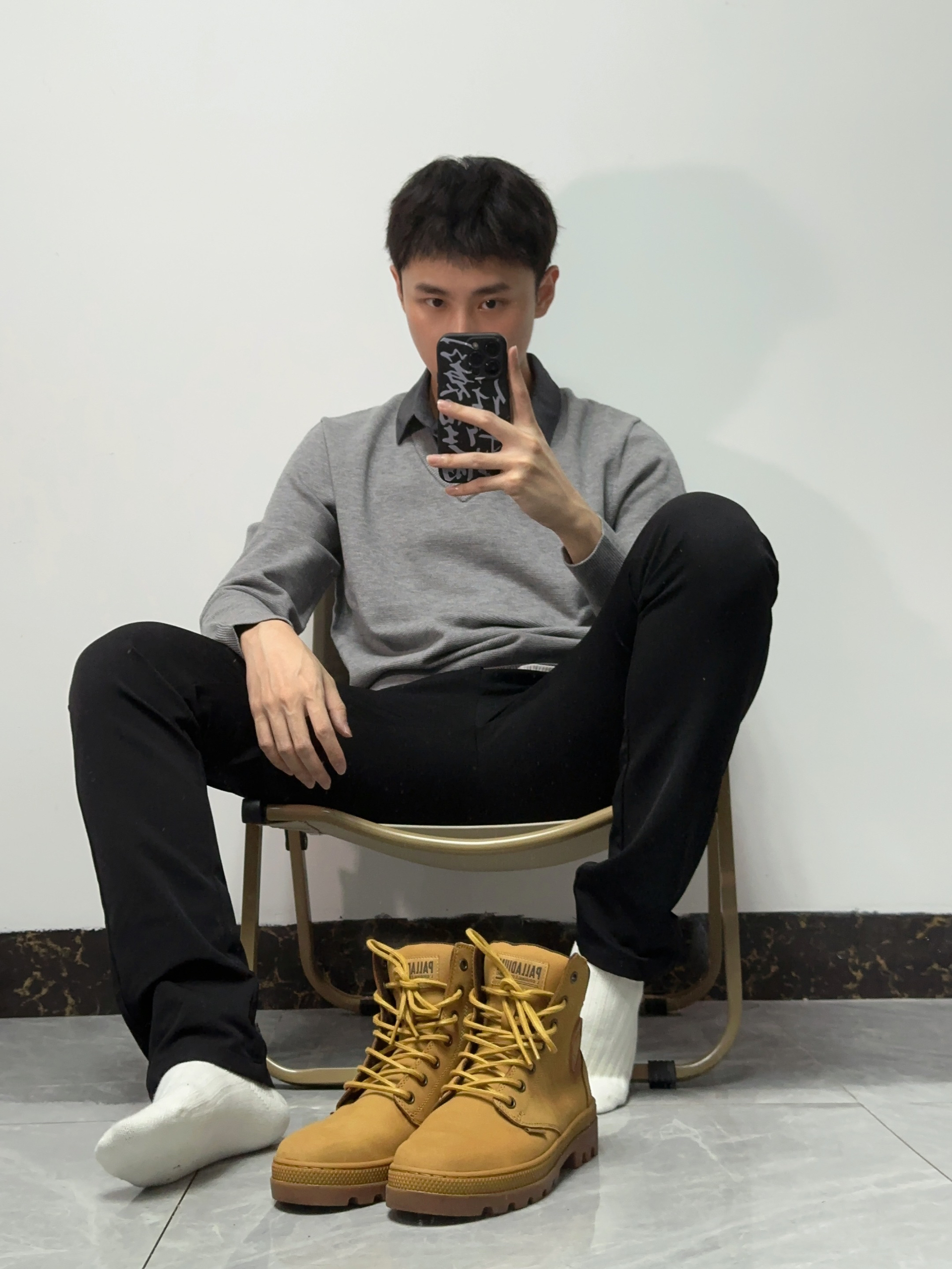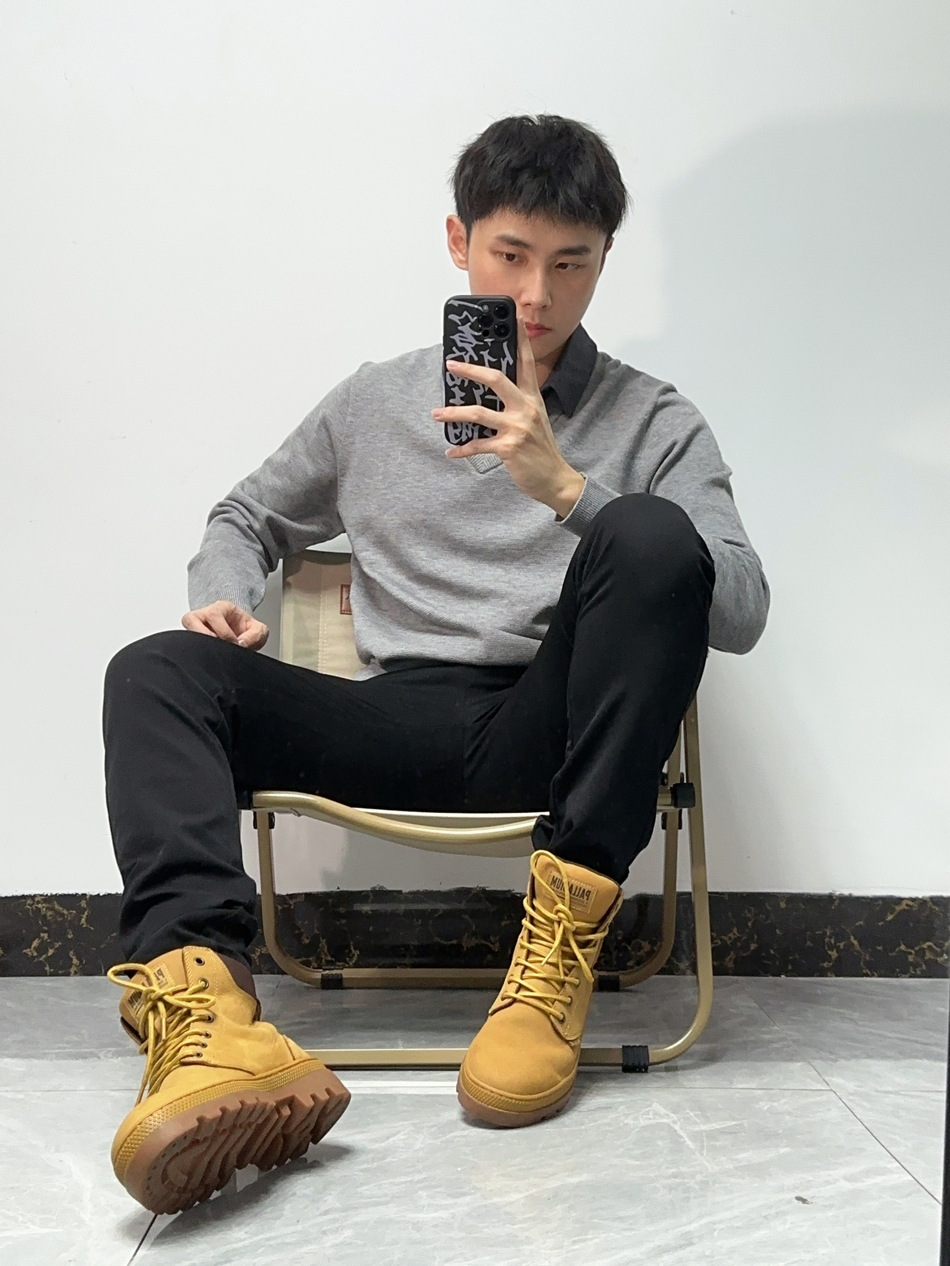 🛬商务风穿搭简单但出彩!很显男人气质,职场穿搭给人稳重的感觉 🛬假两件毛衣polo搭配黑色西裤,再穿上大黄靴,搭配起来很nice,显高又有气质!