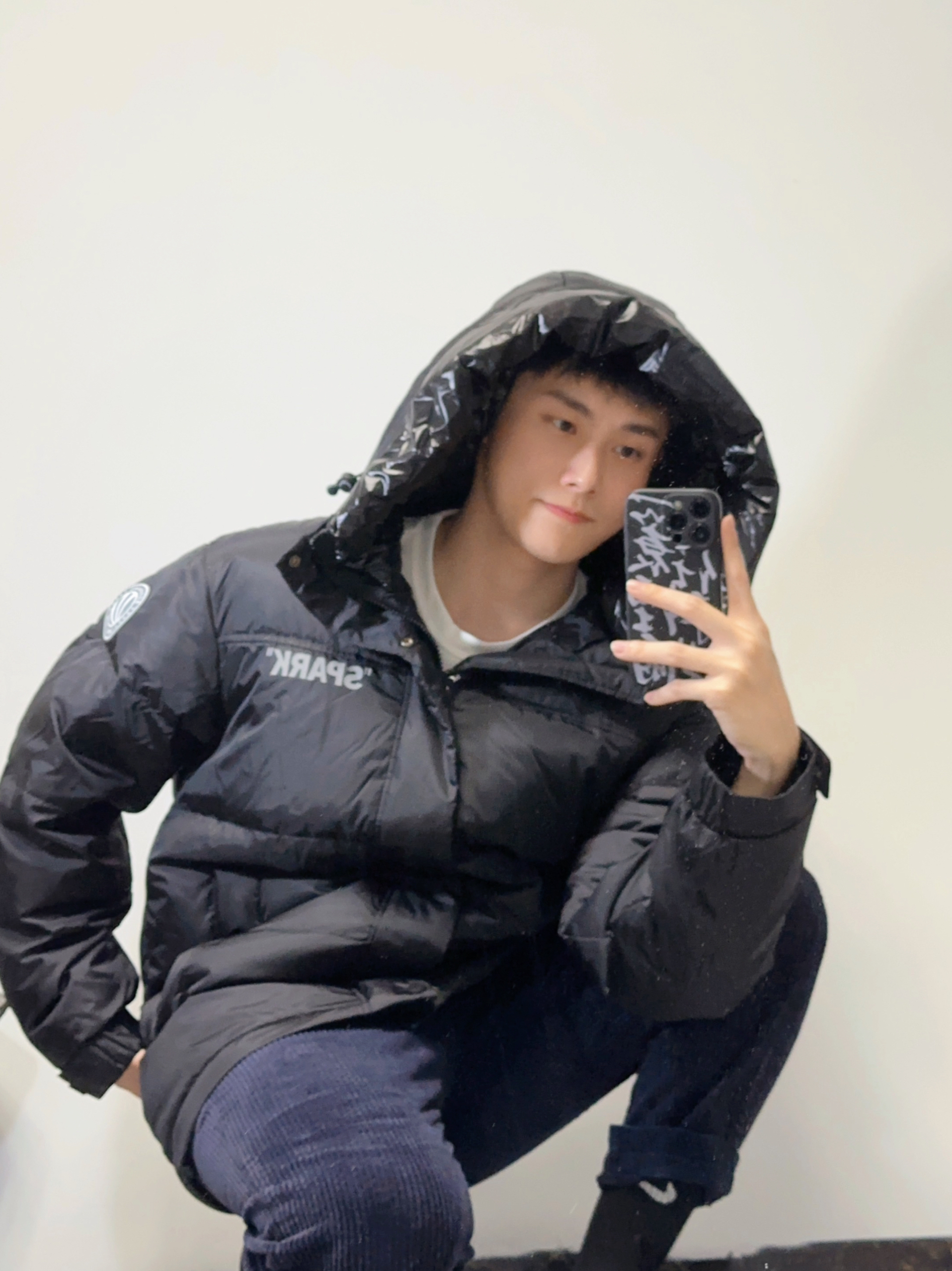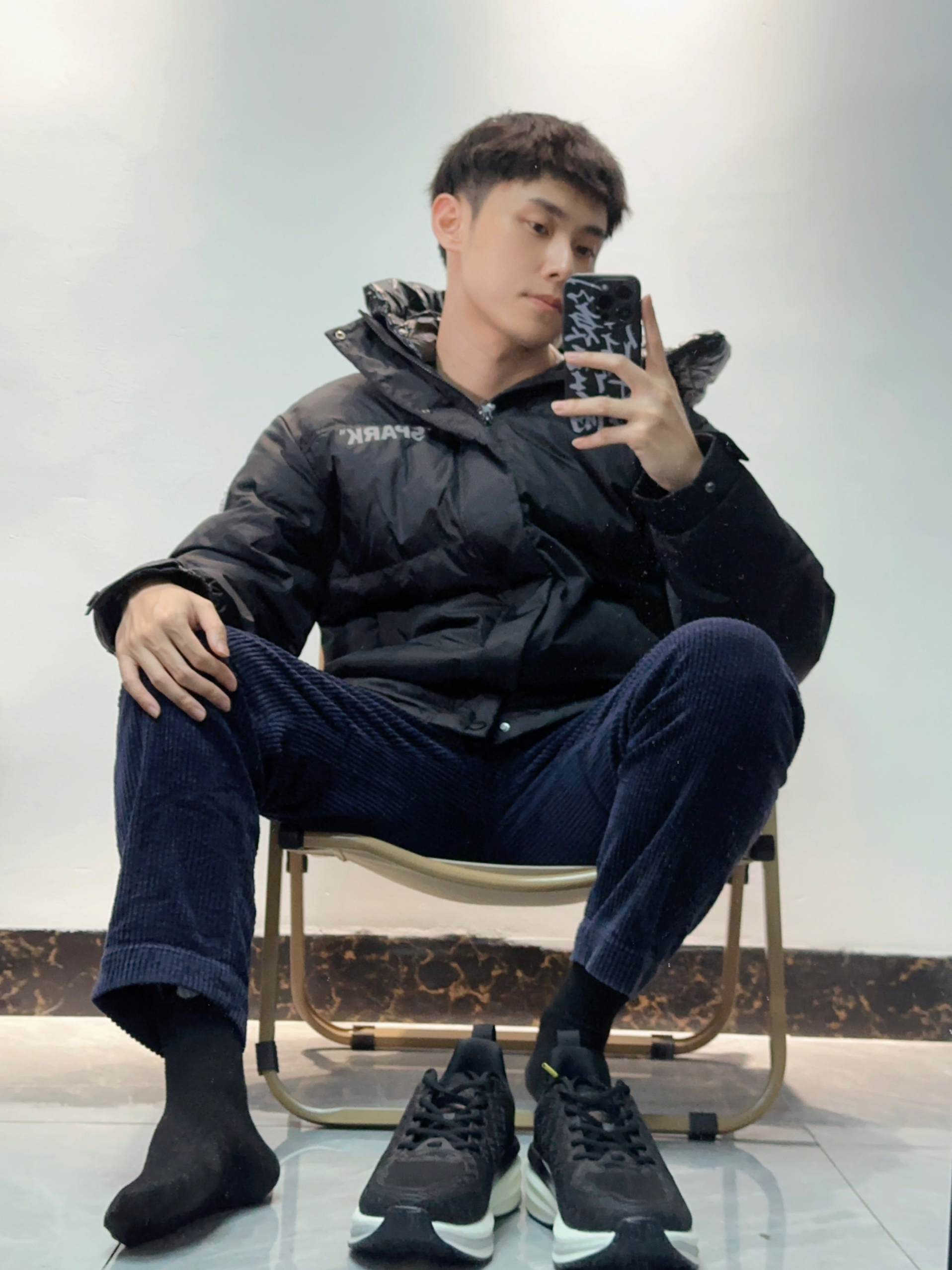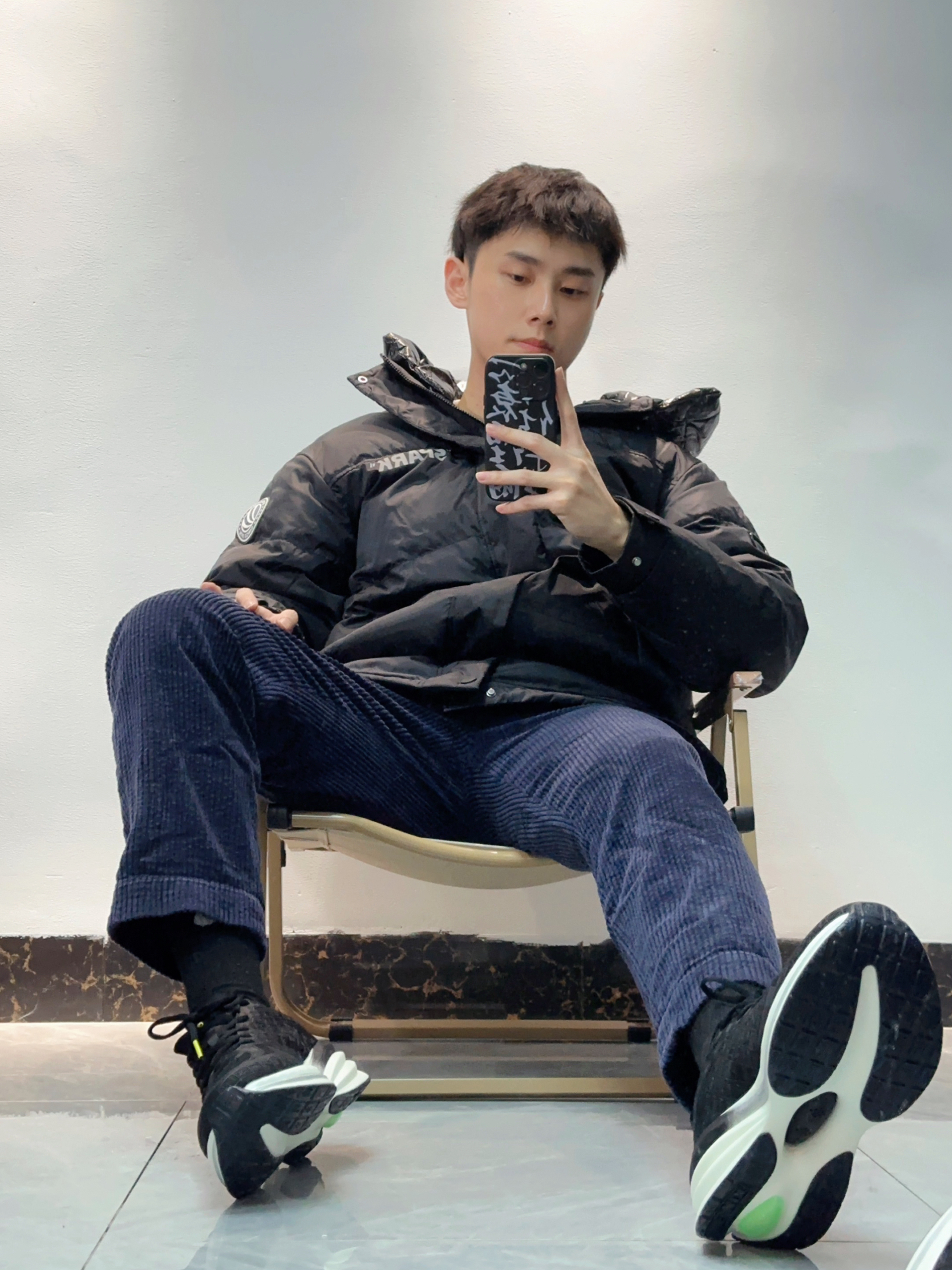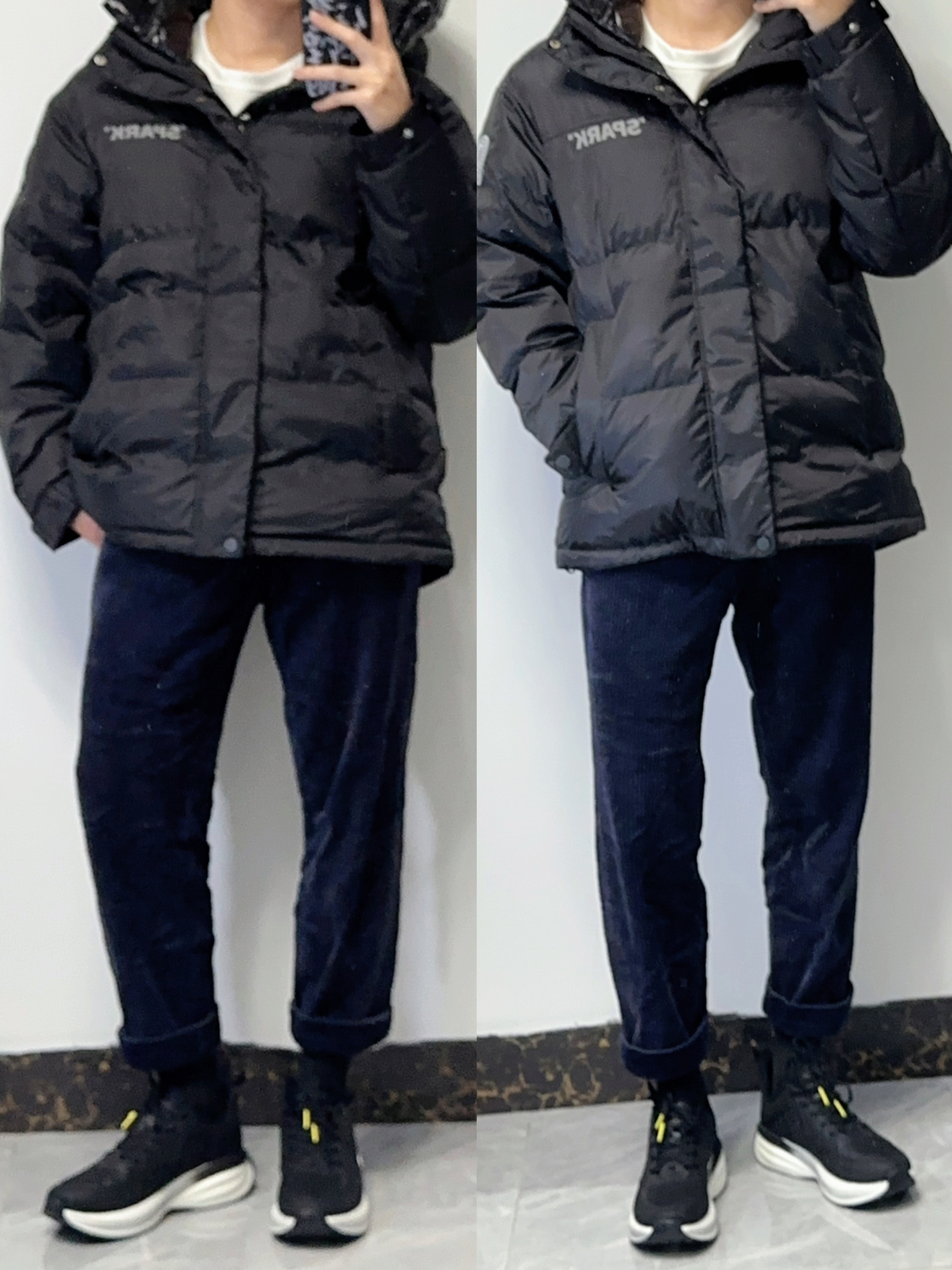👾小个子男生羽绒服还挺难买的,版型不好上身直接把比例拉成五五分!这叫连帽羽绒服就很不错啦!保暖而且也很潮,上身显高! 👾搭配灯芯绒9分裤和黑袜,视觉上也显腿长!小个子学起来