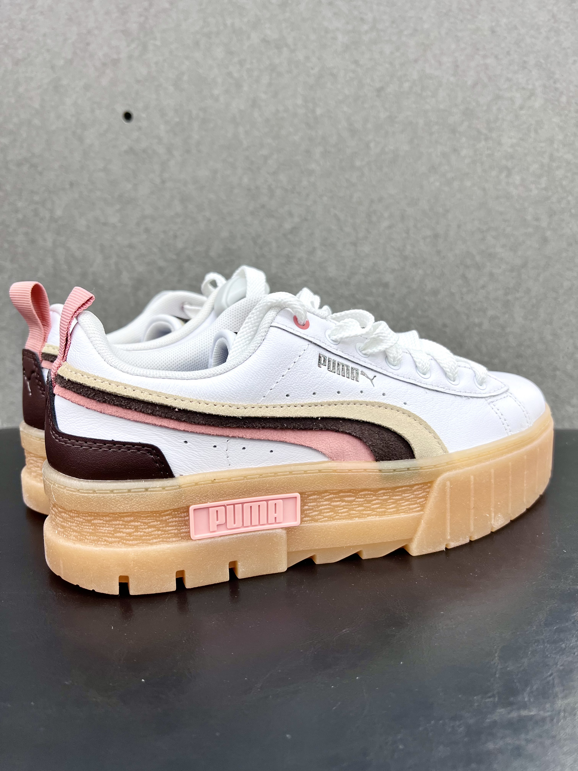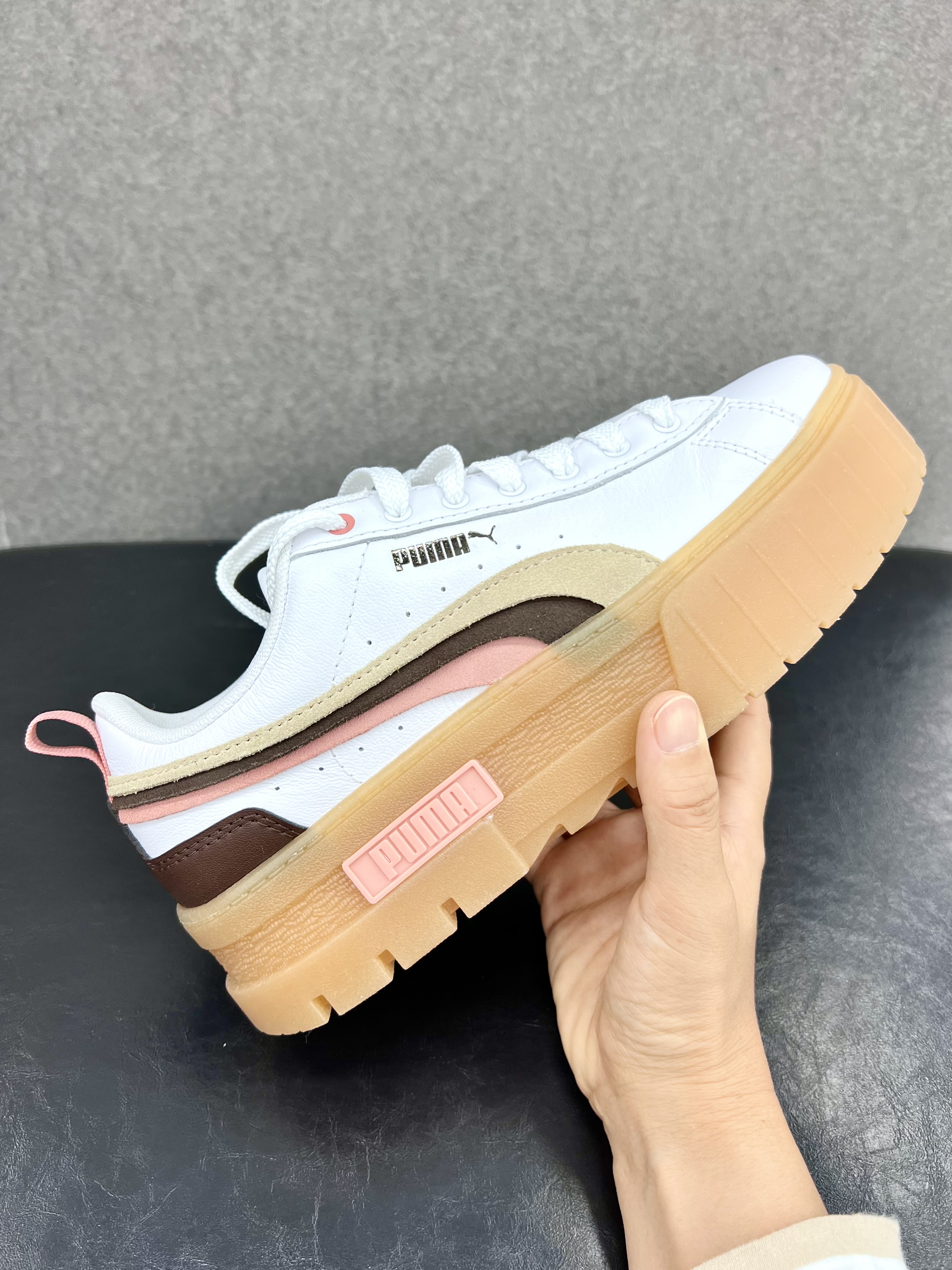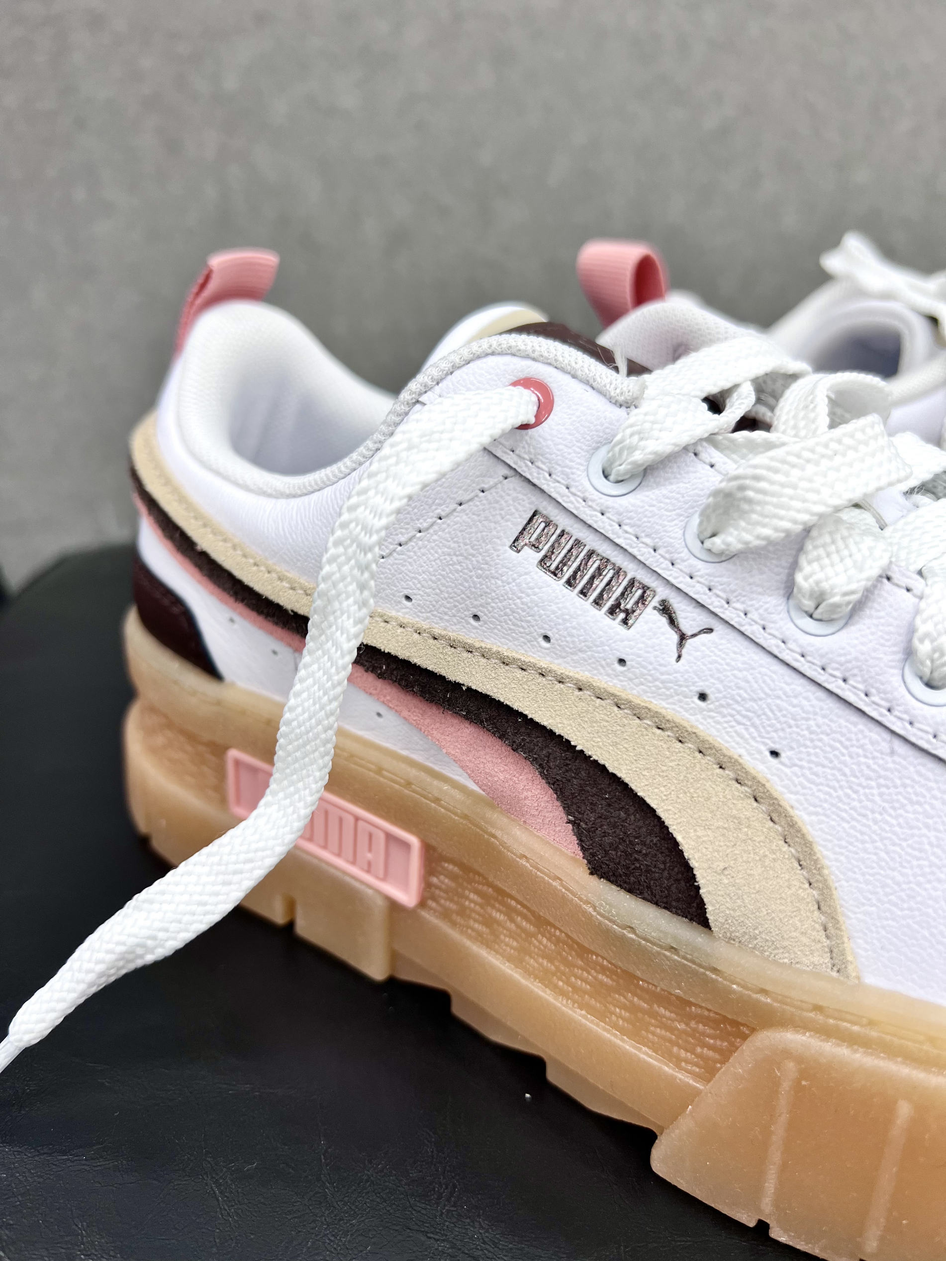 🍀今天开箱一双 Puma Mayze Triplex厚底低帮板鞋,2022年上市,上市价格799,目前200多的价格,女生专属福利👸 🍀设计亮点: 叠层设计的橡胶鞋底,复古又充满时尚气息,防滑耐磨性不错,还有增高效果; 卡其色棕色肉粉色三色拼接绒面革跑道元素,秋冬季正当时的美拉德元素💕 🍀穿搭建议:可爱女生可以穿双米色毛线长筒袜,搭配秋冬短裙,美拉德的感觉就来咯🌟