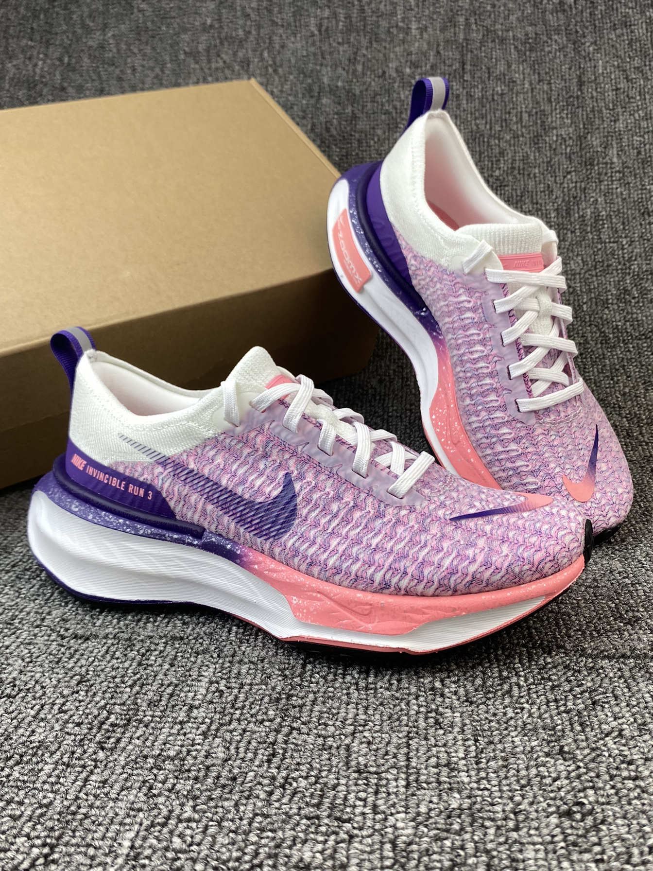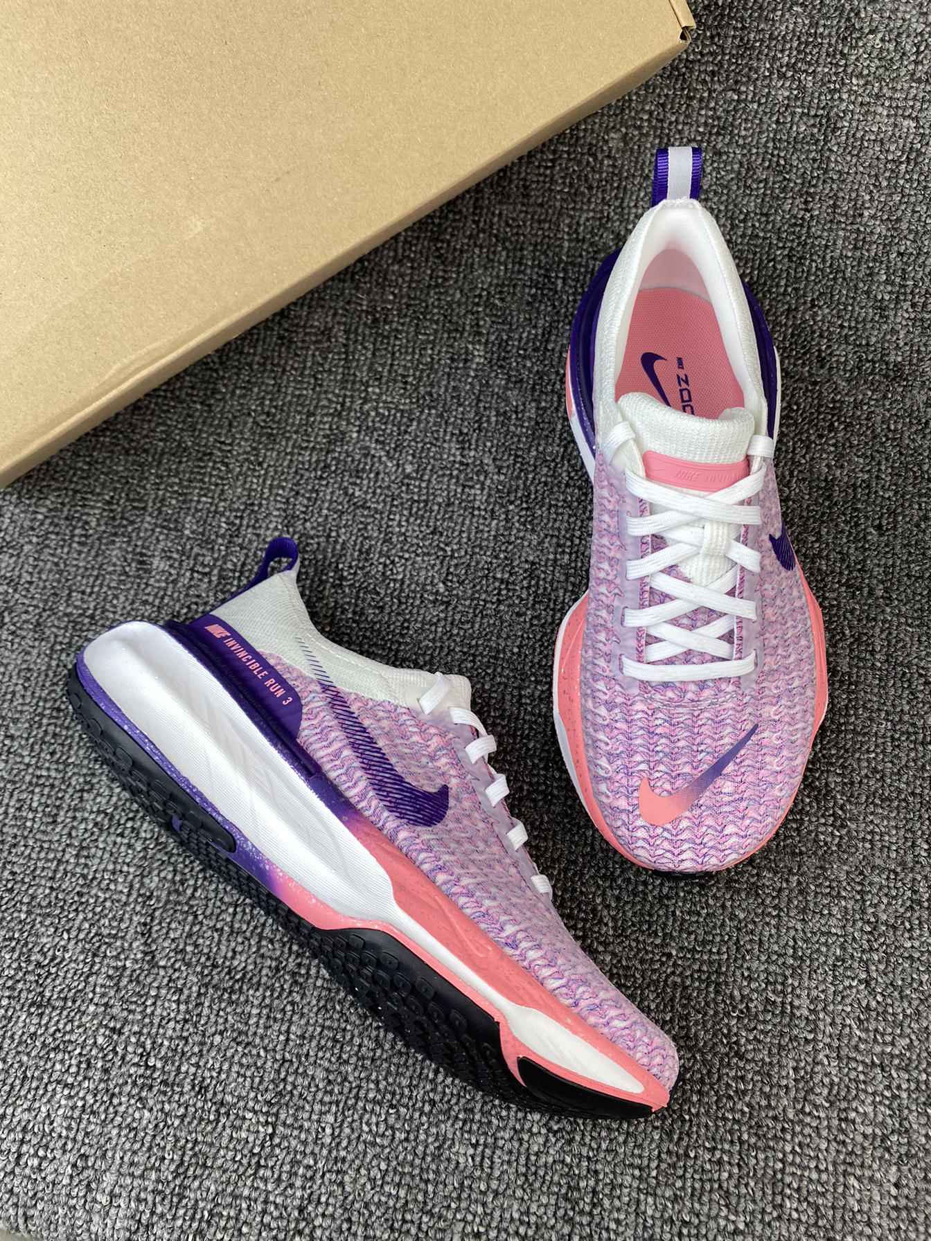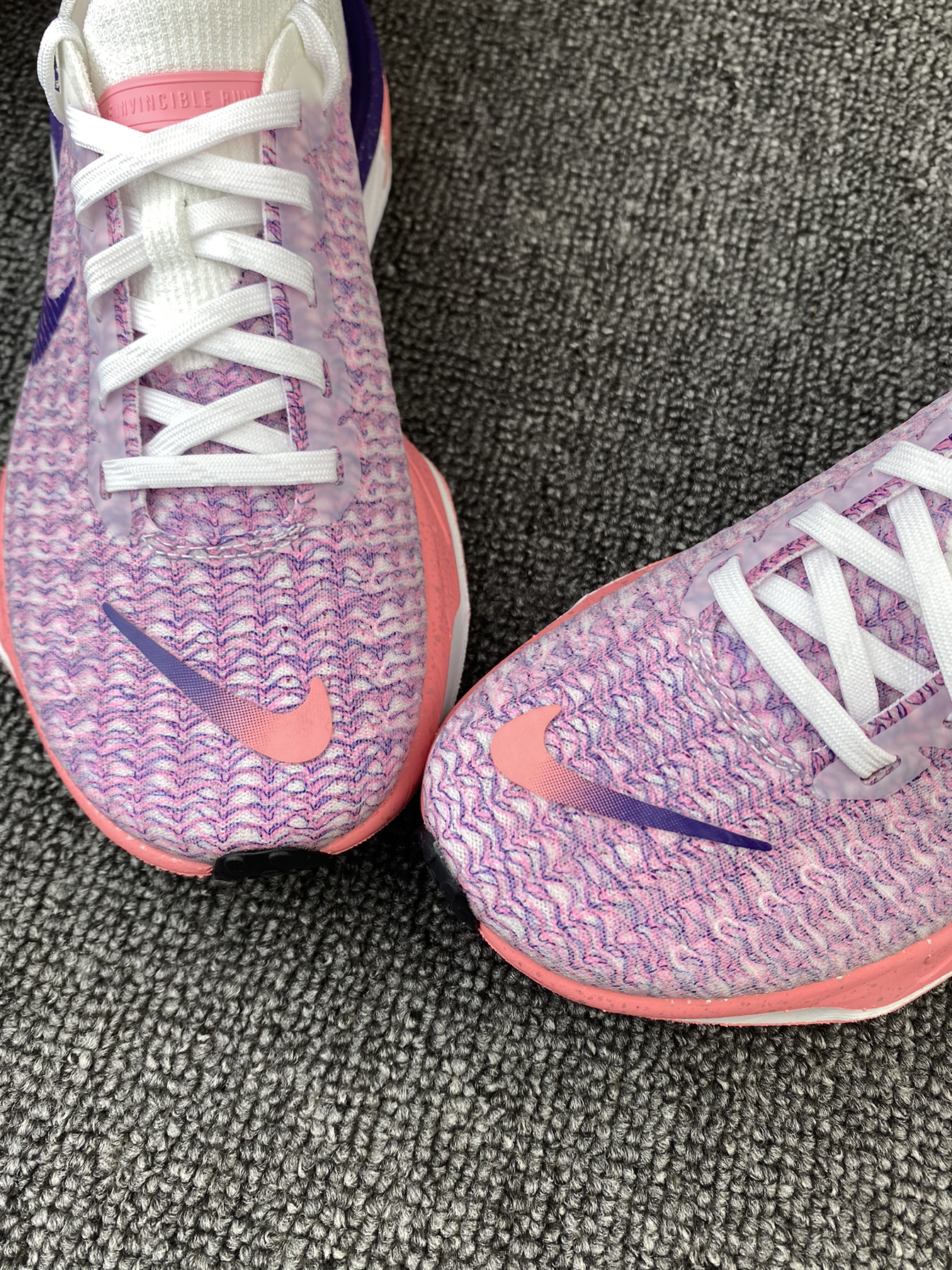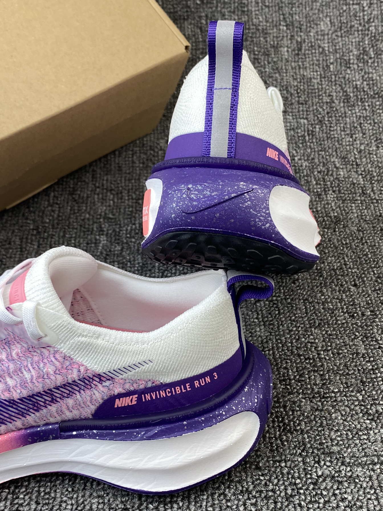 👟Nike Invinble 3 跑鞋 ✨鞋子整体以粉紫色为主,很鲜艳的色调,加上白色的搭配,干净又亮眼。而且后跟部分还有布灵布灵的夜空点缀,很有个性。 🌸Flykint鞋面支撑感很好,加上厚实的ZoomX泡棉材质,整体的脚感很舒适轻盈。后跟处还有加厚的海绵填充,很好的保护了脚后跟部分。 🌟这系列跑鞋整体的表现一直不错,通勤、运动、体测等都是不错的!而且这个配色女孩子穿真的太可爱啦!