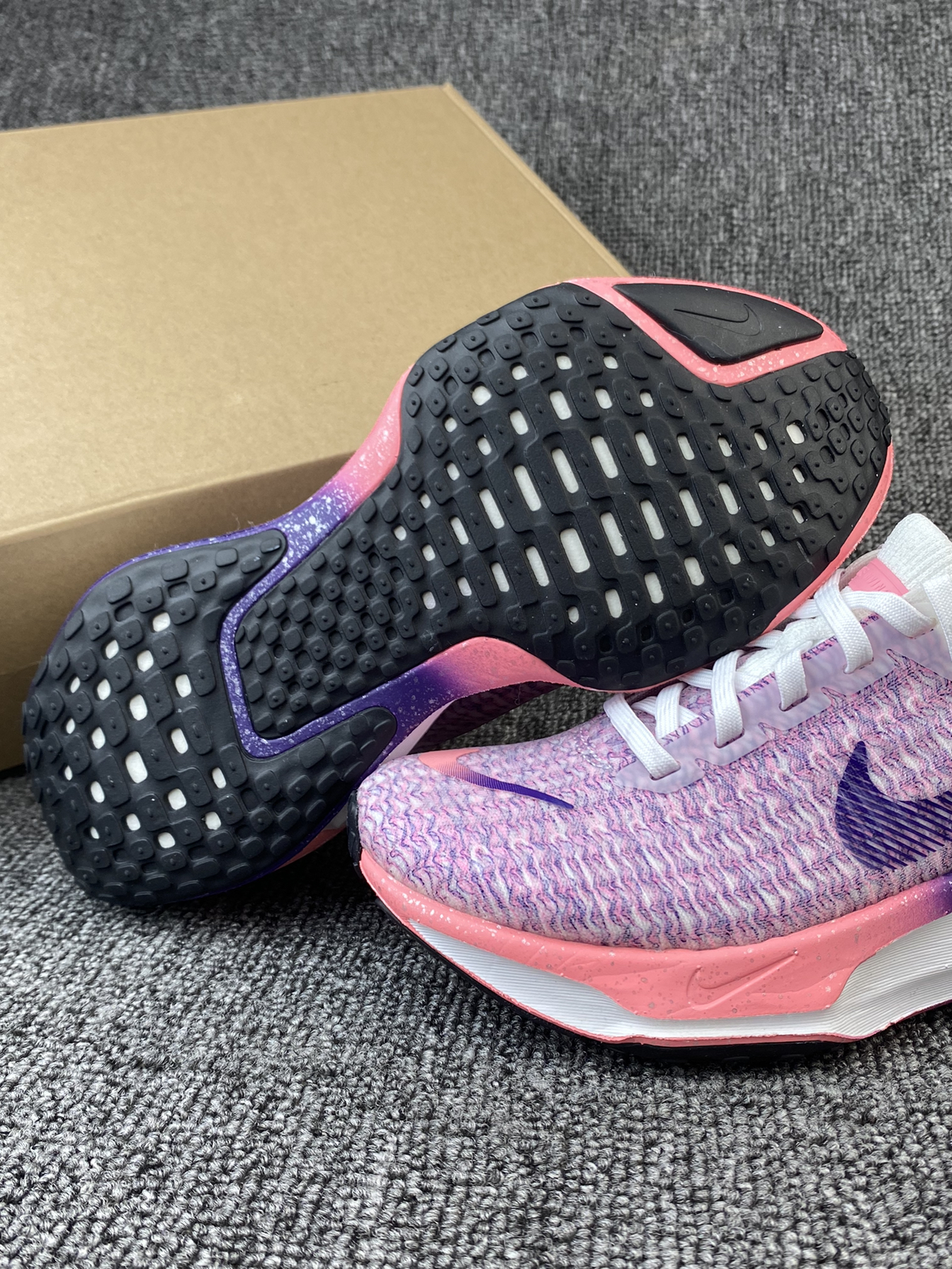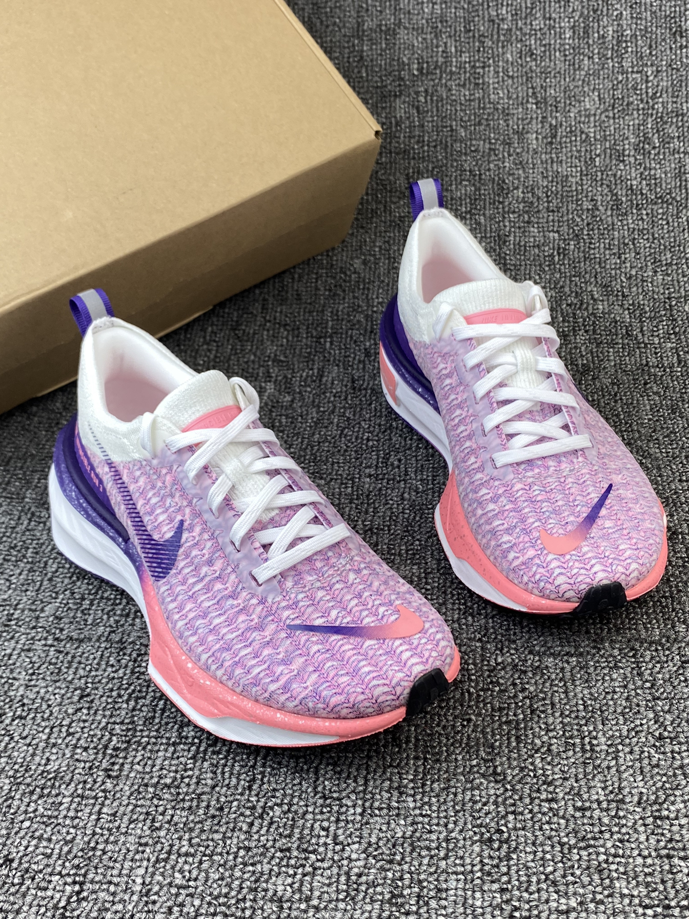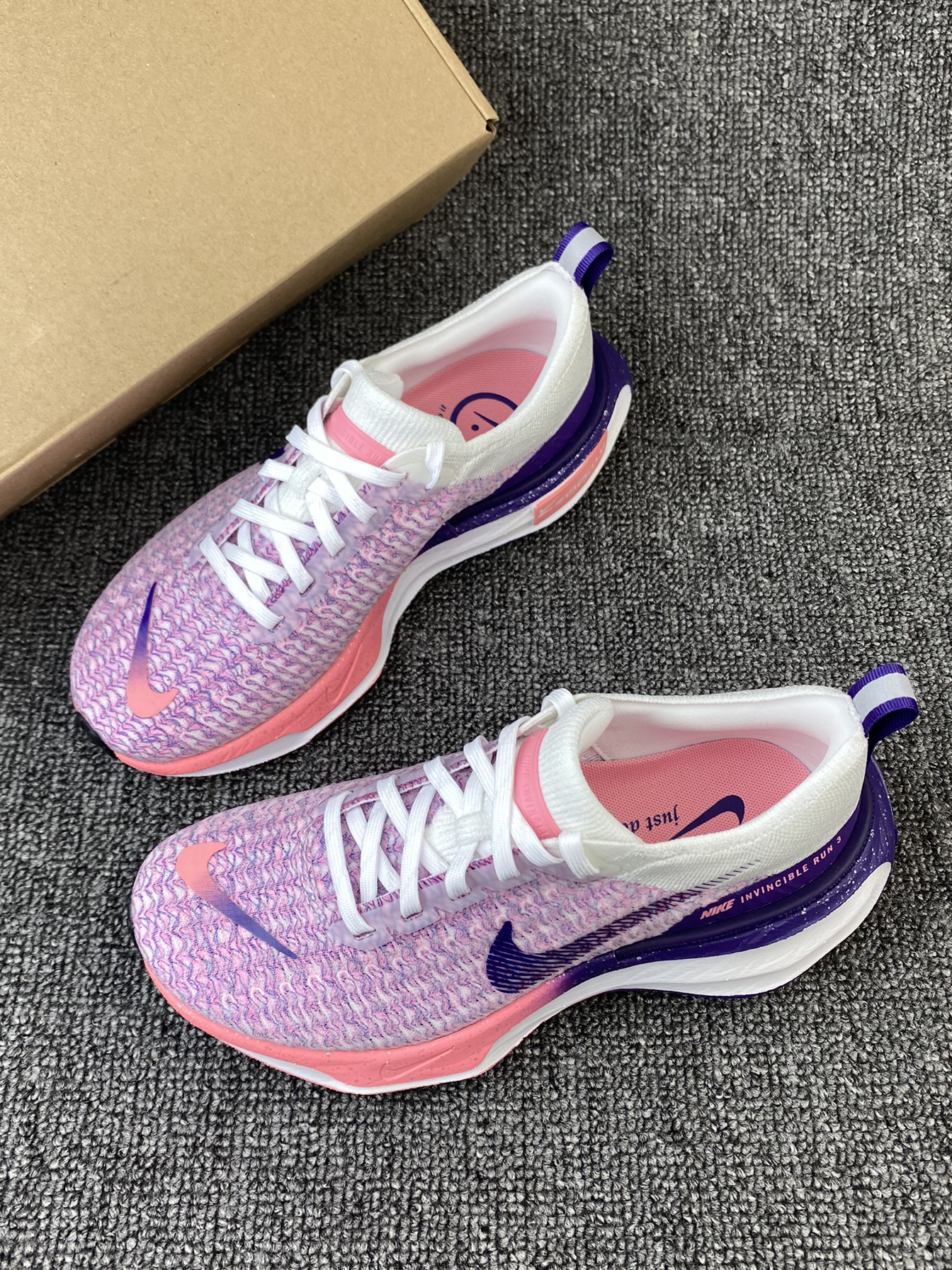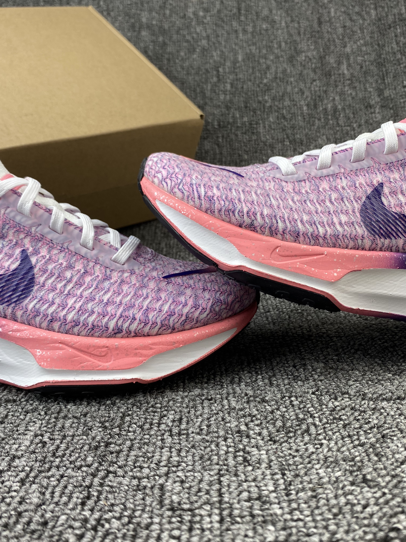 👟Nike Invinble 3 跑鞋 ✨鞋子整体以粉紫色为主,很鲜艳的色调,加上白色的搭配,干净又亮眼。而且后跟部分还有布灵布灵的夜空点缀,很有个性。 🌸Flykint鞋面支撑感很好,加上厚实的ZoomX泡棉材质,整体的脚感很舒适轻盈。后跟处还有加厚的海绵填充,很好的保护了脚后跟部分。 🌟这系列跑鞋整体的表现一直不错,通勤、运动、体测等都是不错的!而且这个配色女孩子穿真的太可爱啦!