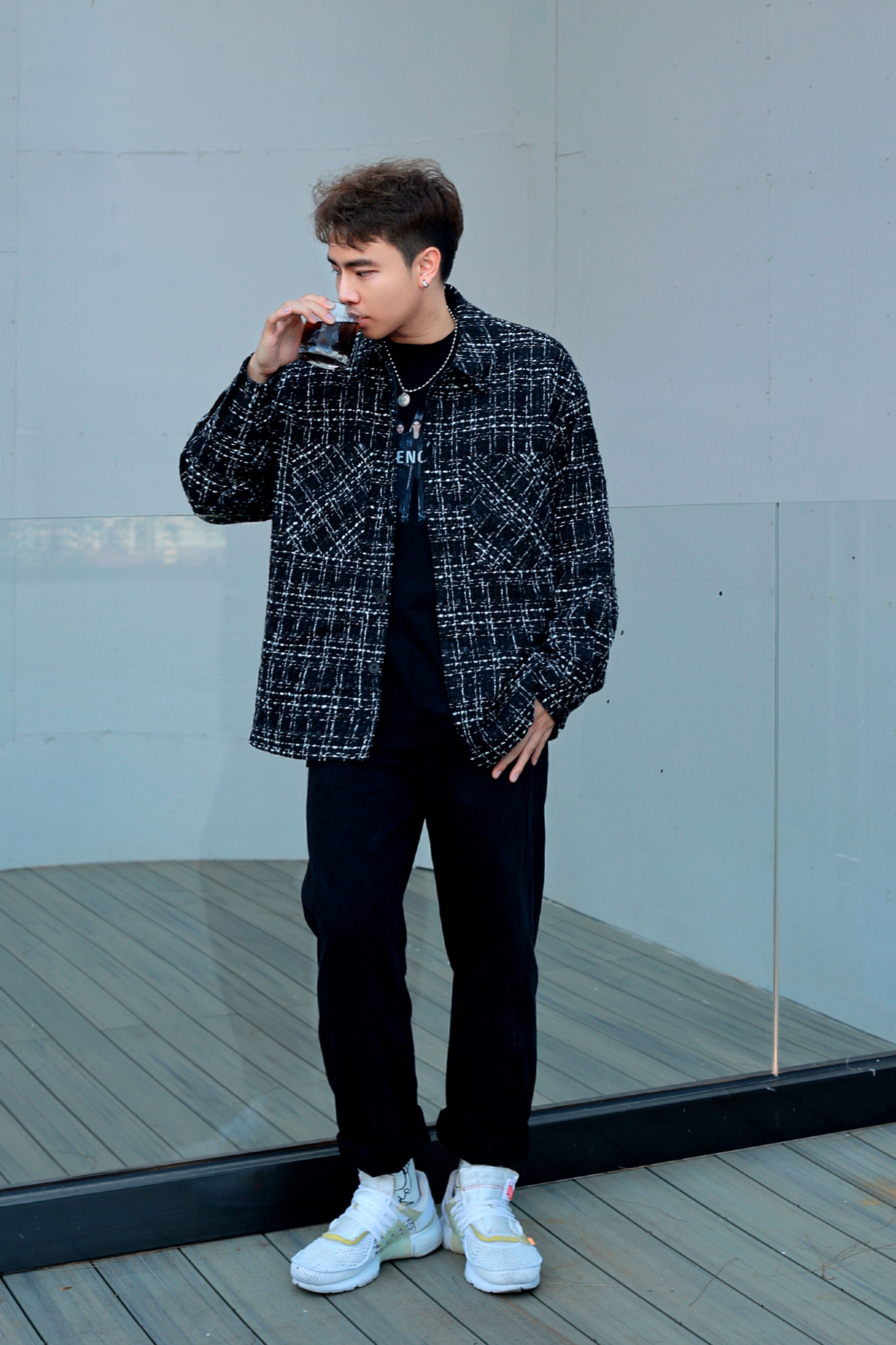 现在天气一下雨就变的凉飕飕的,秋天真的已经来啦,今天带来一套走斯文人的穿搭 上半身是一件 GXG 小香风的设计风格外套,而且长度不会很长街头风格,显得气质,厚度在秋天穿刚刚好,上身效果真d挺好看的,很能衬托气质斯文 下半身是一条黑色拼接做旧休闲纯棉牛仔裤,我喜欢把裤脚折起来,这样会让我这整套穿搭更加的干净利落,也符合穿搭风格,整体非常统一