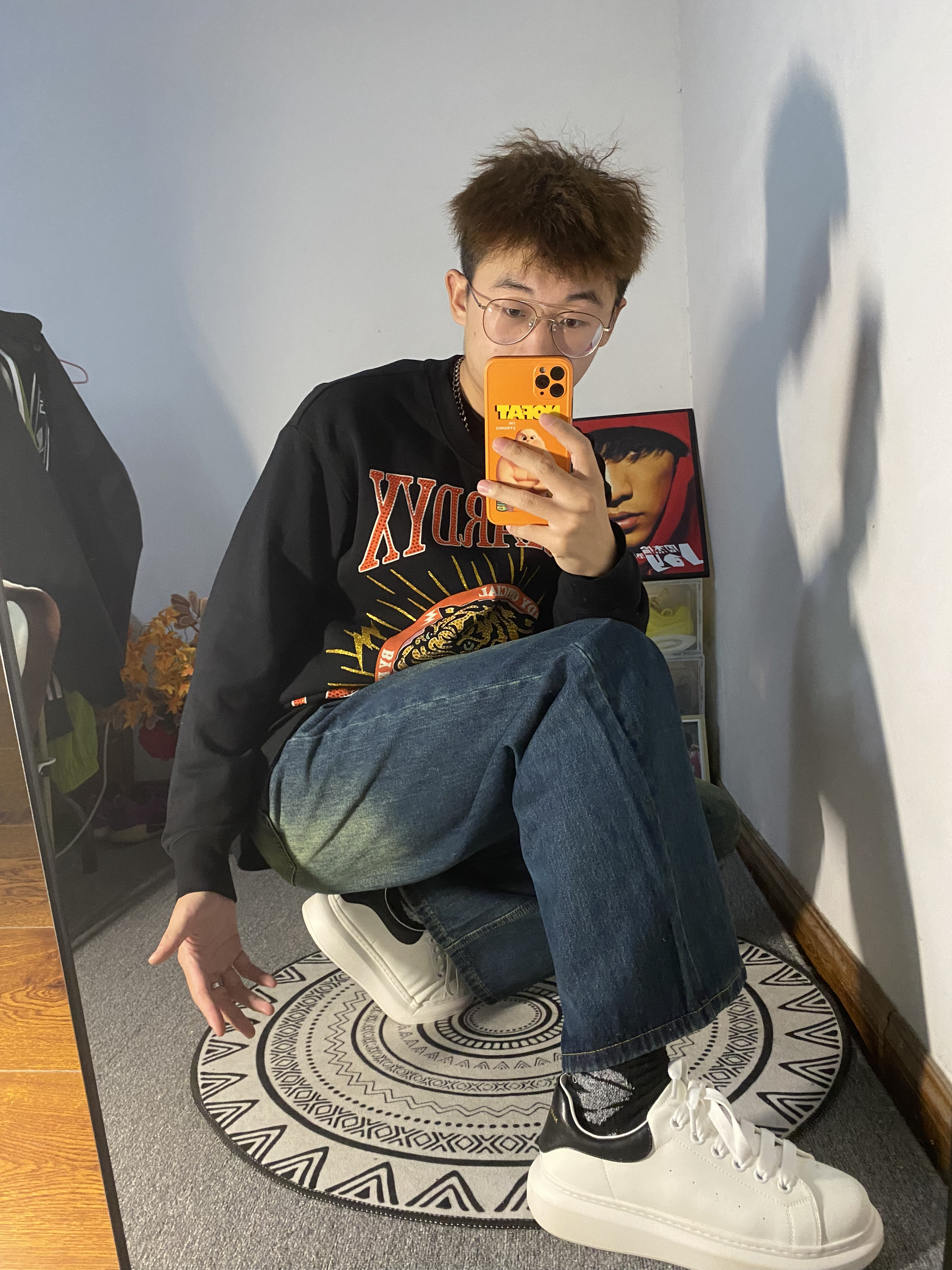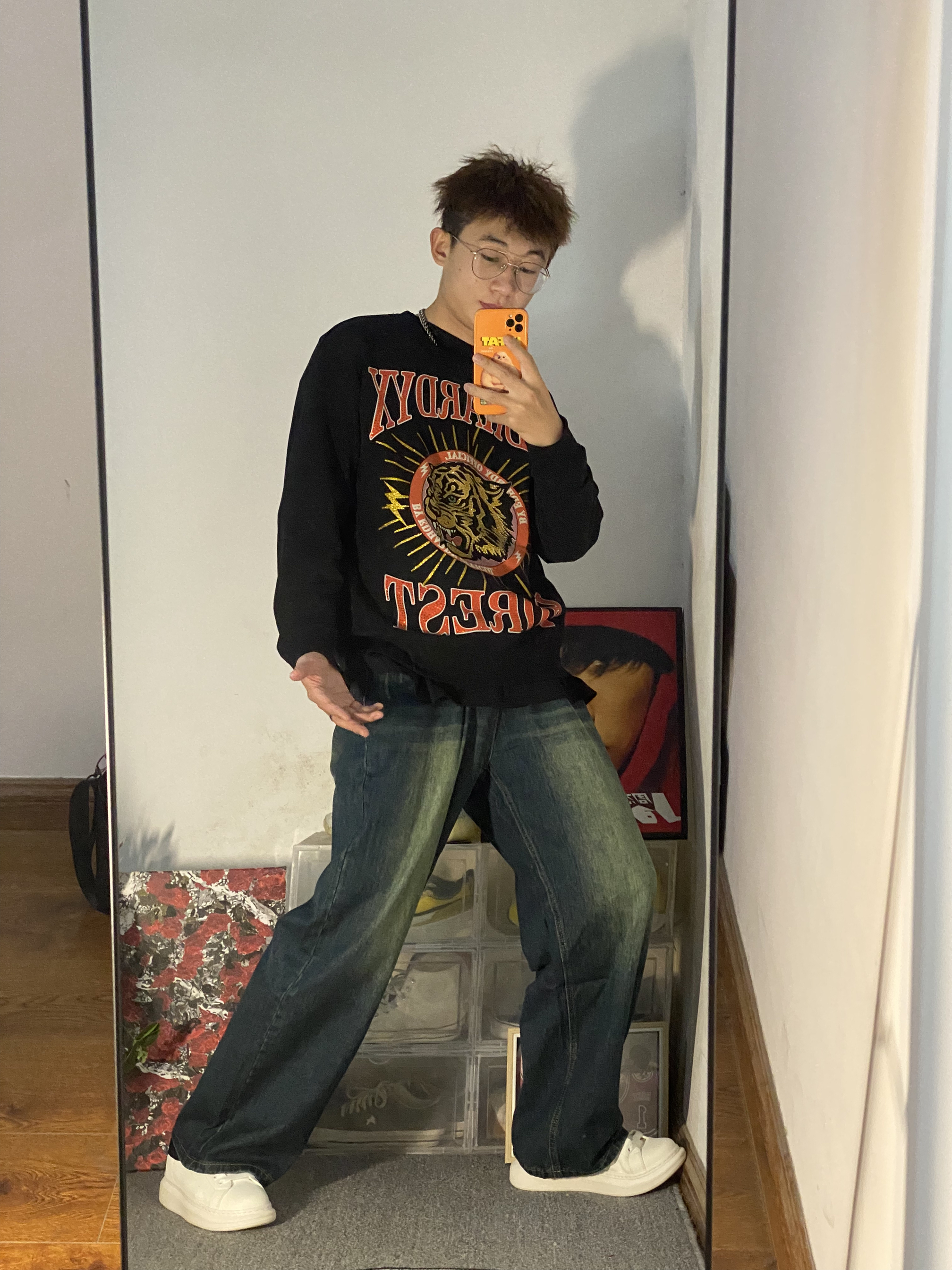 🌟今日冰美式穿搭分享 秋冬季节到了天气渐渐变冷牛仔裤也该安排上啦🔥 👔一件黑色印花圆领长袖T恤 胸前带钻虎头Logo设计时尚百搭 版型是我喜欢的偏宽松类型 — 👖裤子是一条复古风水洗宽松直筒牛仔裤🙈 也是我最近穿的比较多的一条牛仔裤 复古的风格真的百搭 直筒裤的设计又能很好的修饰腿形🌟 — 👟鞋子也是我这几天爱穿的百搭小白鞋款 牛皮鞋身也不怕鞋脏轻轻的擦一擦就能擦掉🌟 身高/体重:178/130...