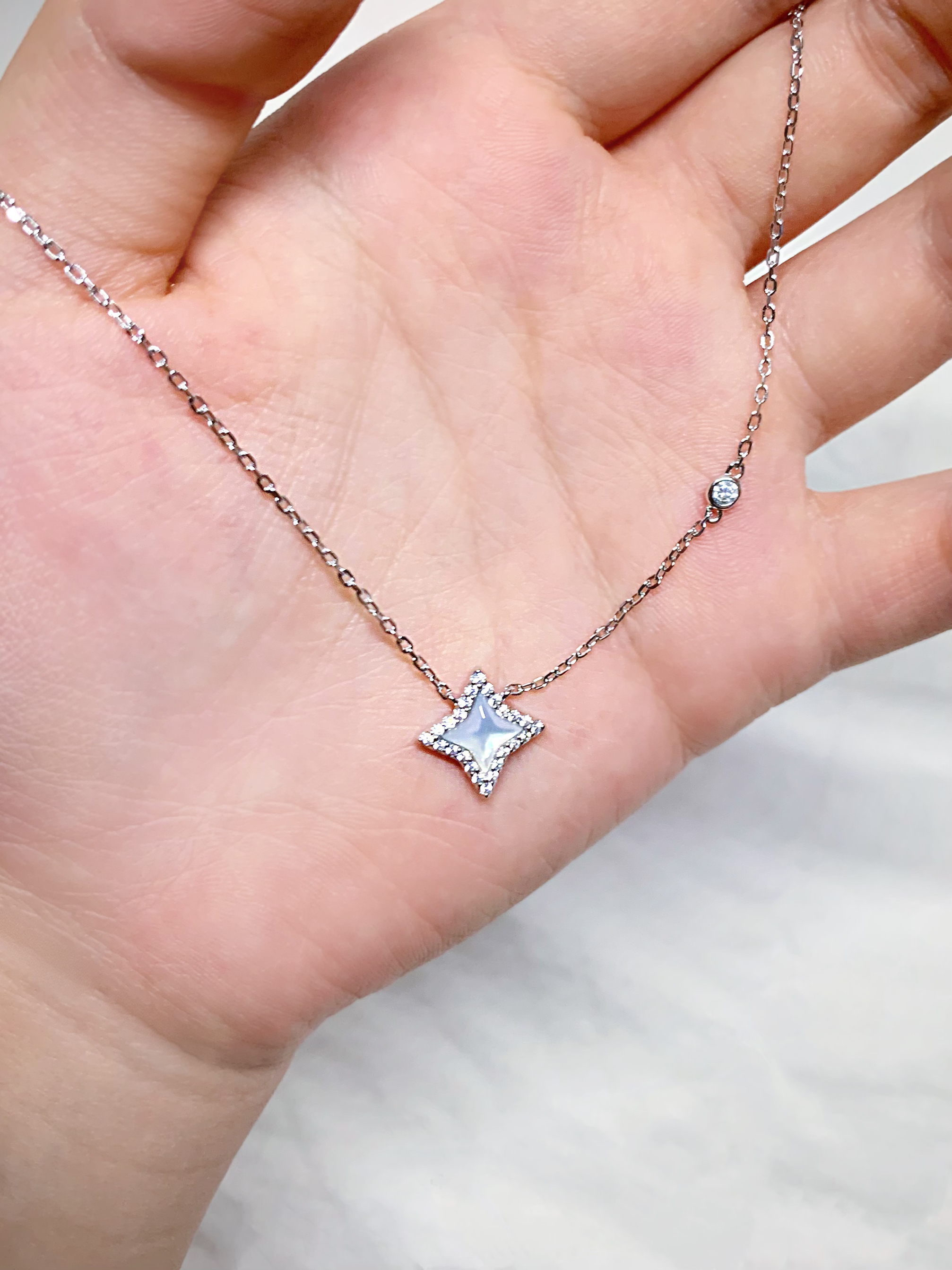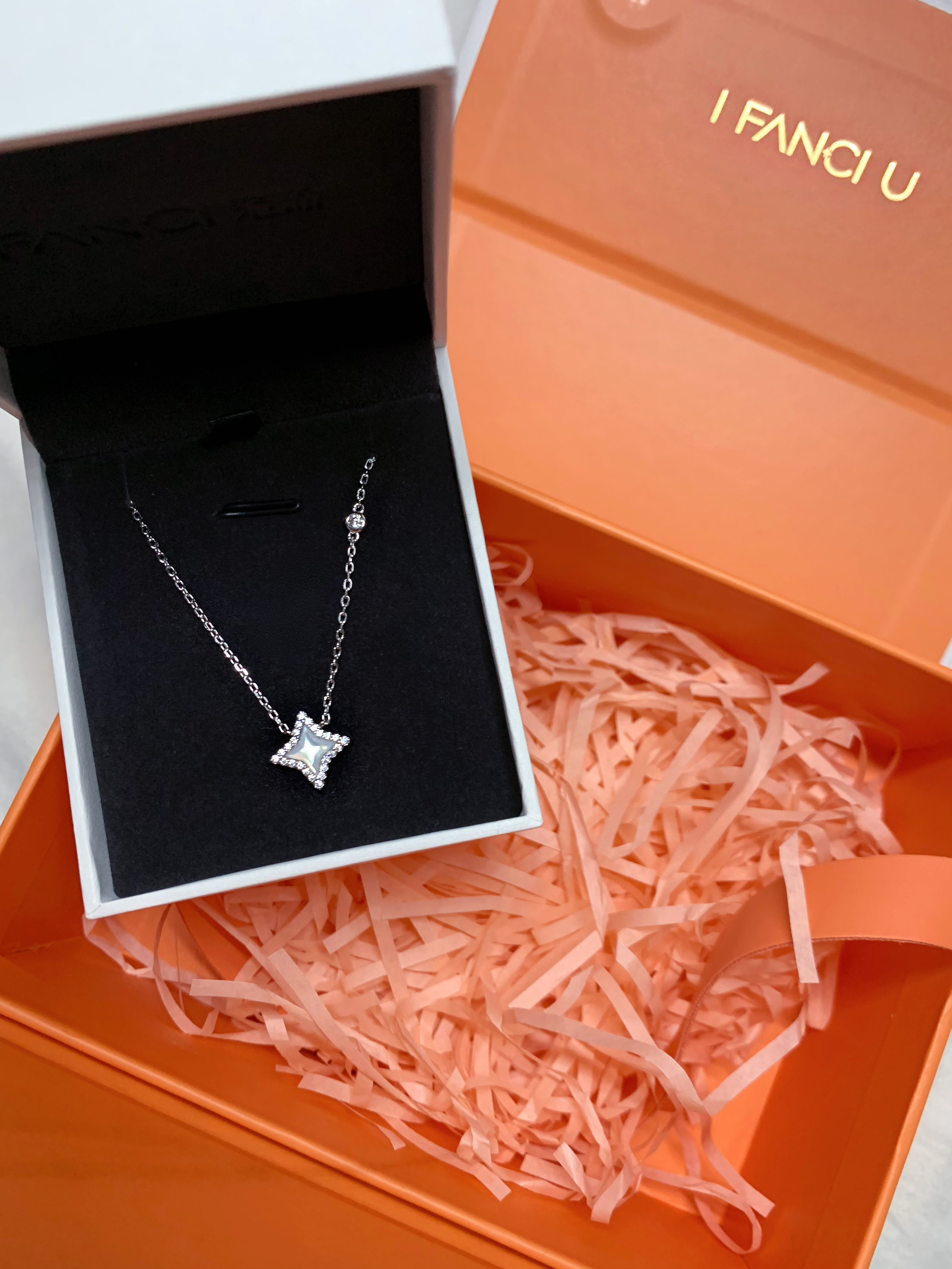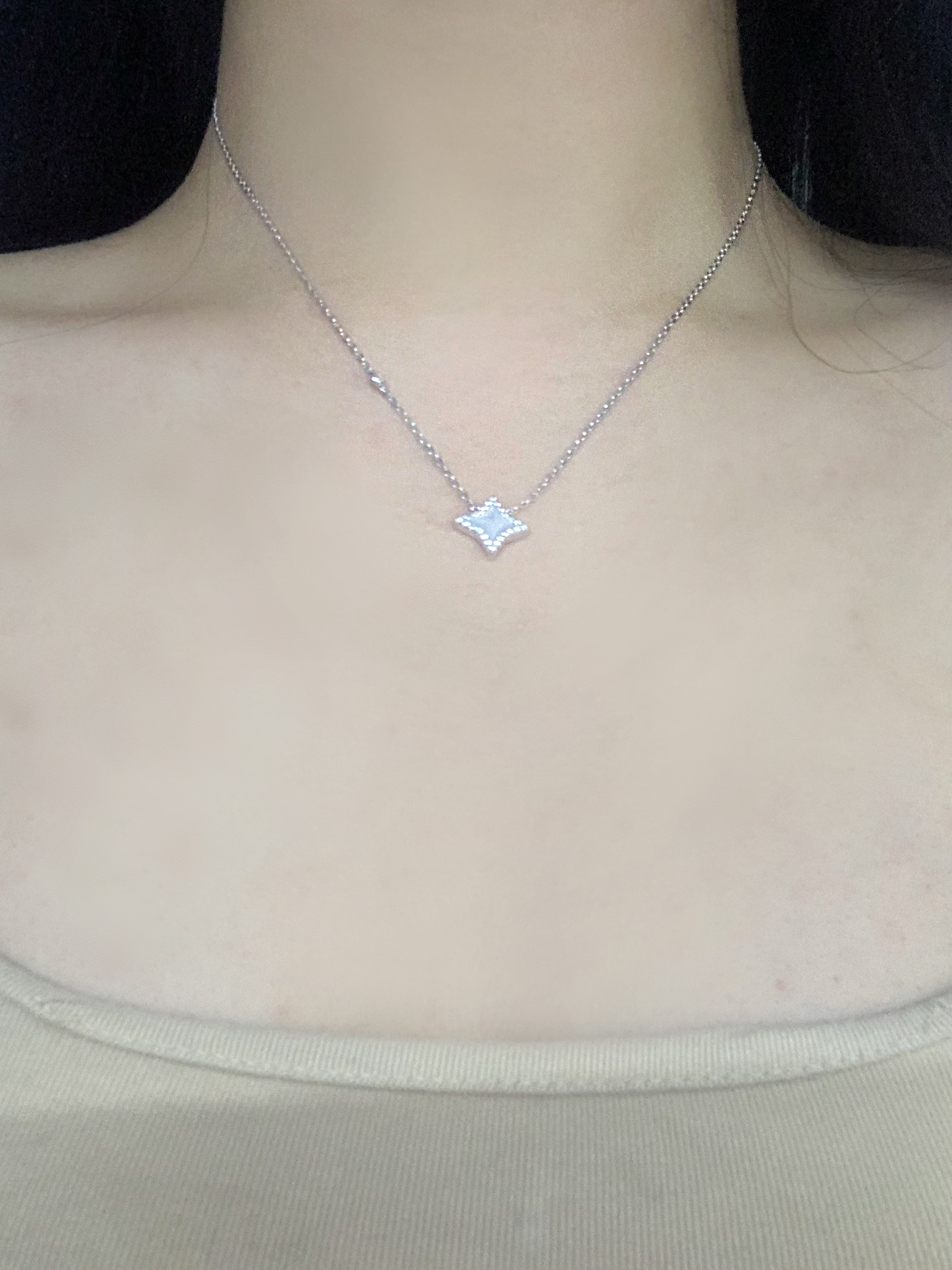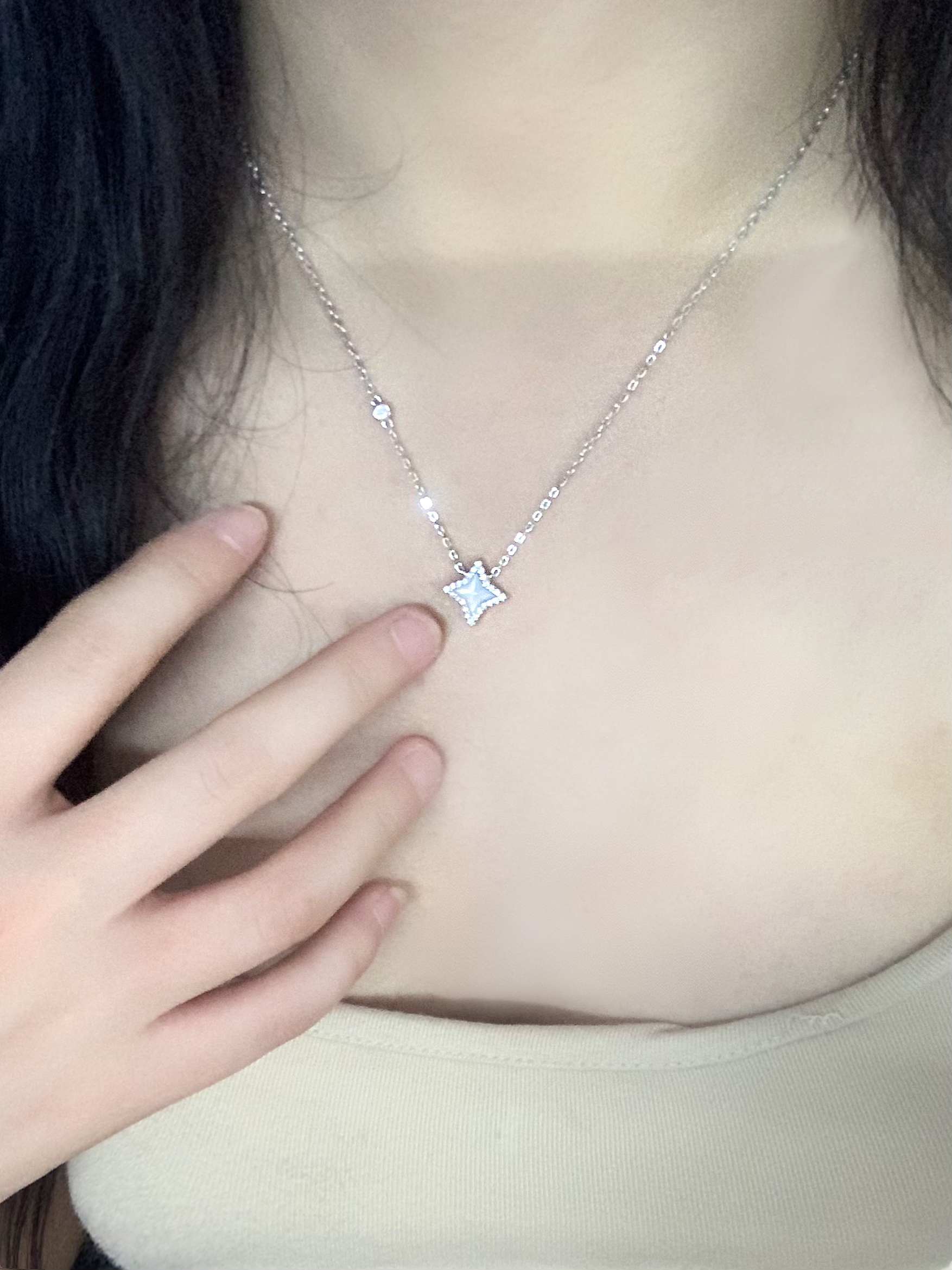 生日收到朋友送的项链,第一眼就被惊喜到了,因为真的太美啦! 四芒星🌟的造型,镶嵌着纯白母贝和欧泊石,看起来bling bling 的,超级好看! 特别是在有光的地方,会变得特别闪,亮晶晶的,让人挪不开眼~ 材质是s925 银的,戴起来很有质感,不容易过敏。拍照也很有氛围感,我朋友说真的很好看! 包装礼盒🎁也蛮精致的,很适合拿来送人,很有质感,看起来很高级。
