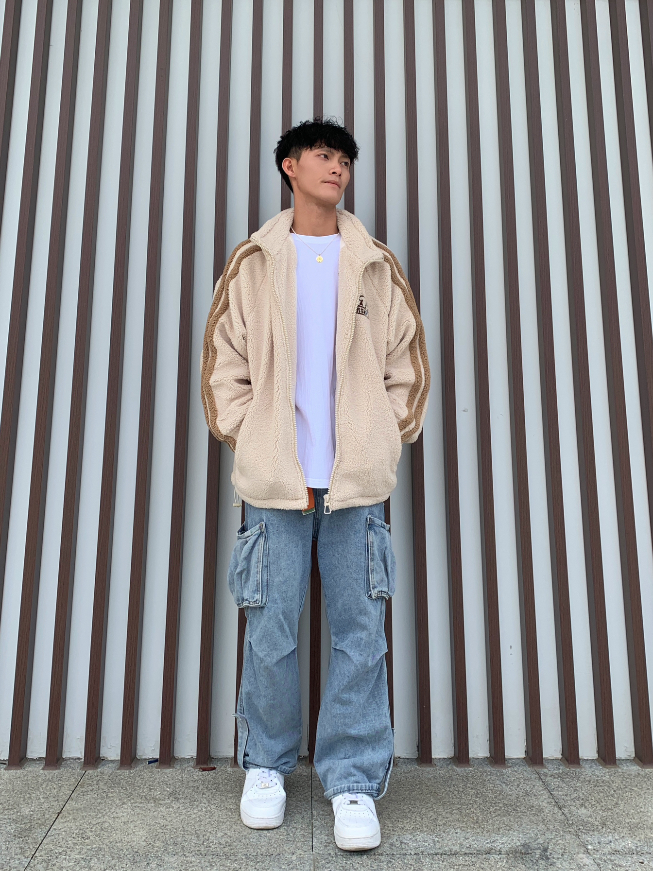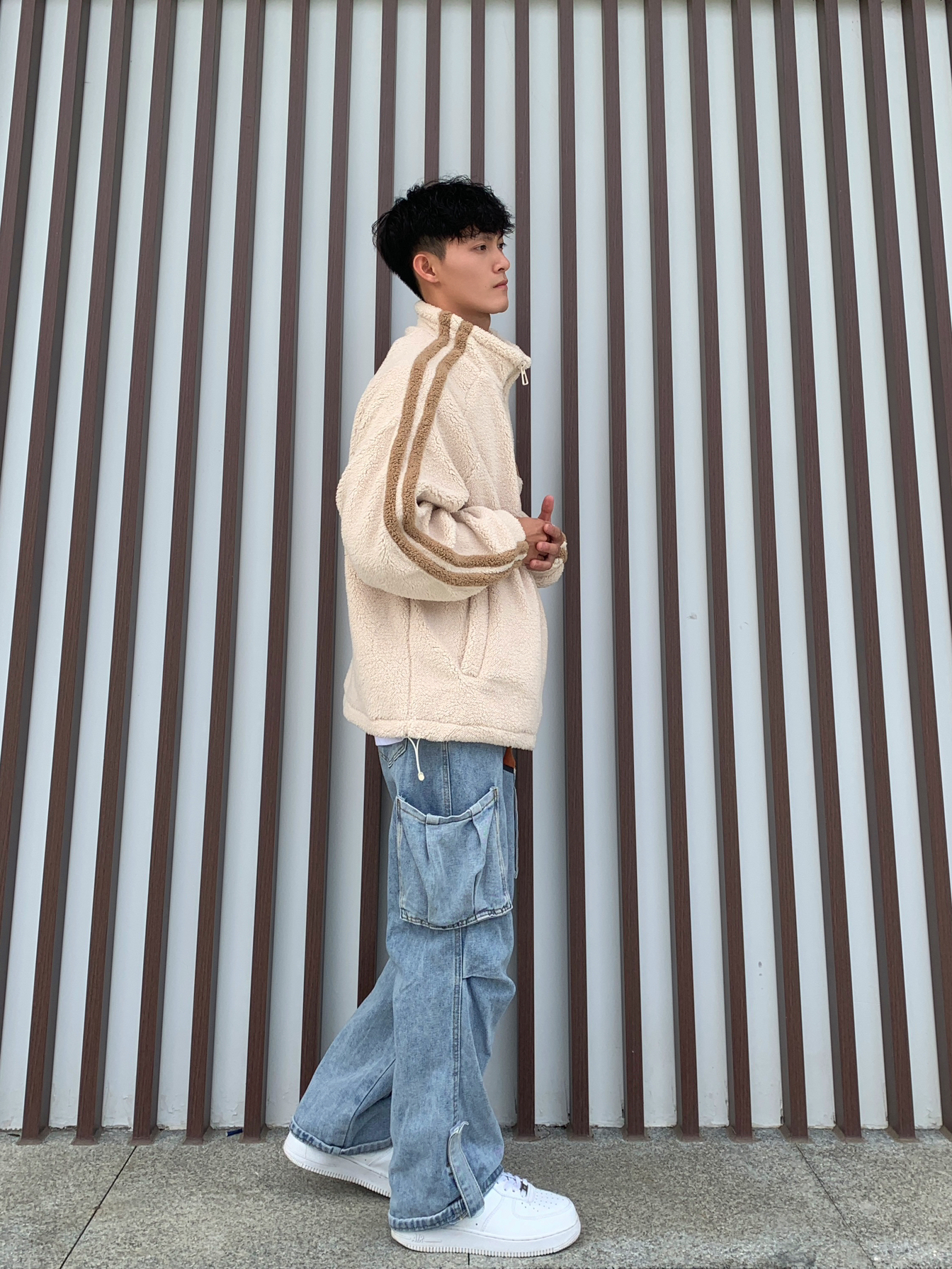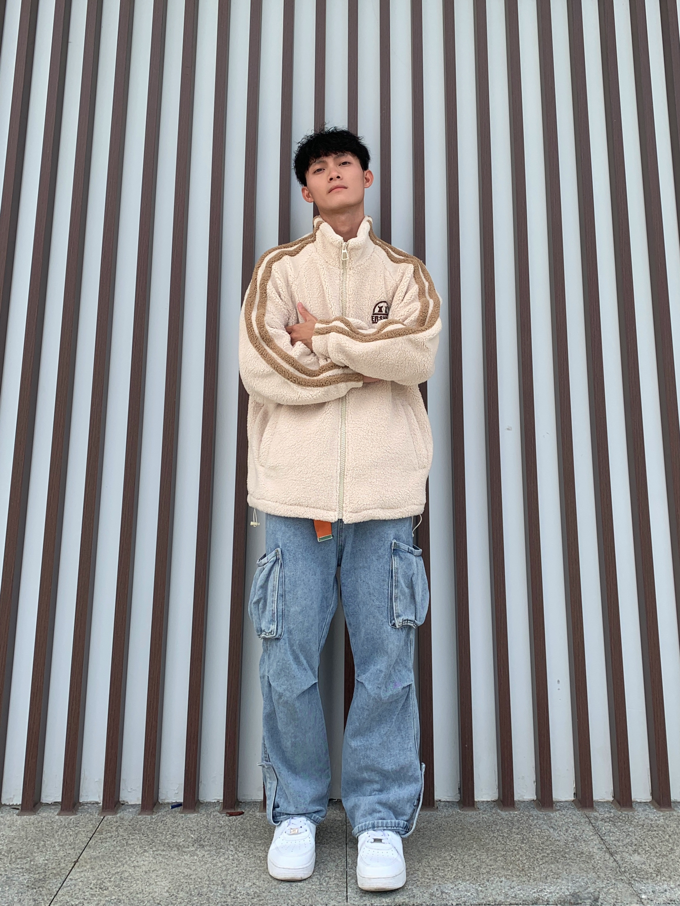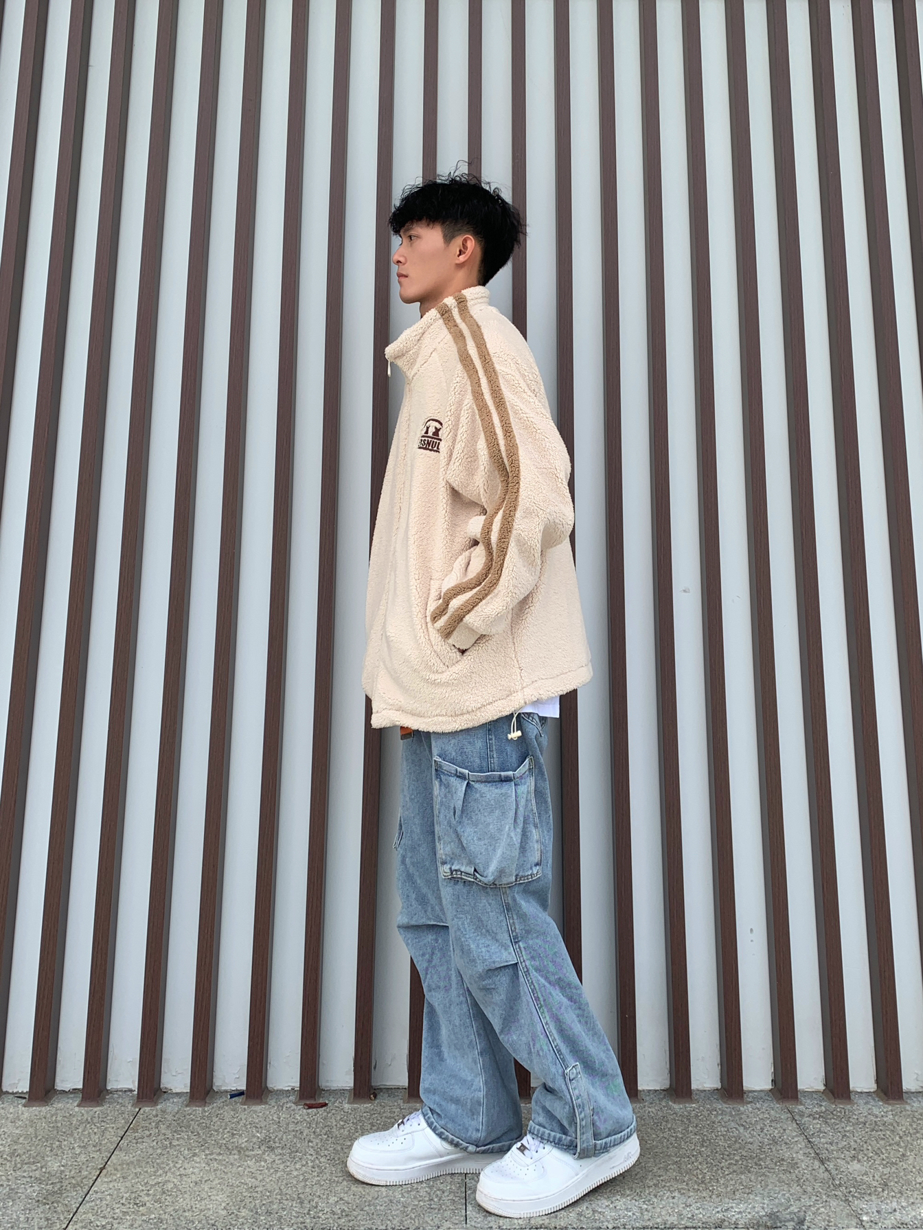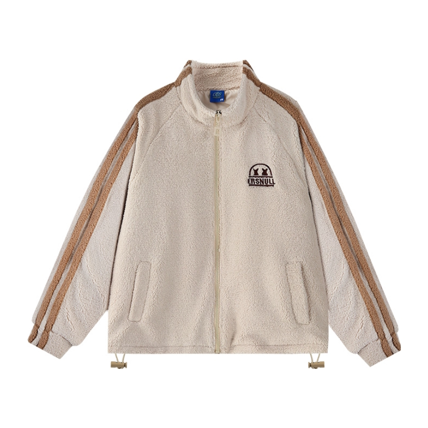 ⏳秋冬氛围感穿搭,怎么能少得了羊羔毛外套🧐 💁🏽♂️身高170|180 体重55|60接可驾驭🫵🏻 📸杏色美式条纹Logo宽松休闲羊羔毛绒感外套➕蓝色直筒宽松牛仔裤✅ — — — — — — — — — — — — — — — — — — 1️⃣👔 🧩ER的男女同款杏色美式条纹Logo宽松休闲羊羔毛绒感外套,宽松休闲不挑身材与简约中加点美式感,上身效果非常的显肩宽又大气,而且还带点高街风格,更...