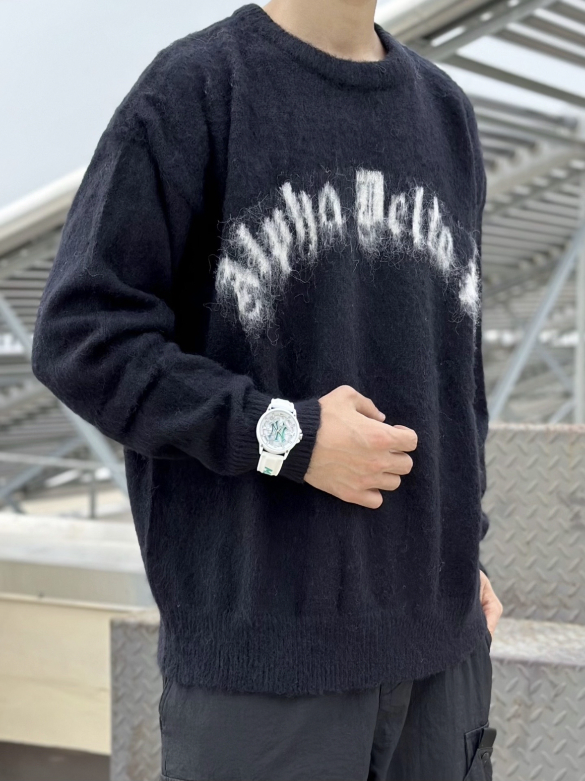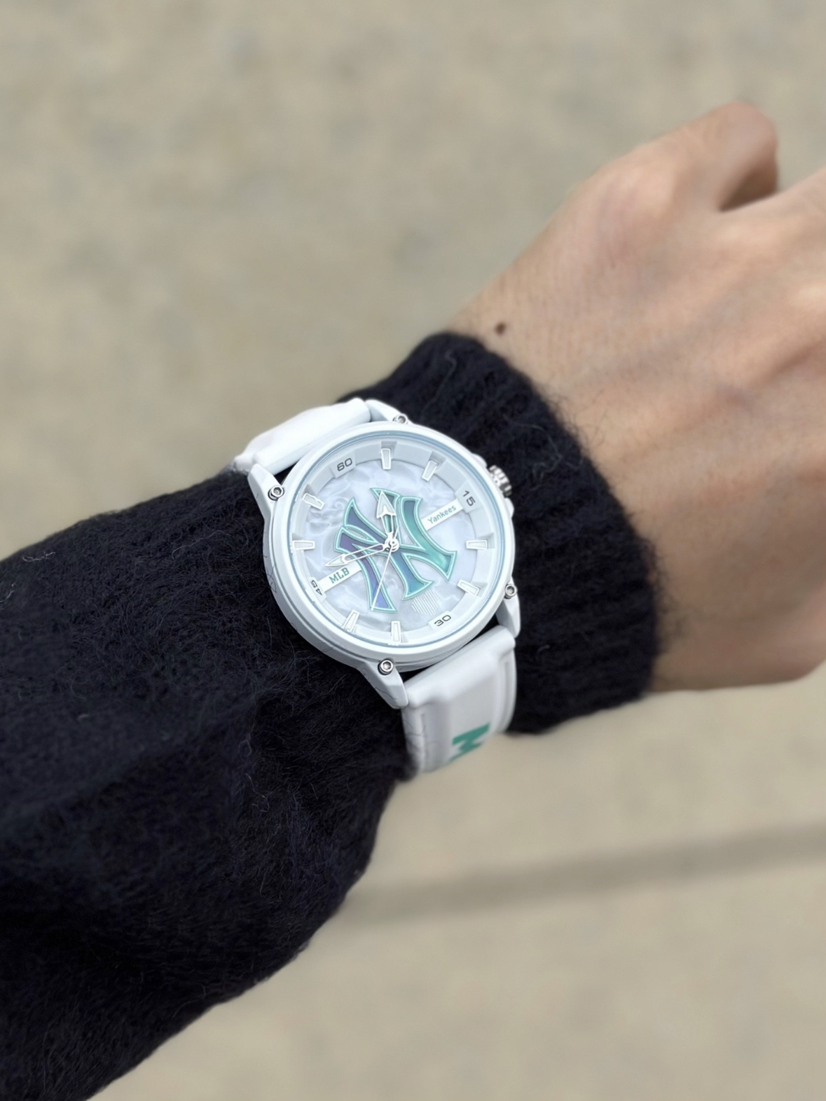 太喜欢在秋天这种清凉的天气穿毛衣了 毛绒绒的触感带来暖暖的感觉 黑色毛衣超级好搭配 白色提花设计 哥特体的英文设计 街头感太酷啦 秋天的穿搭 自然也少不了一块好看的手表 MLB 的颜值我太喜欢咯 很好看 白色和清新的绿色搭配 就够与众不同 白色的手表怎么搭配都很出彩 正好和我今天黑白配的衣服也很搭 安排就对了