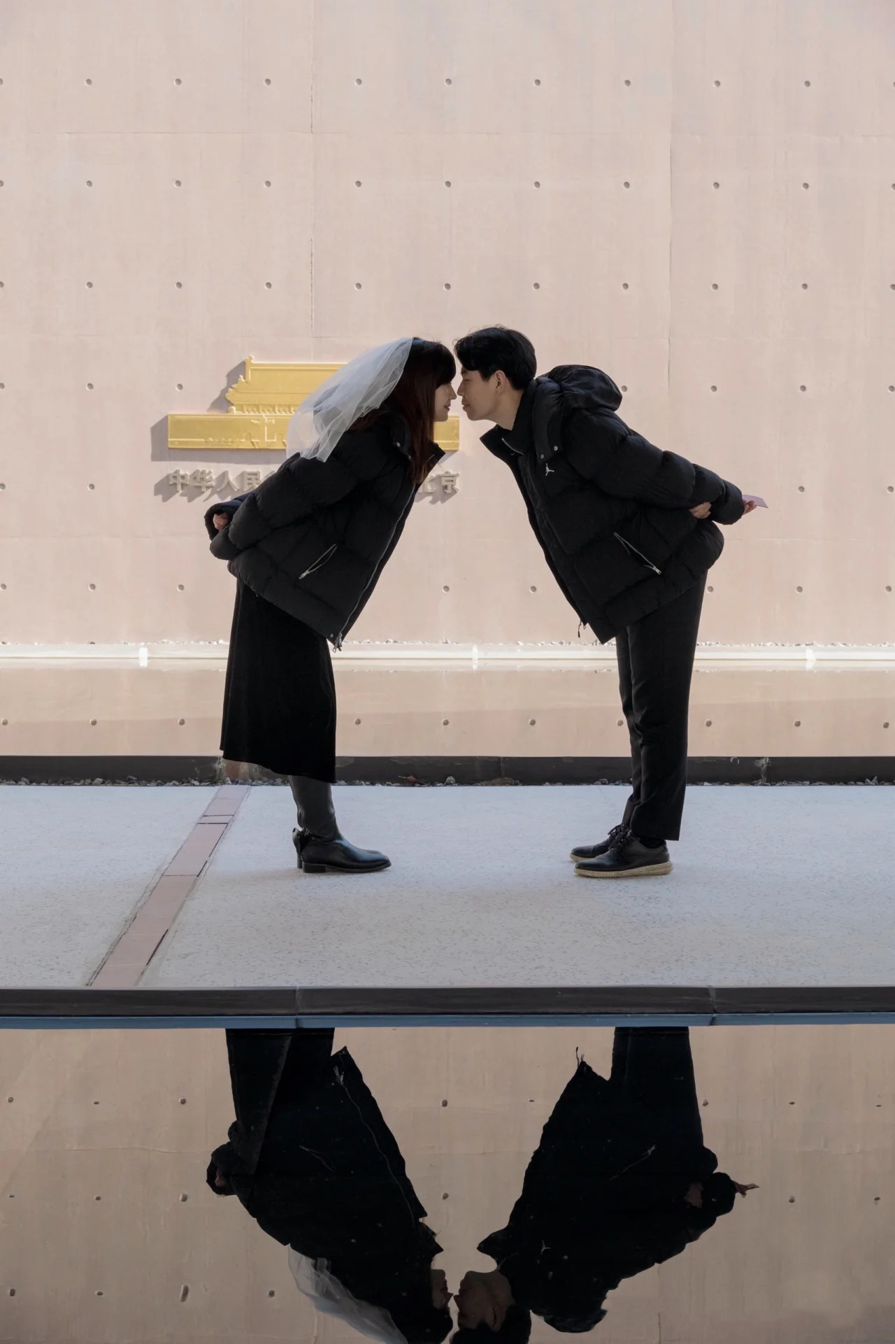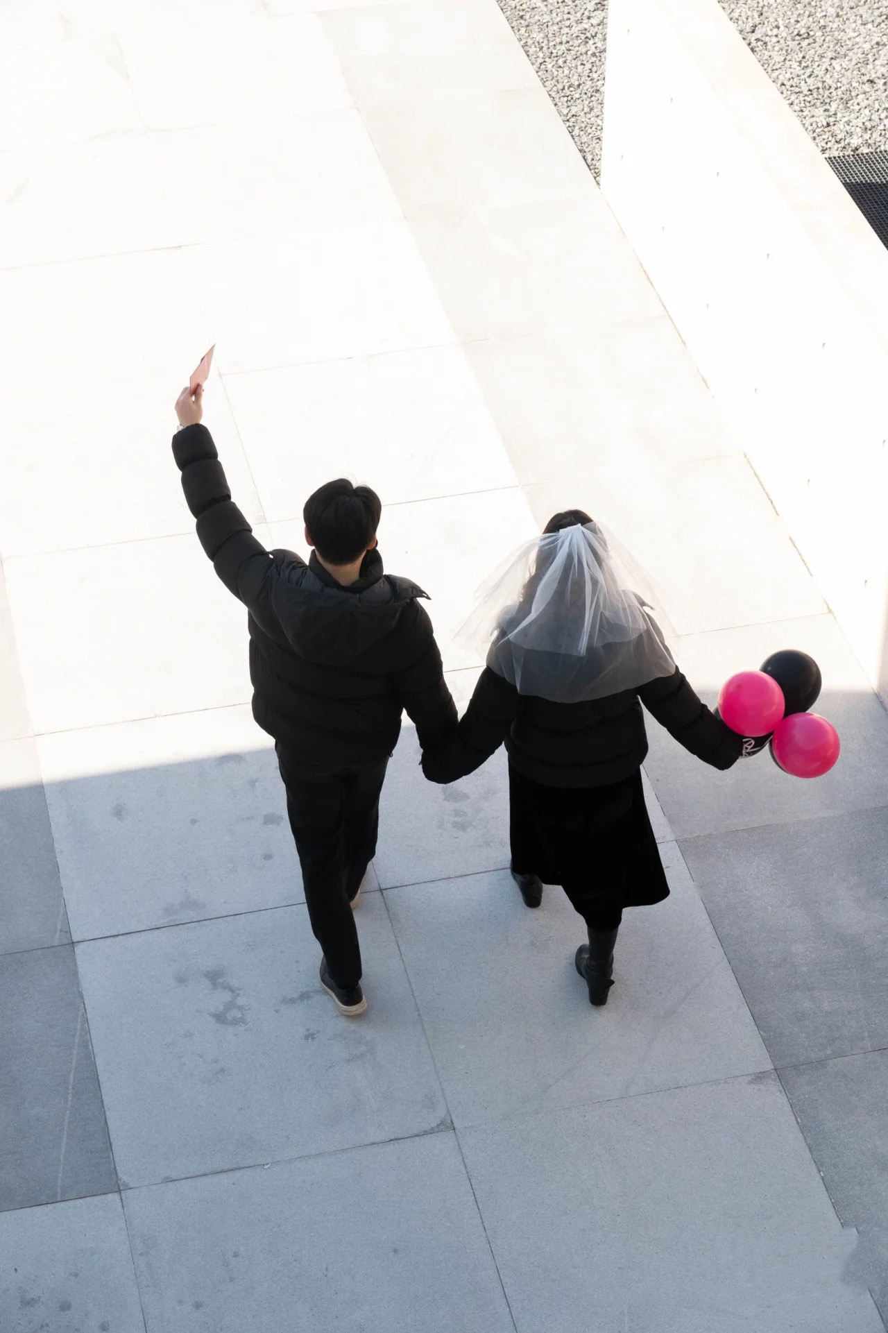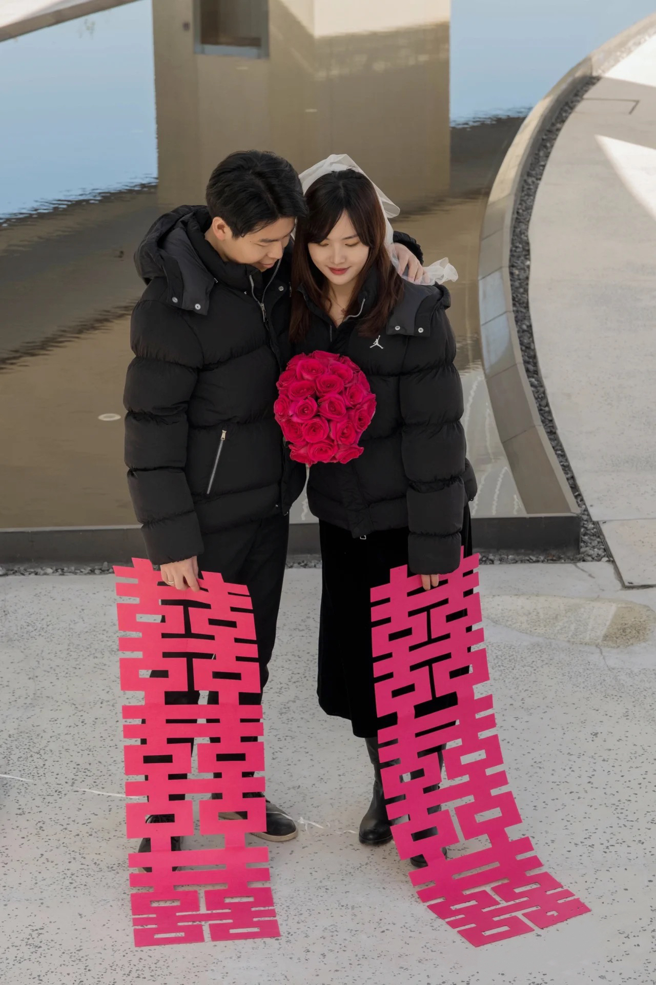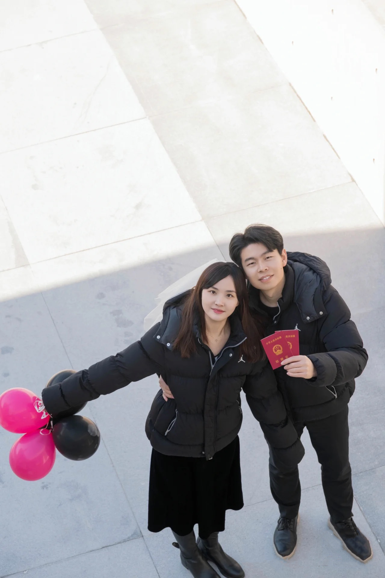 秋冬天你们一定很纠结拍外景可以穿什么吧! 没想到客人准备的黑色情侣羽绒服也很出片,保暖的同时还特别有个性! 因为是黑色元素,所以推荐他们去建邺区的宪法 公园,千净大气,超级适合拍领证!! 我还给他们准备了和手捧花同色系的道具,黑粉 很出片呀 大家不用担心领证外景天冷不能穿裙子哦,可以加一个小外套,男生女生的衣服保持同色系,画面千净,就能拍出美美的照片啦!
