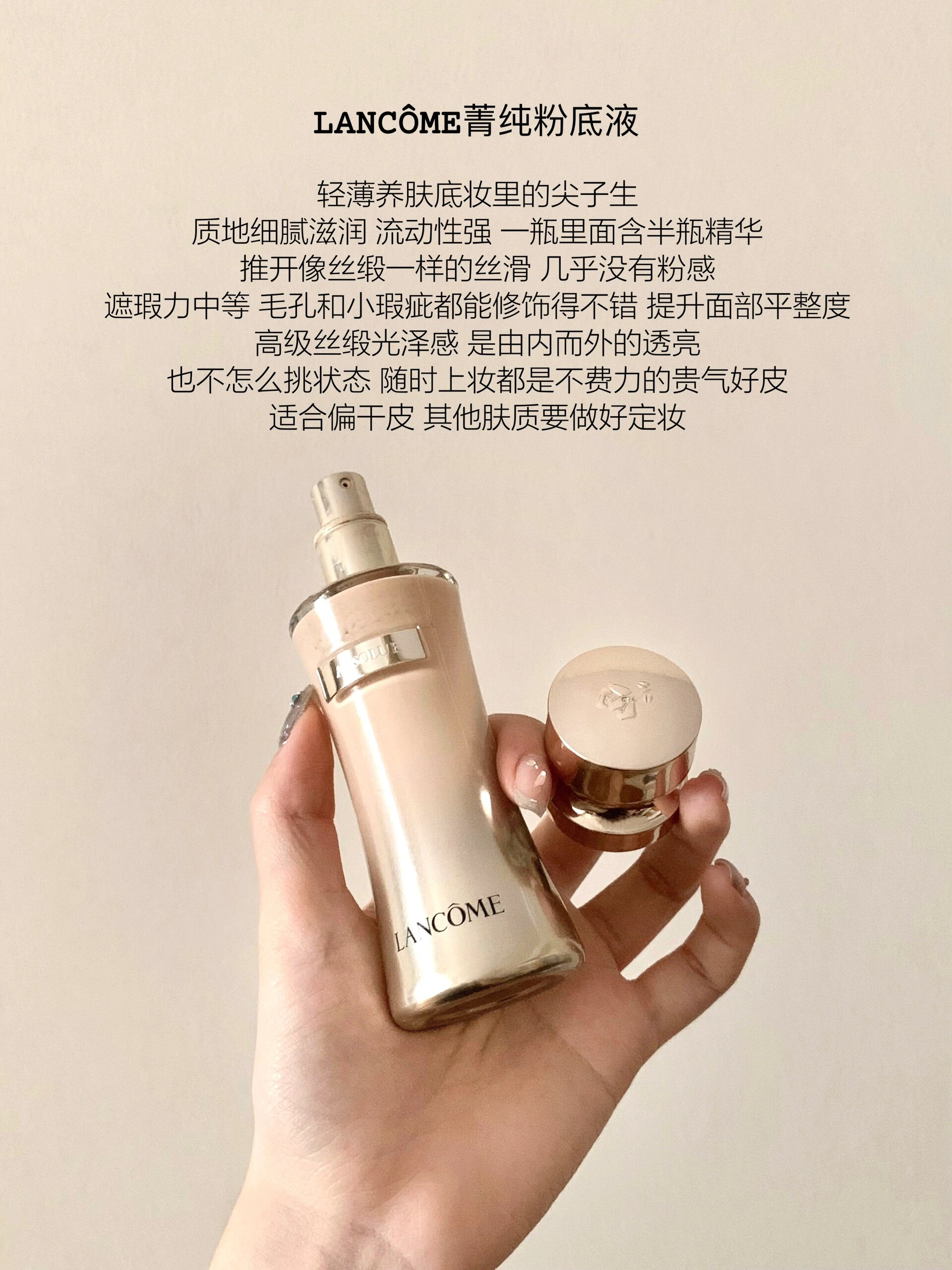 中性皮 冬天脸颊偏干 夏天T区偏油 坐标北方 肤色黄一白 偏橄榄皮 有点痘印 底妆偏好轻薄养肤类 不追求高遮瑕 🛒好物名称:兰蔻菁纯粉底液 100 🤔推荐理由: 轻薄养肤底妆里的尖子生 质地细腻滋润 流动性强 一瓶里面含半瓶精华推开像丝缎一样的丝滑 几乎没有粉感 遮瑕力中等 毛孔和小瑕疵都能修饰得不错 提升面部平整度高级丝缎光泽感 是由内而外的透亮 也不怎么挑状态 随时上妆都是不费力...