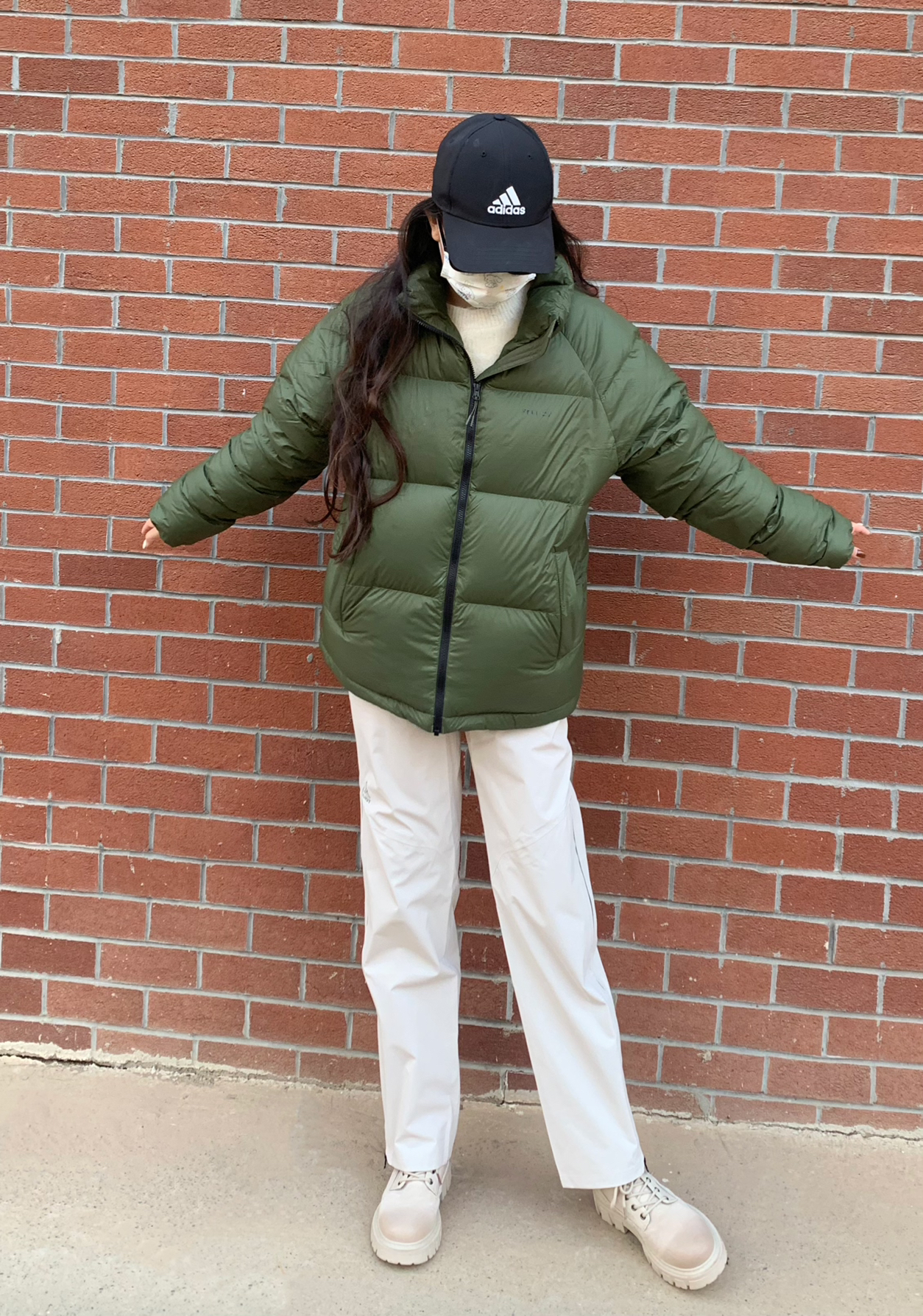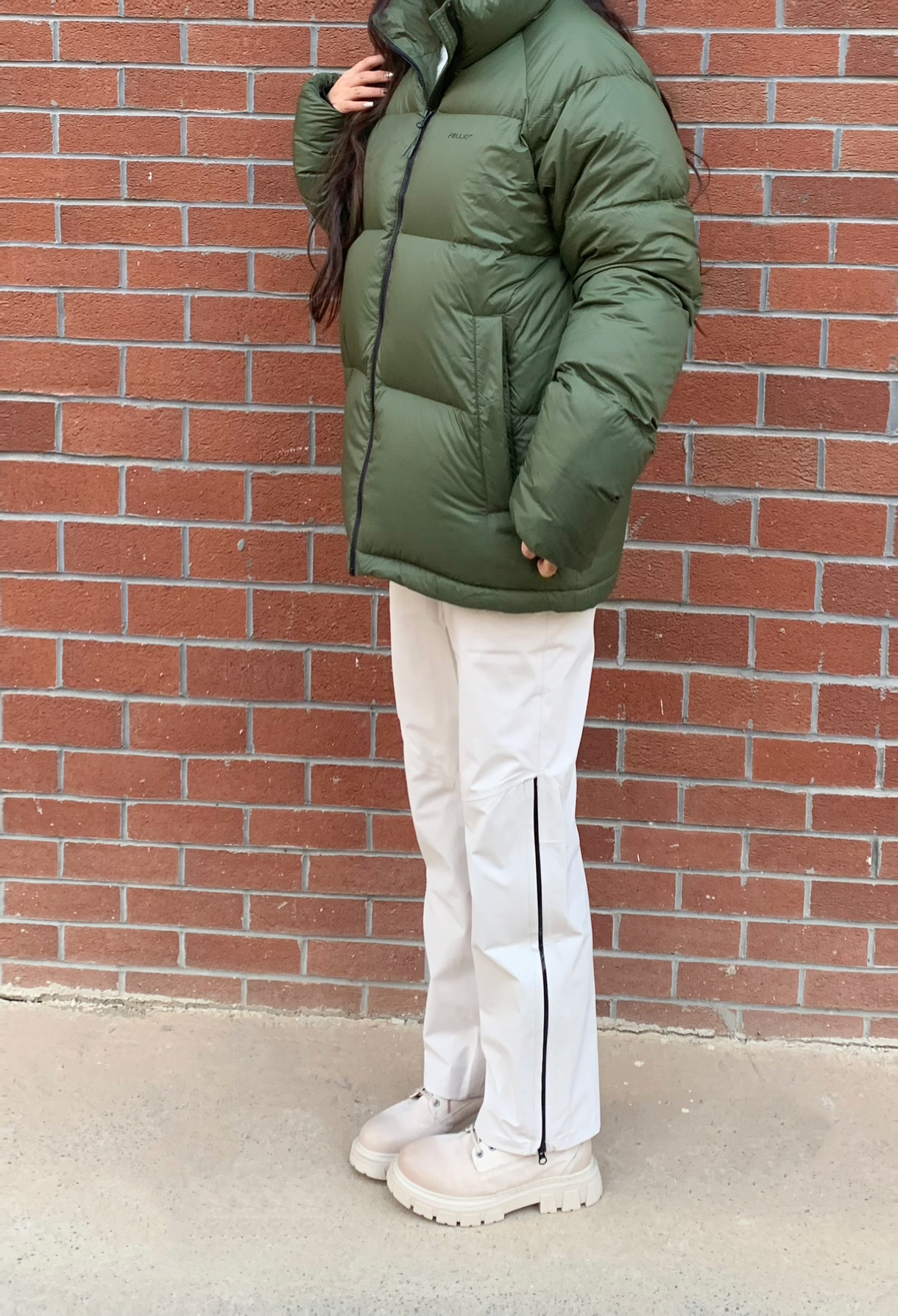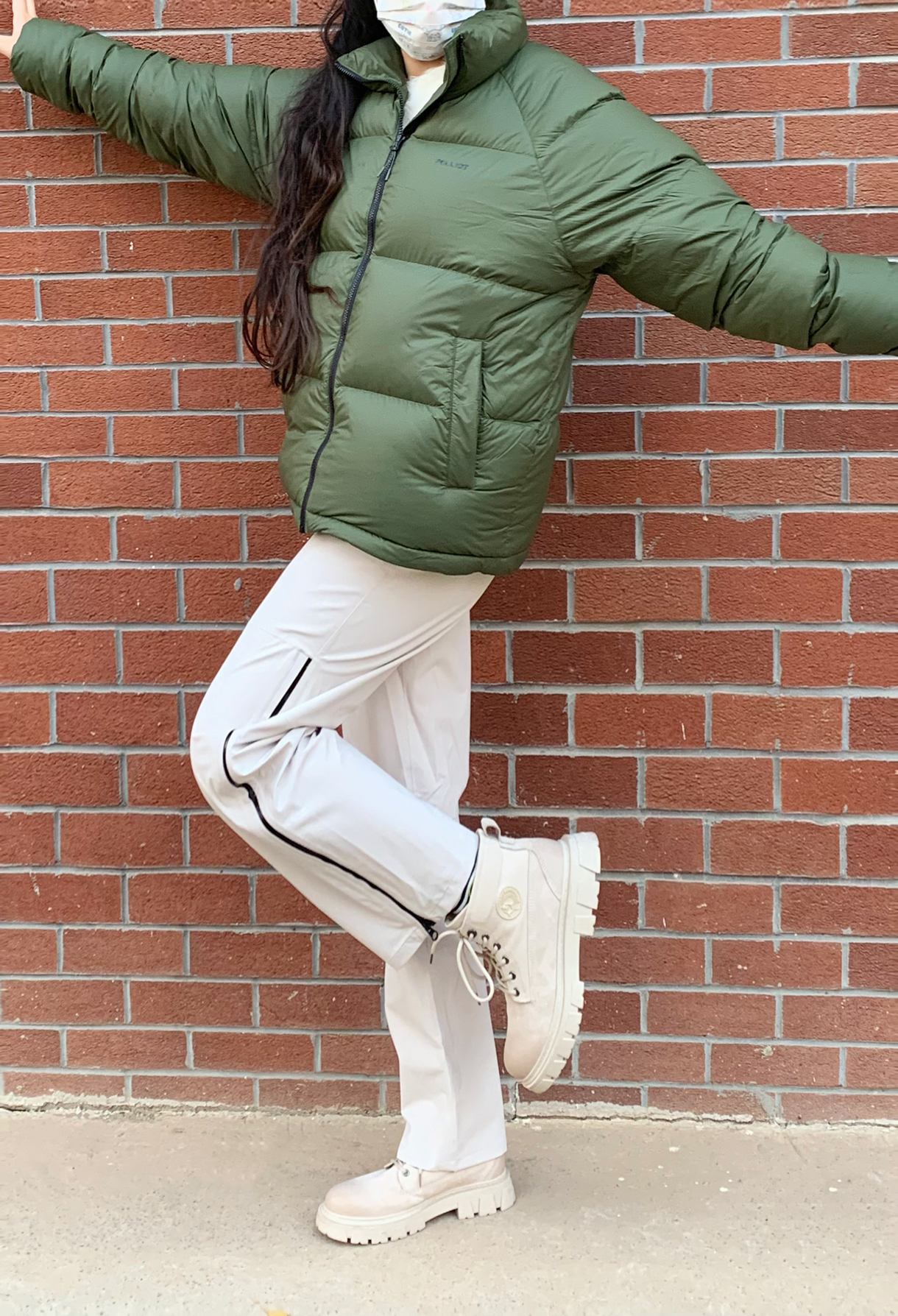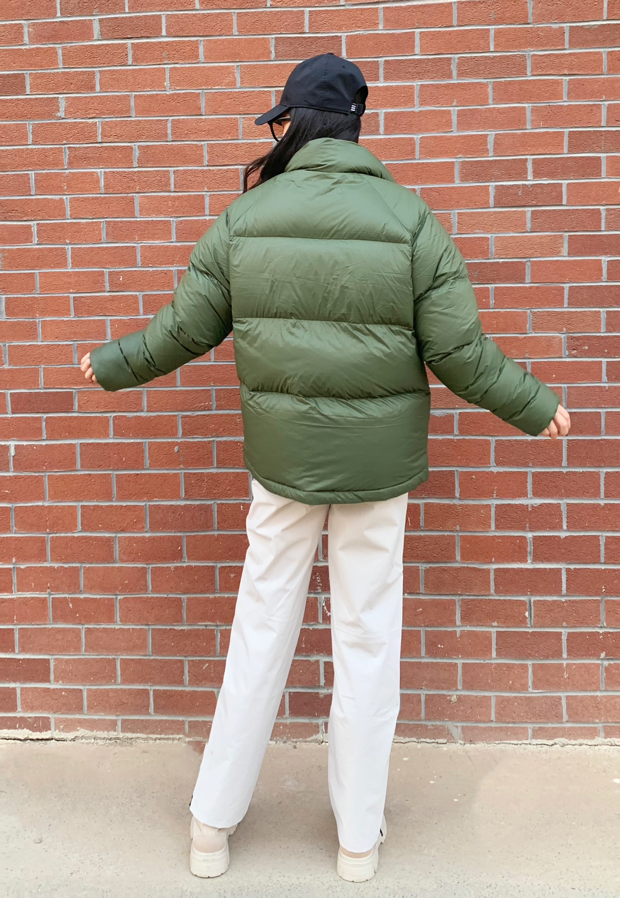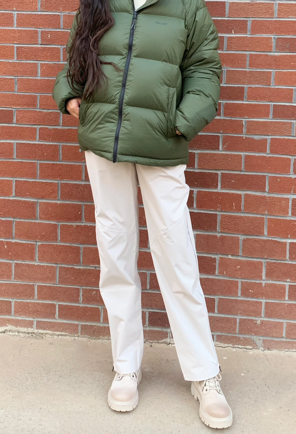 哈喽宝宝们允允来分享今日穿搭喽 冬天咱们主打一个不要让自己受冻!最近河南气温又10度下降 要记得保暖哦 所以羽绒服必不可少呢 绿色是我最喜欢的颜色呢 我171 108斤 羽绒服穿的M码 穿起来很轻薄很暖和哦 里面穿一个白色内搭 轻松搞定出门 裤子穿的是伯希🏠一款白色拉链裤子 我选择绿白作为全身搭配 白色裤子也可以说是非常百搭的喽~ 我穿的M码哦 姐妹们可以参考一下 天冷注意加衣姐妹们~