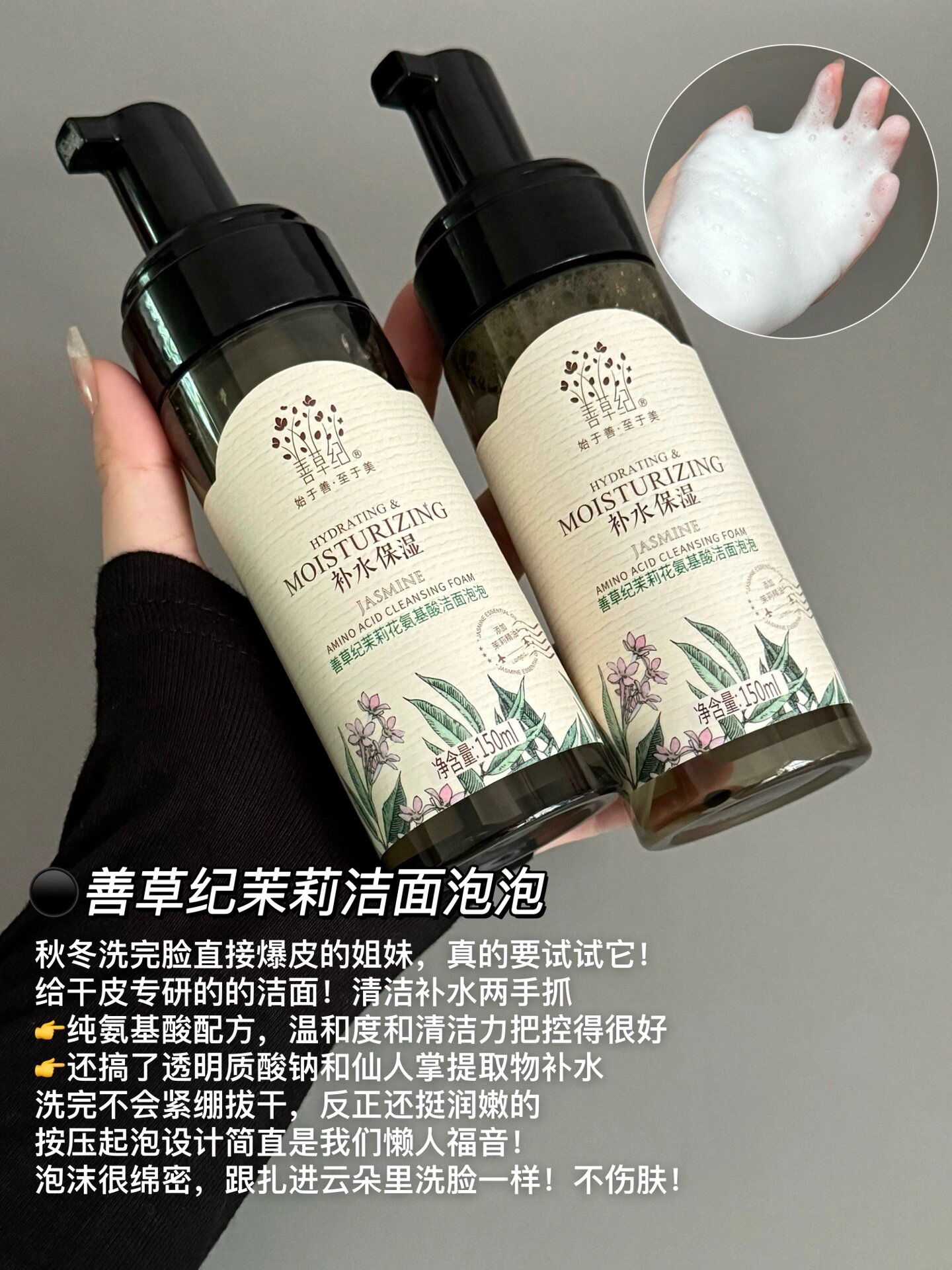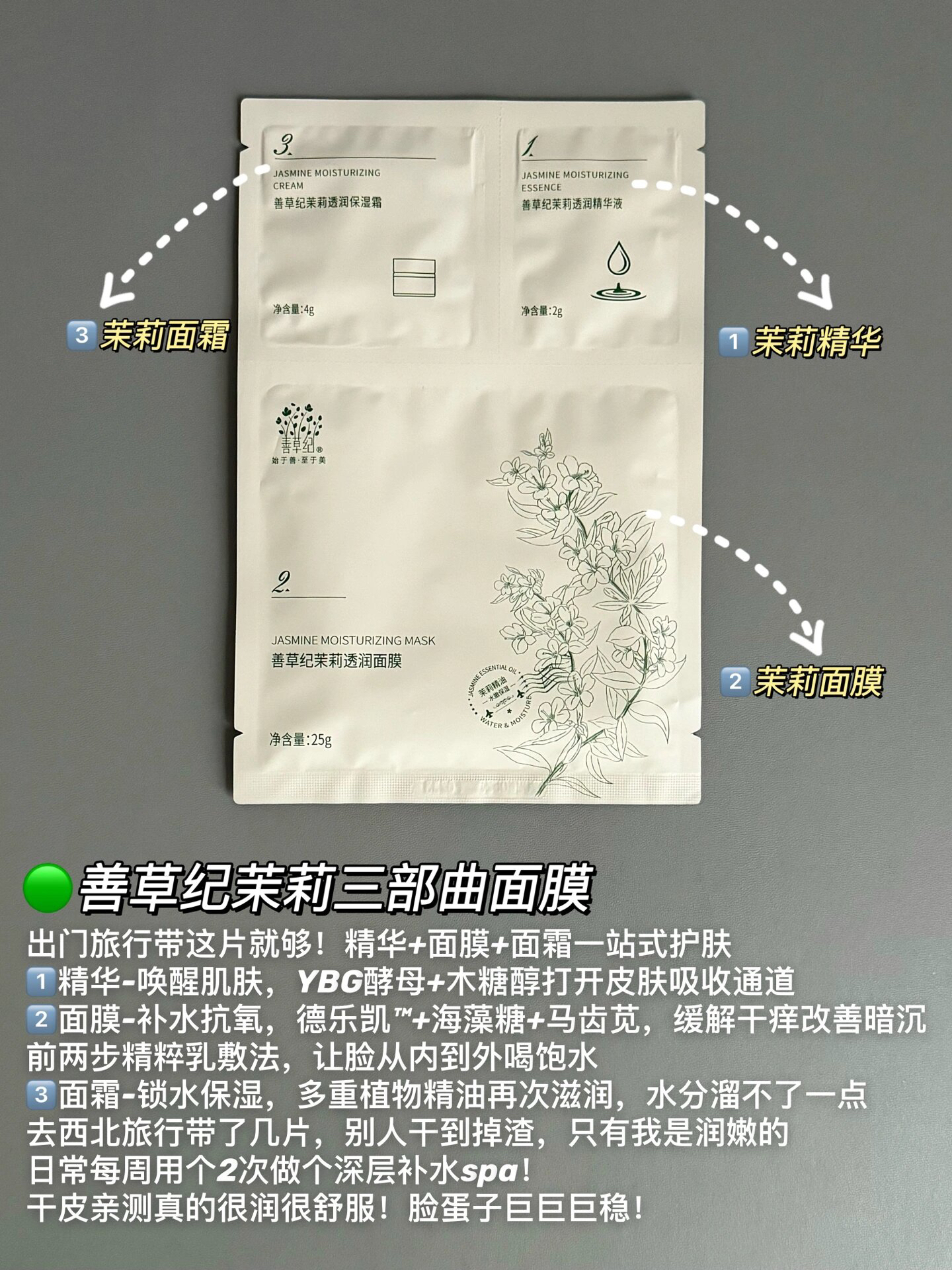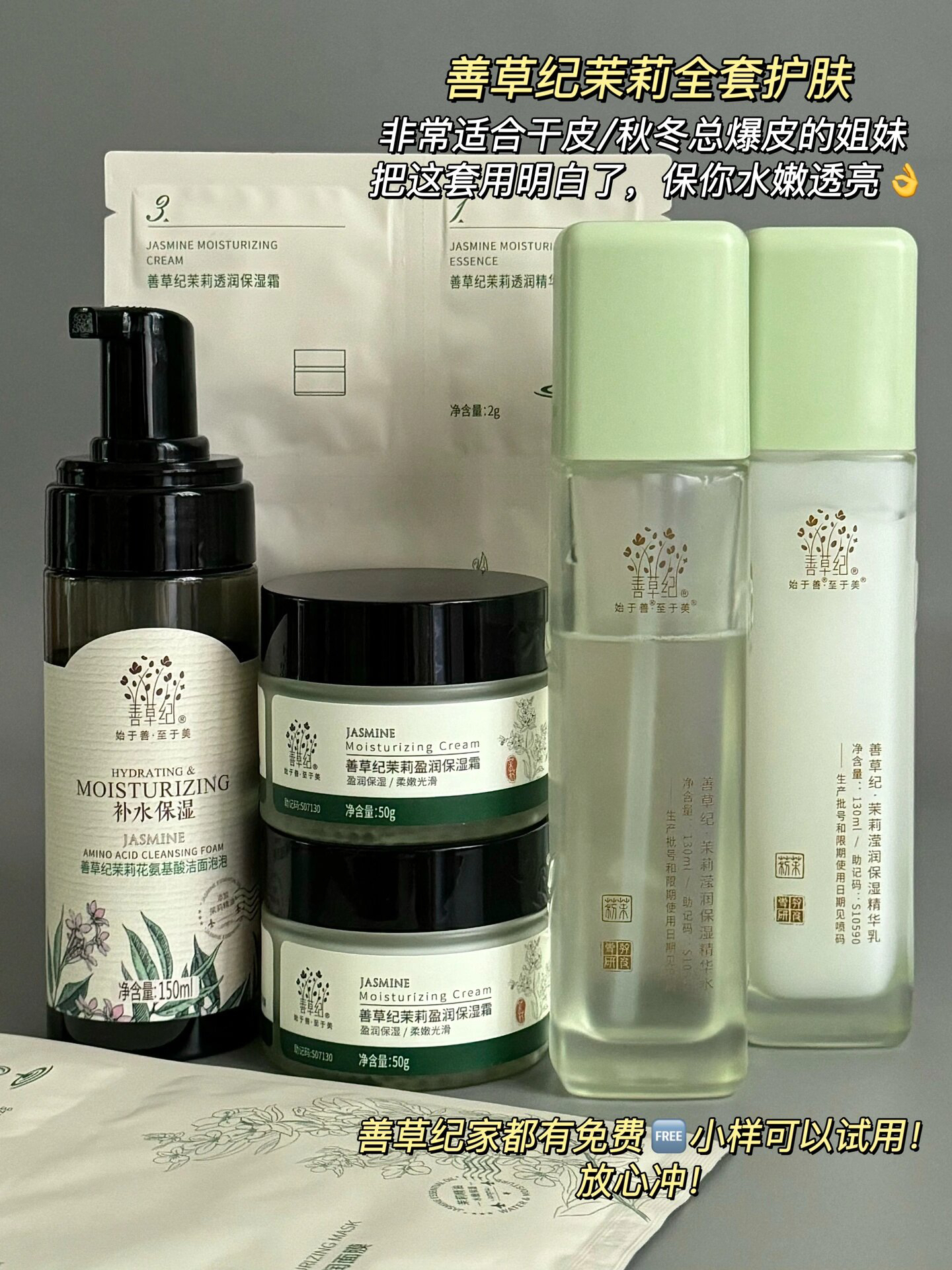 本篇笔记关联了善草纪 茉莉氨基酸洁面泡沫洁面乳 150ml、善草纪 茉莉三部曲保湿补水收缩毛孔面膜 贴片式三合一混干护肤 维稳、善草纪 二代茶树保湿霜 油皮清爽补水倍润舒缓红血丝提拉紧致紧致毛孔滋润型长效 茉莉保湿霜等商品,为用户提供真实的使用体验和购买参考。