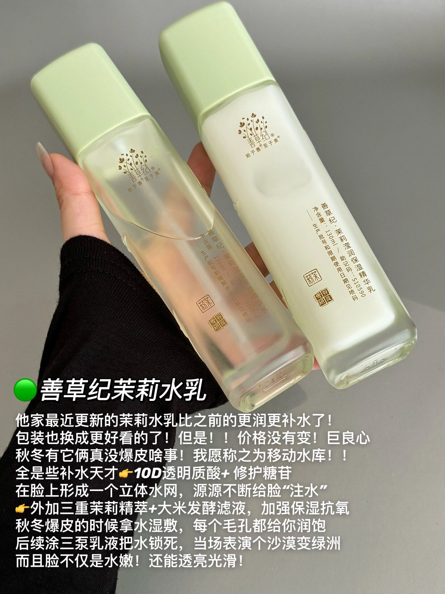 带着10万水军和干皮拼命!补水太牛了💦|||干皮、一到秋冬就爆皮掉皮 用了很多补水产品都还觉得脸“渴”的姐妹! 看看👉👉善草纪茉莉全套护肤吧! 简直就是为拯救大干皮而生的! 一整个把你润成嫩豆腐!谁用谁水灵没开玩笑! - 🟢善草纪茉莉水乳——补水保湿 他家最近更新的茉莉水乳比之前的更润更补水了! 秋冬有它俩真没爆皮啥事!我愿称之为移动水库!! 全是些补水天才,10D透明质酸+ 修护糖苷 在脸上形成...