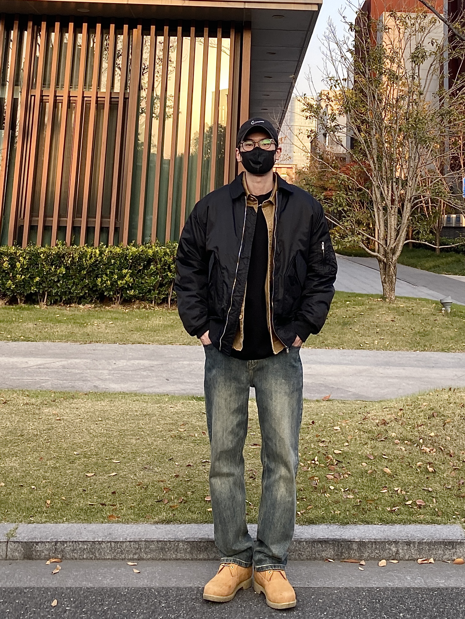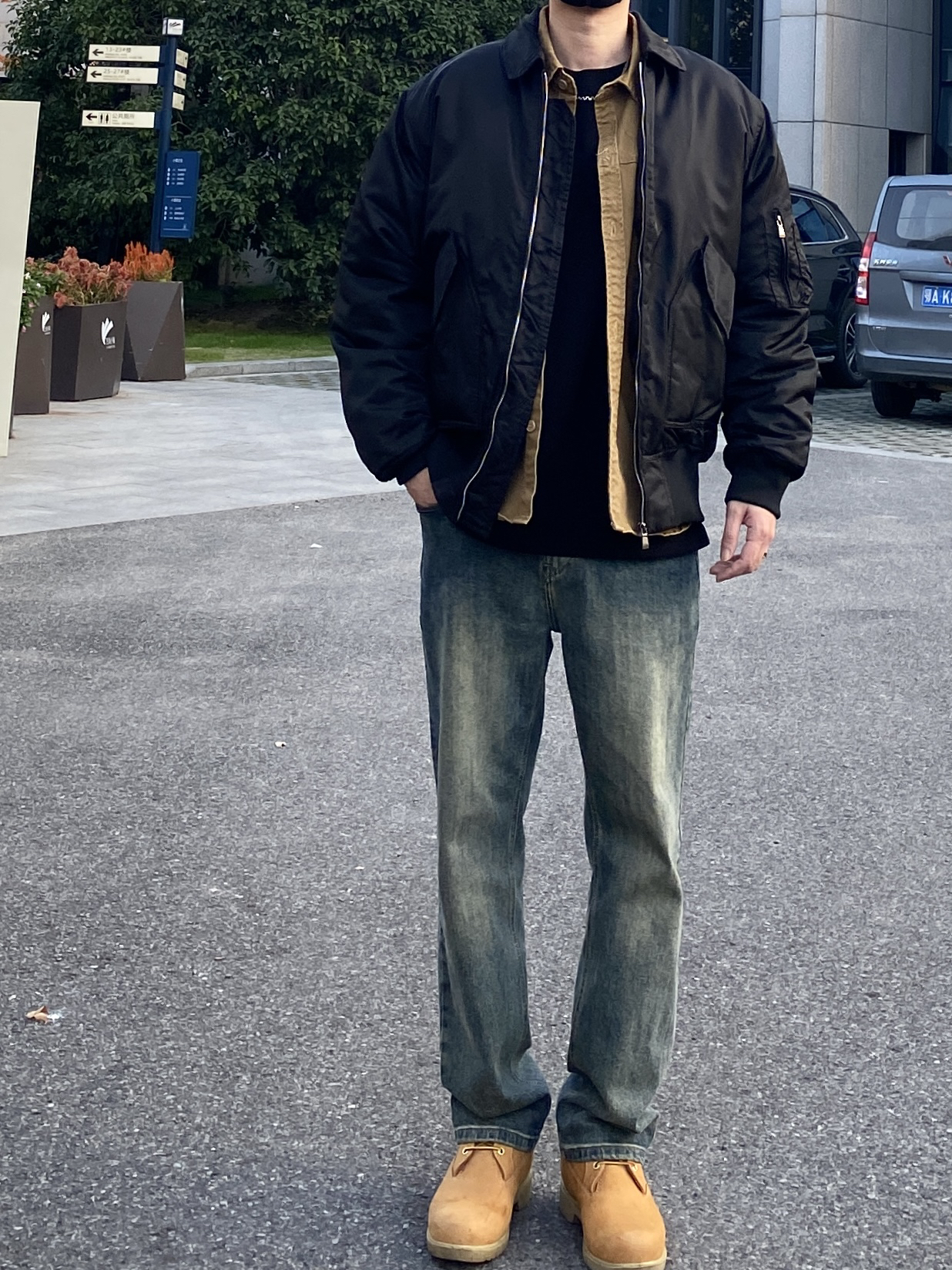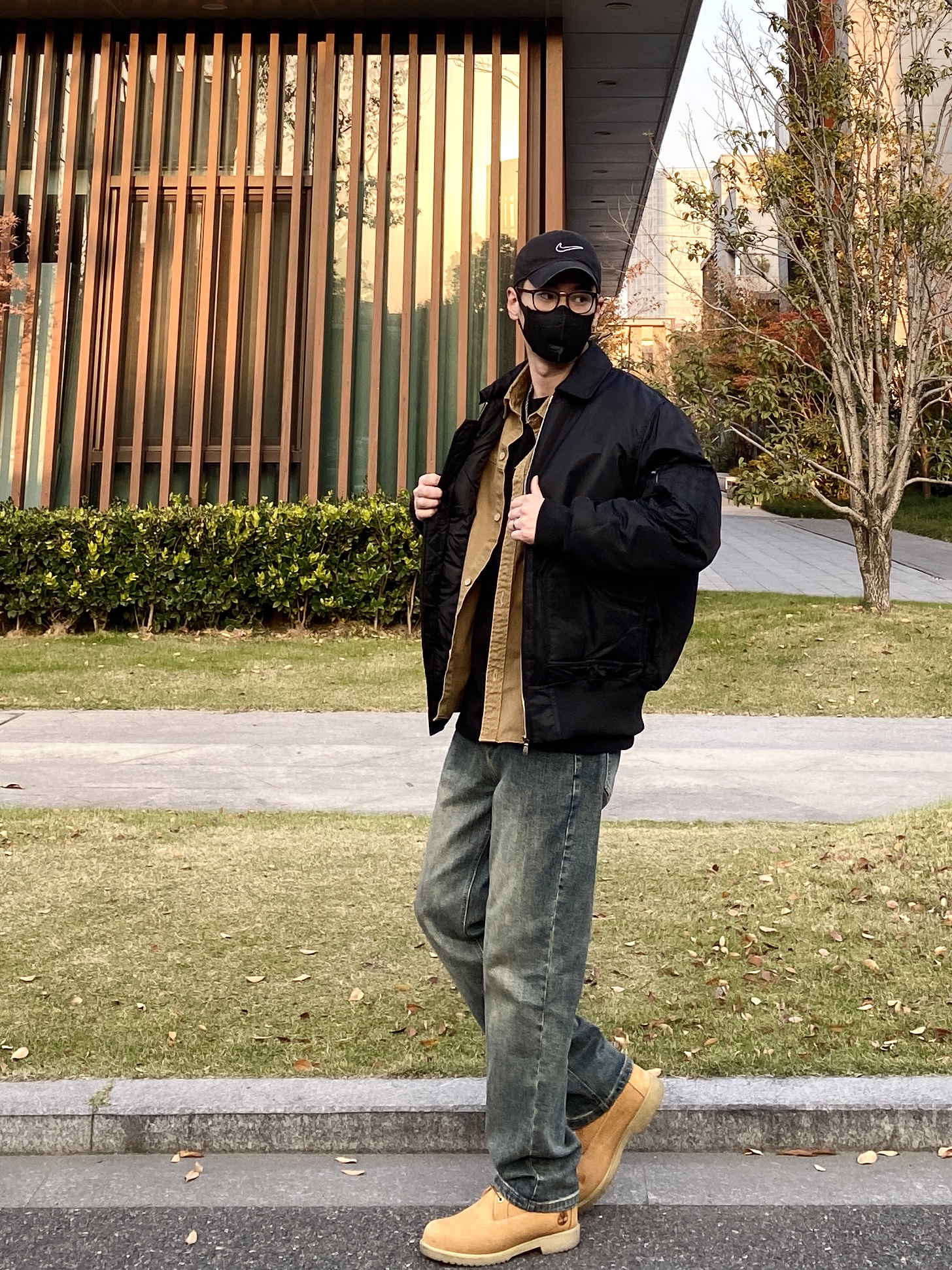 今天这套先用卡其色做旧工装衬衫做内搭,裤子选择不挑腿型的水洗直筒牛仔裤,鞋子上脚硬汉必备的timberland工装靴,接着套上简约百搭的宽松阔版翻领飞行员棉服夹克,最后戴一顶黑色棒球帽呼应下衣服的颜色,OK,出门看看搭配效果吧! - 今日穿搭 衣服裤子:NICE LILI 鞋子:timberland