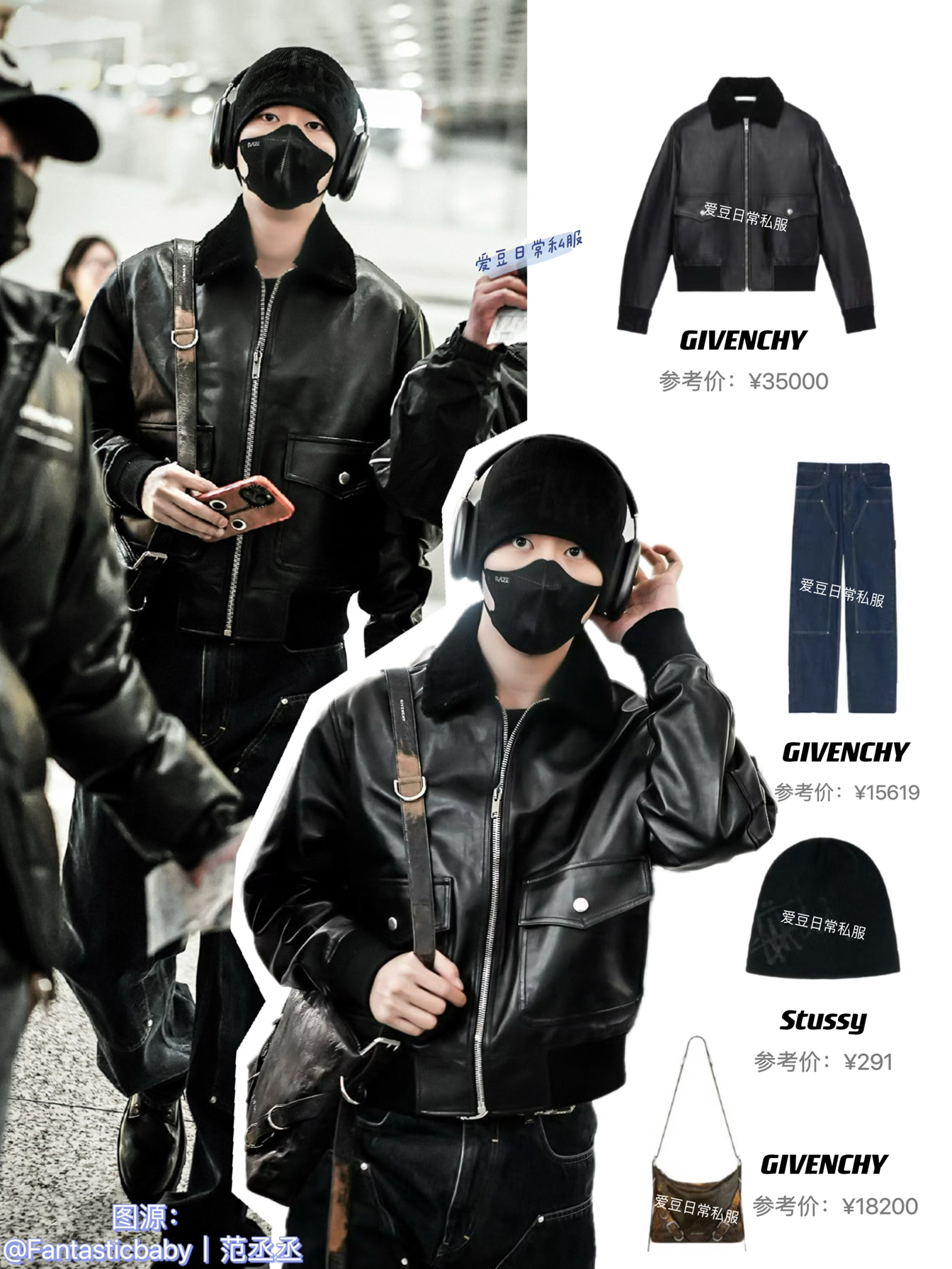 范丞丞更新了11月23日机场私服,黑色毛领夹克下搭原牛仔裤,冷酷无情的简约质感穿搭分享! 图片来源:Fantasticbaby丨范丞丞 夹克:Givenchy 牛仔裤:Givenchy 针织帽:Stussy 包袋:Givenchy