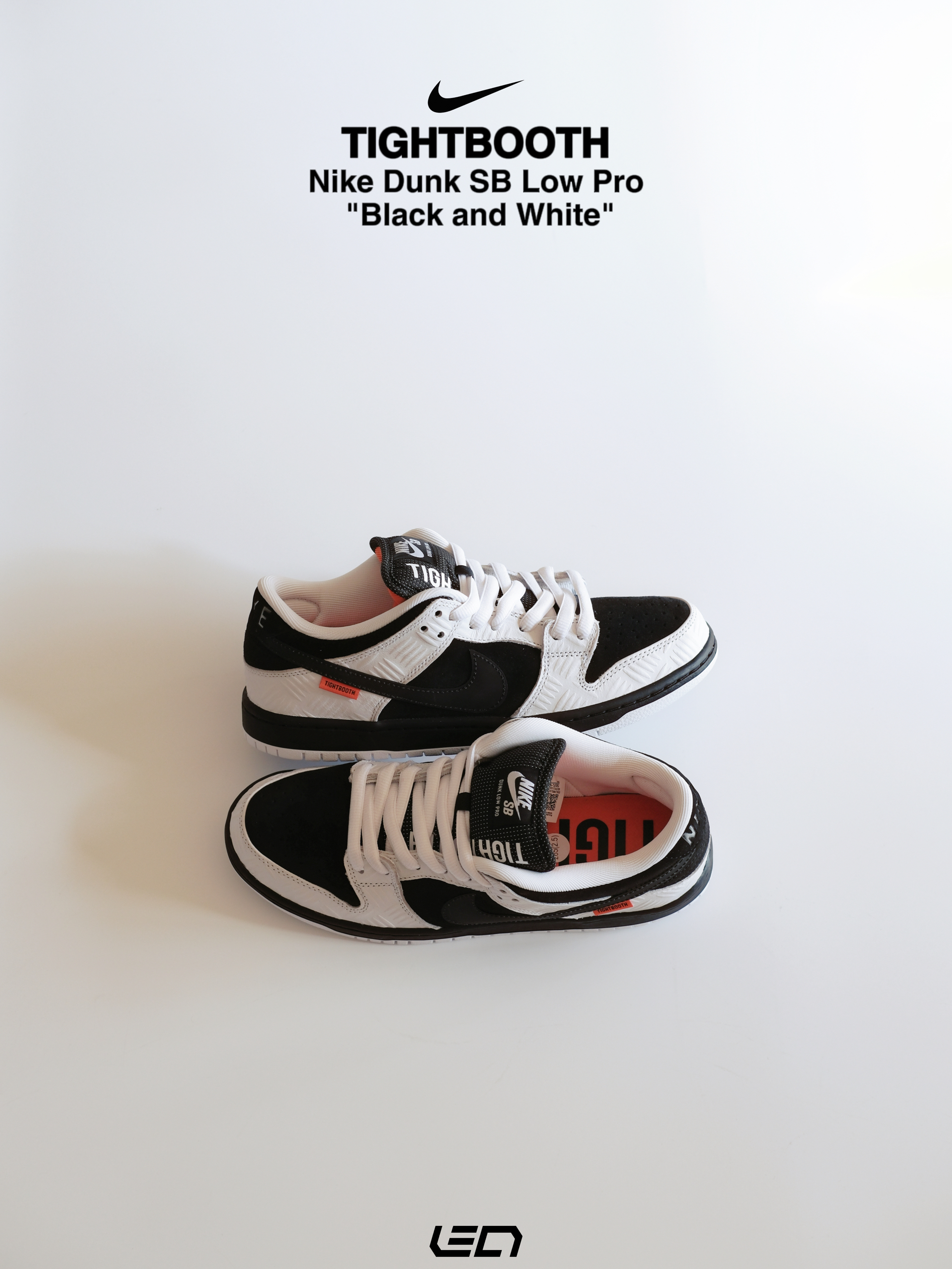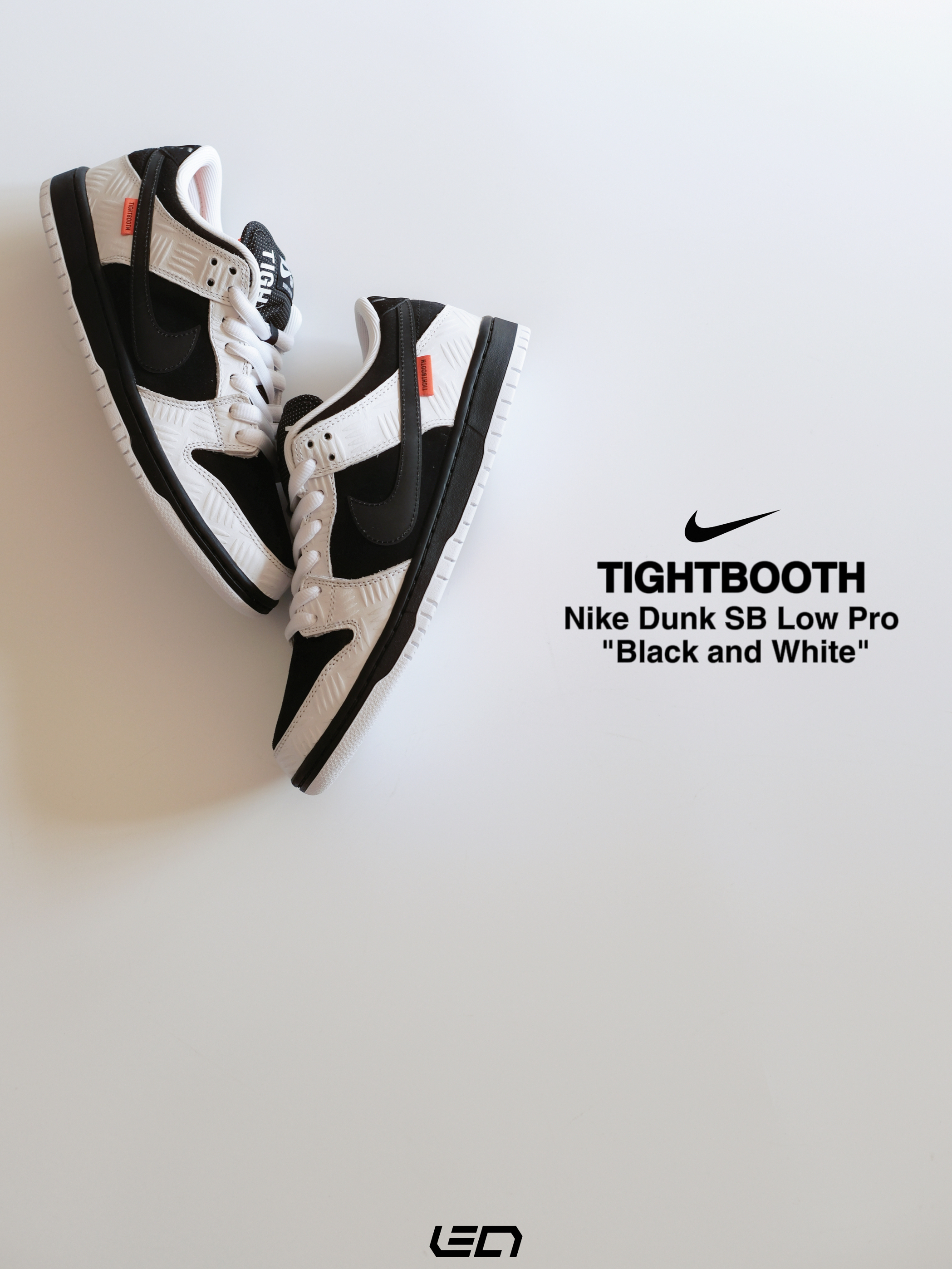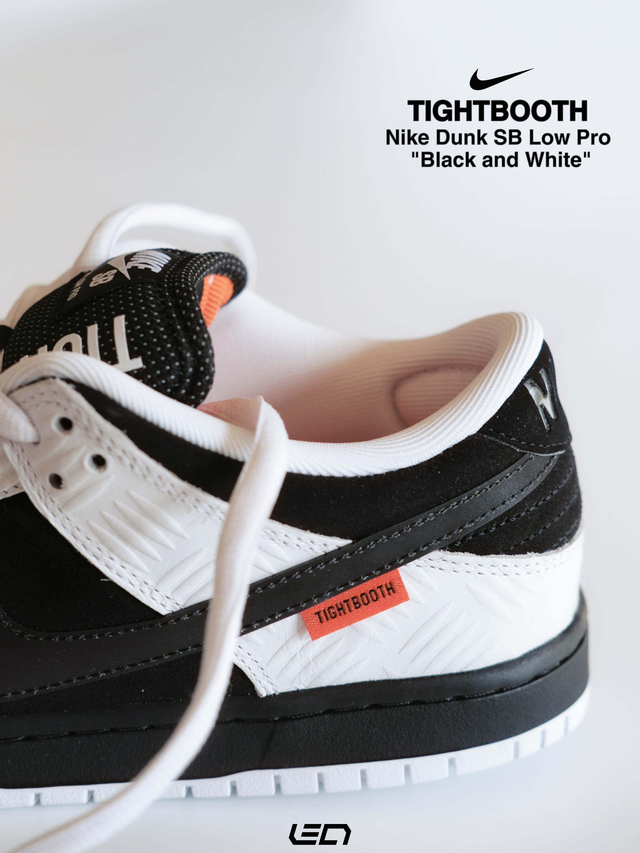 - 这双Nike Dunk SB Low Pro"Black and White"是同日本热门滑板品牌TIGHTBOOTH的联名款~ 配色是我们非常熟悉的黑白熊猫配色🐼材质方面以麂皮为底,搭配白色皮革框架设计👍🏻上方还带有压印的"划痕"纹路,营造出的视觉效果很不错。 - 设计细节上🔍 黑色的Swoosh部分,使用了特殊的反光材质,尾部则带有橙色TIGHTBOOTH标签点缀👌🏻鞋舌部分以黑色为主搭配...