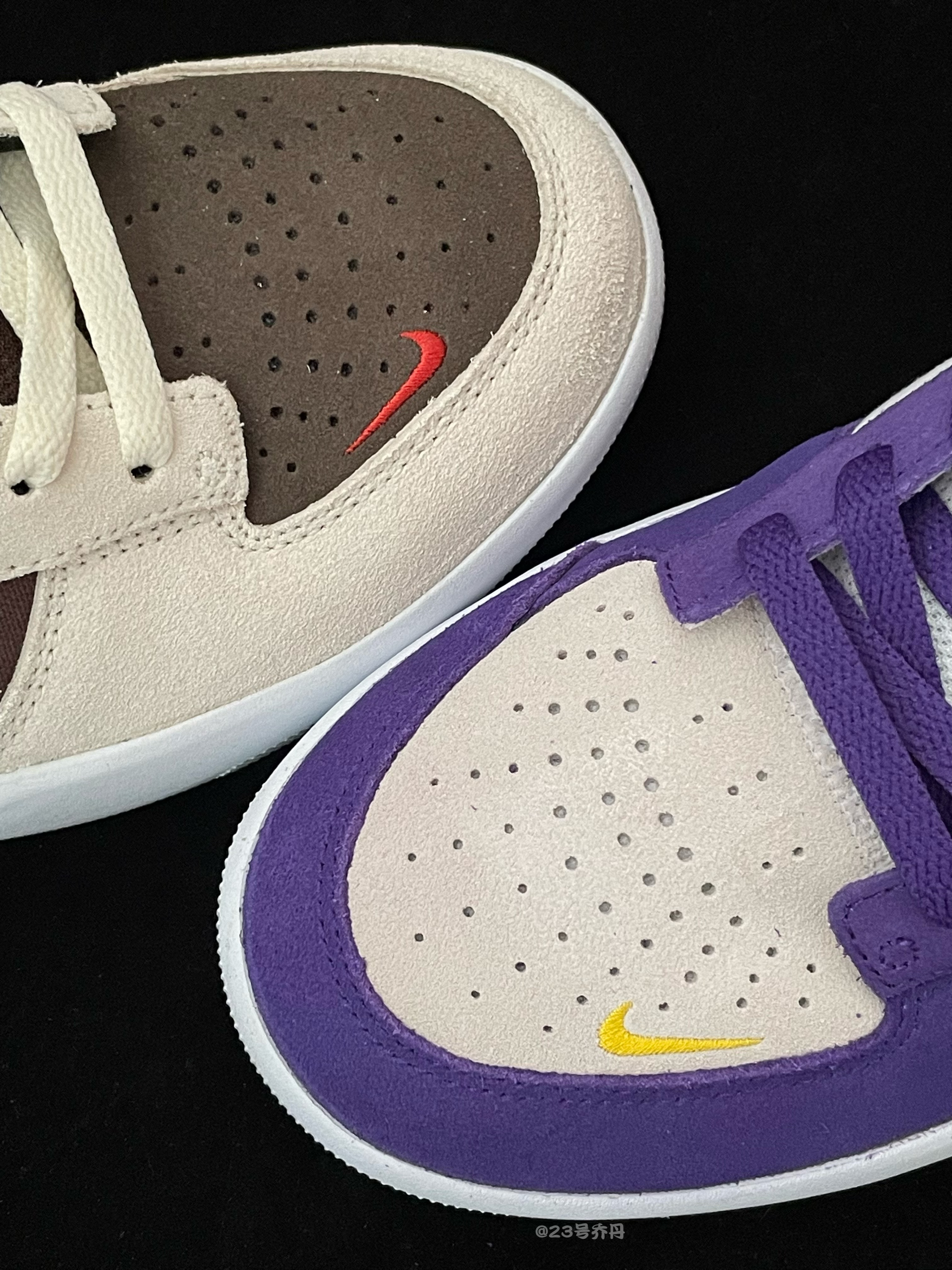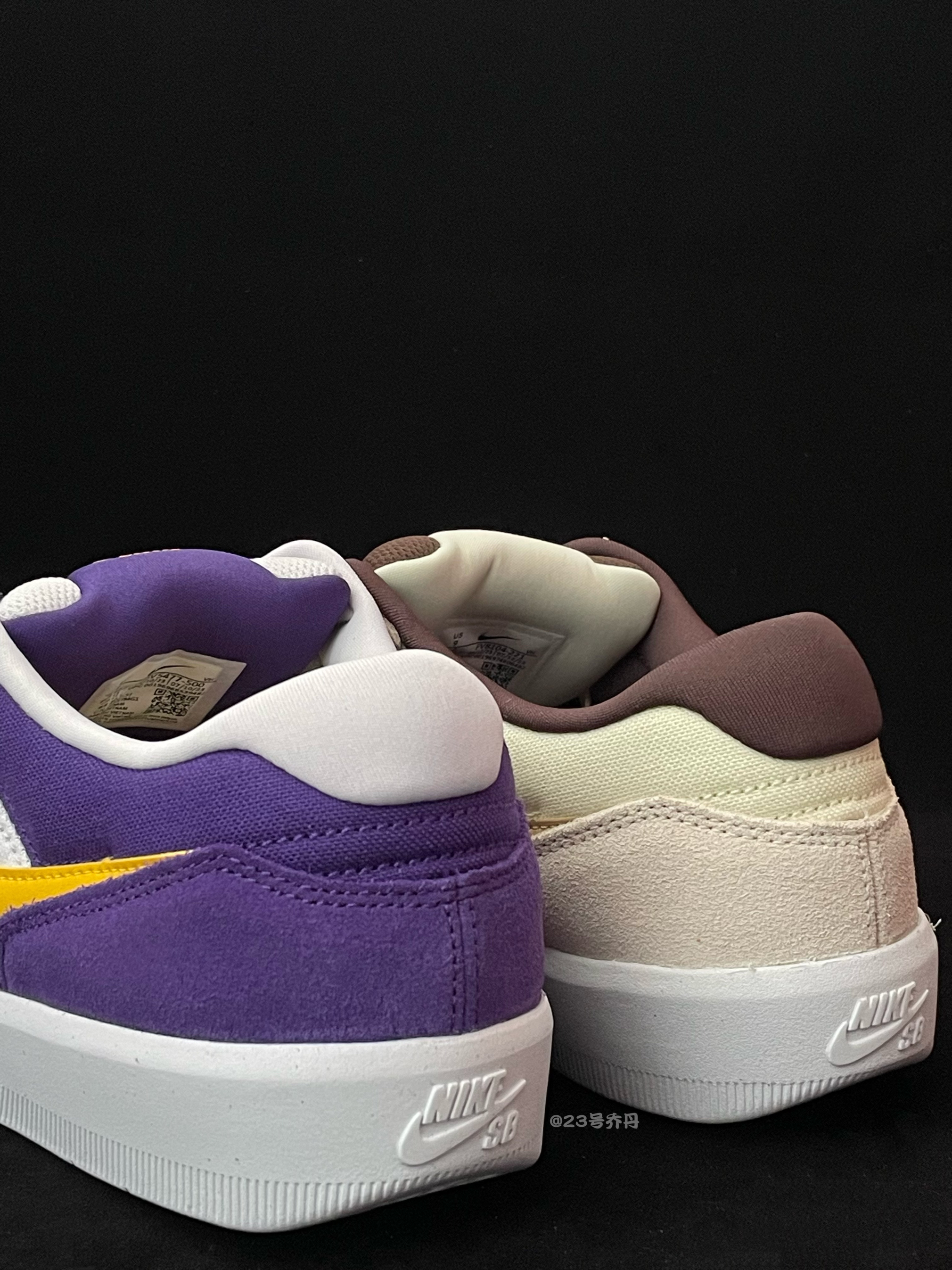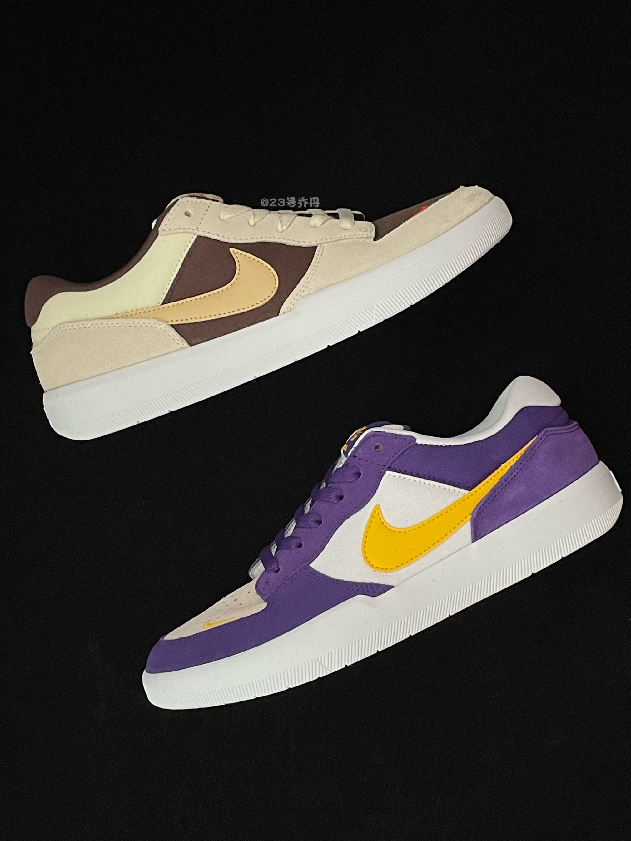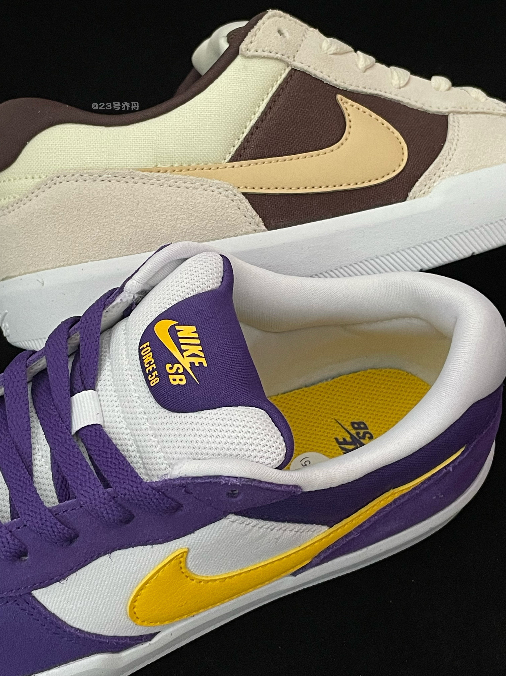 今天给大家分享两双颜值与性价比都不错的 Nike SB Force 58『棕色』&『紫色』 鞋款分别由棕/米/椰奶和/米/紫/黄等搭配 鞋面选用了翻毛皮+织物+光面皮革材质 质感方面到位 翻毛皮和织物部分打理麻烦一些 鞋头/鞋舌/鞋尾均呈现有品牌Logo图案 最后由白色的中底和同色的橡胶大底收尾 整体来说这是两双兼具颜值和质感的小板鞋👟 『棕色』款很有『倒钩3.0』的感觉 『紫色』款则是妥妥的『紫...