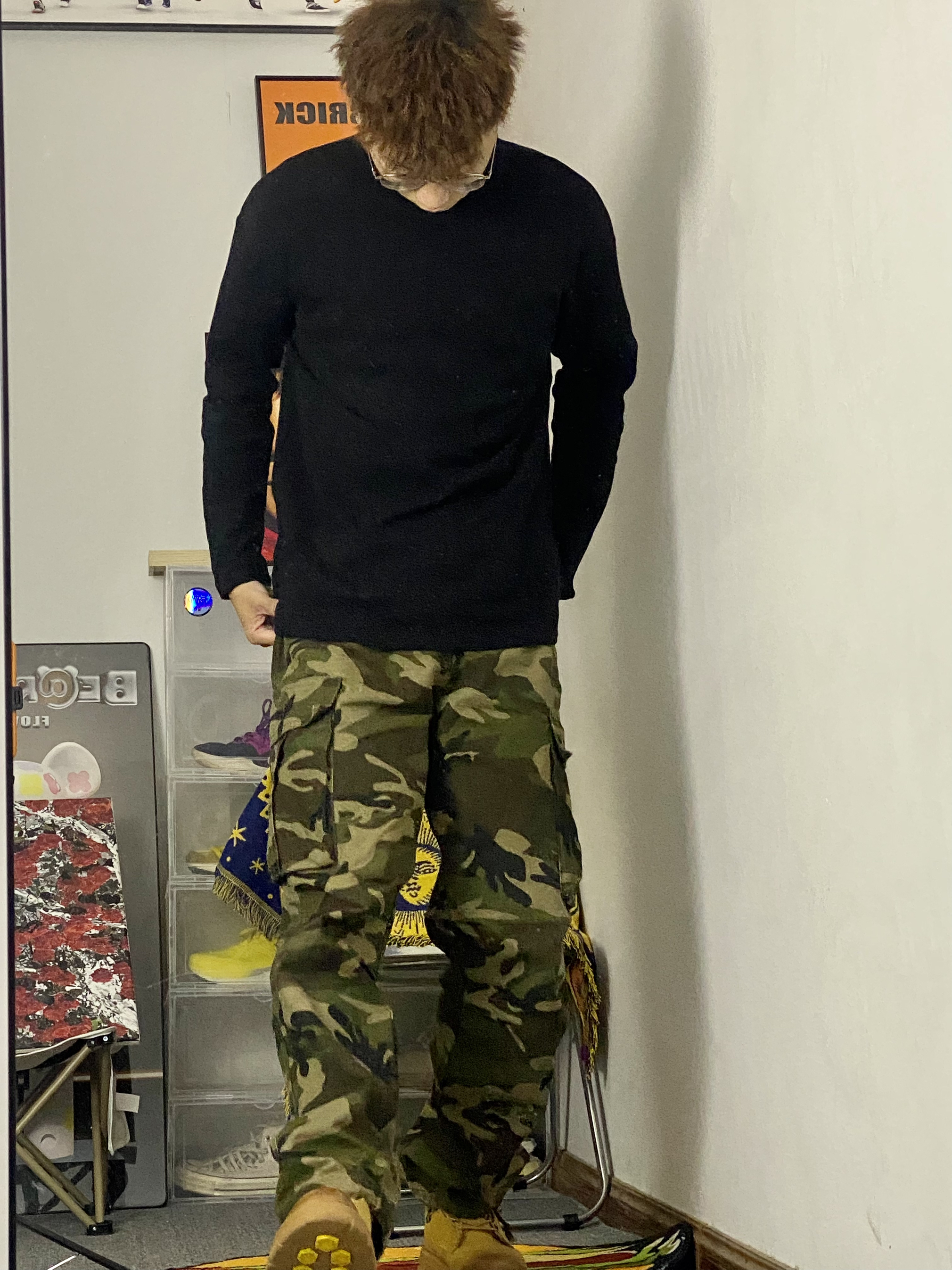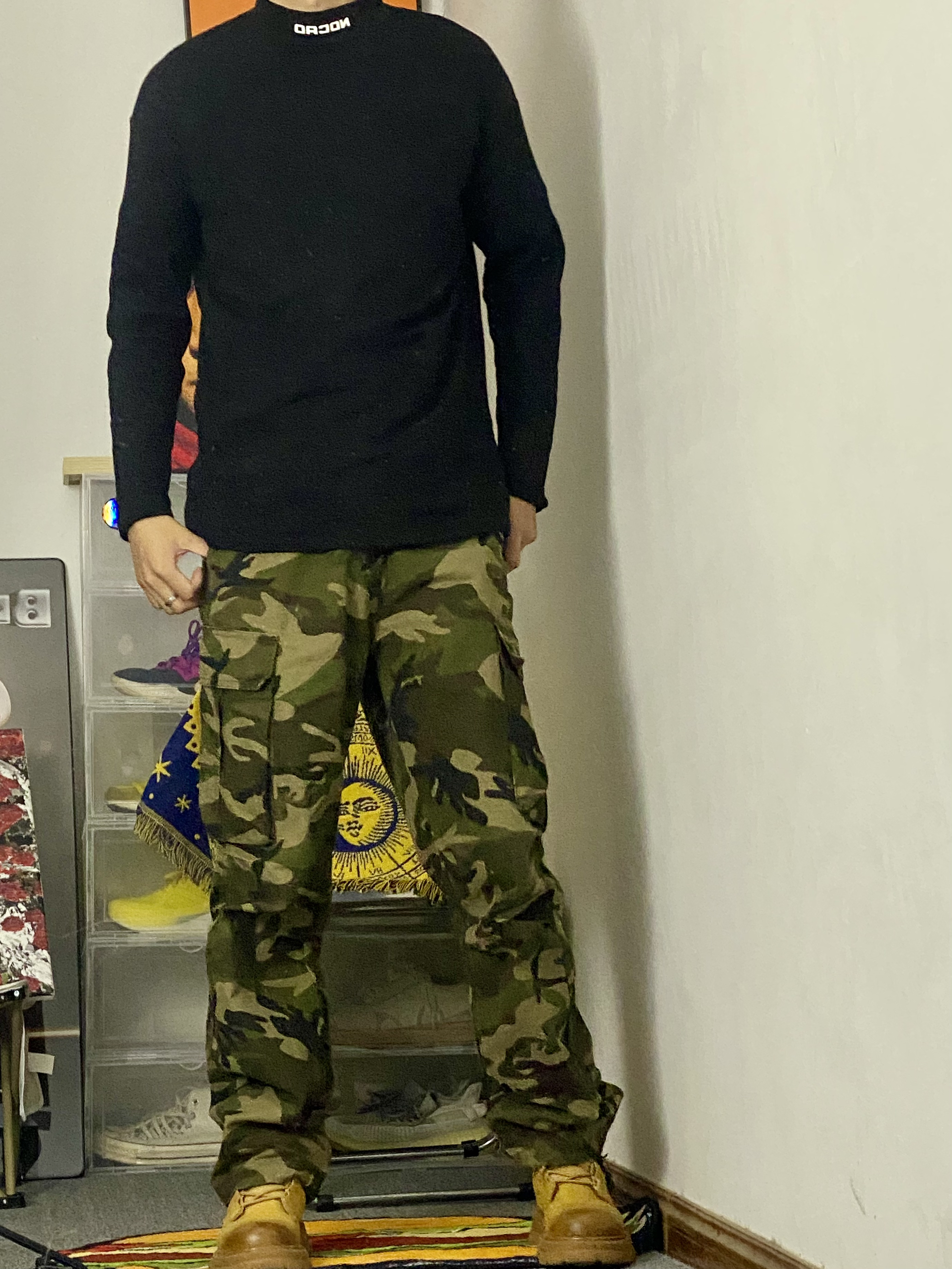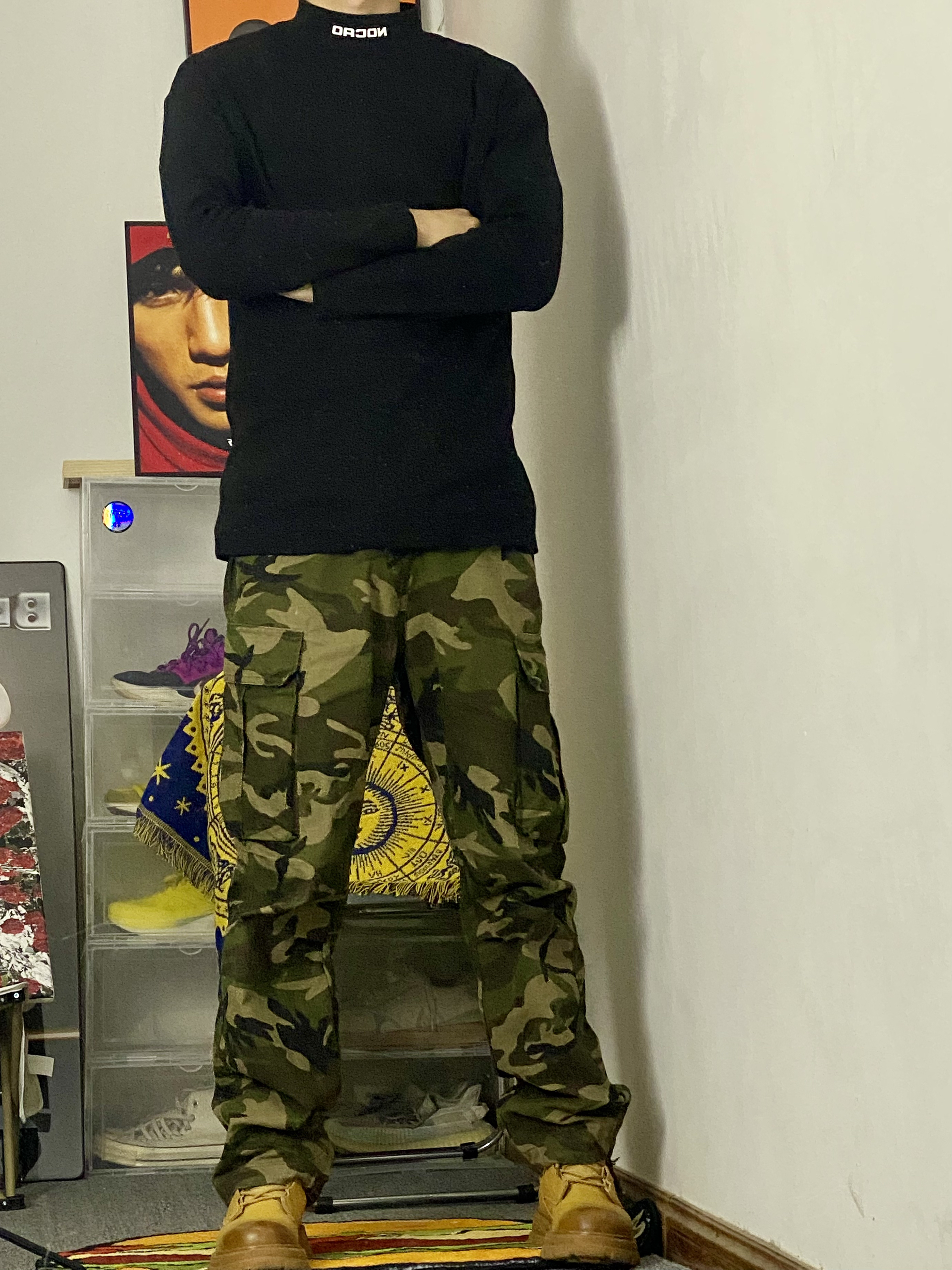 黑色加迷彩配上马丁靴基础又百搭 🥰今日冰美式穿搭分享 👔 衣服是 一件百搭基础加绒T恤 内搭必不可少 脖领小Logo设计时尚潮流 加绒材质上身穿起来感觉很舒服‼️ — 👖 一件迷彩牛仔直筒裤 裤子百搭 面料厚实 厚实的面料,让防风也不错 🤳 — 👟 马克华菲 一双黄色马丁靴 秋冬出门必备 加绒款也不怕冻脚🥰 身高/体重:178/130 👔xl