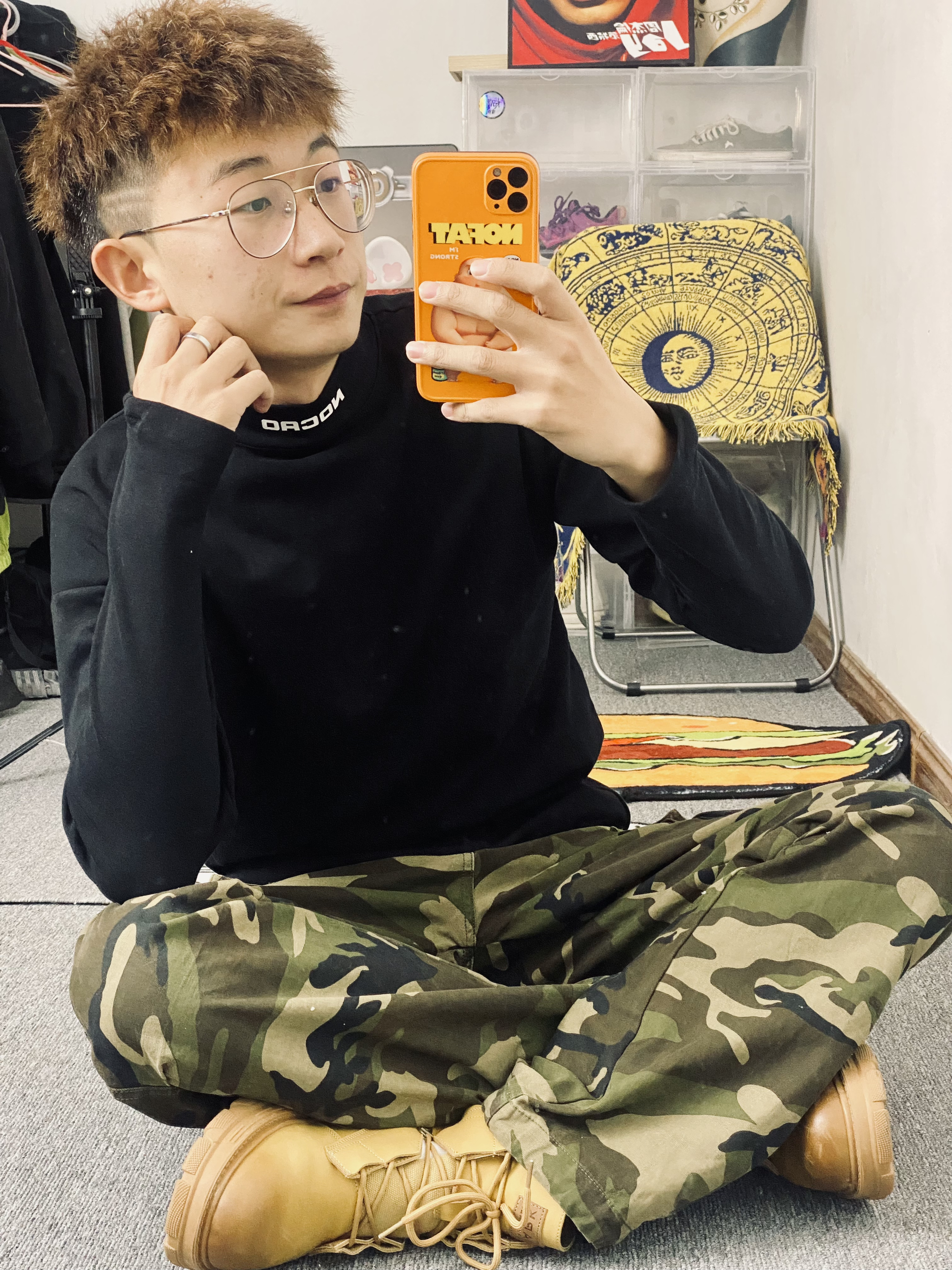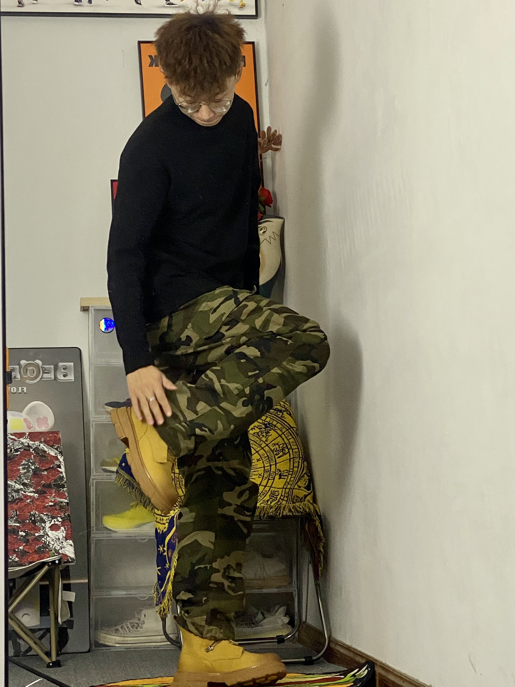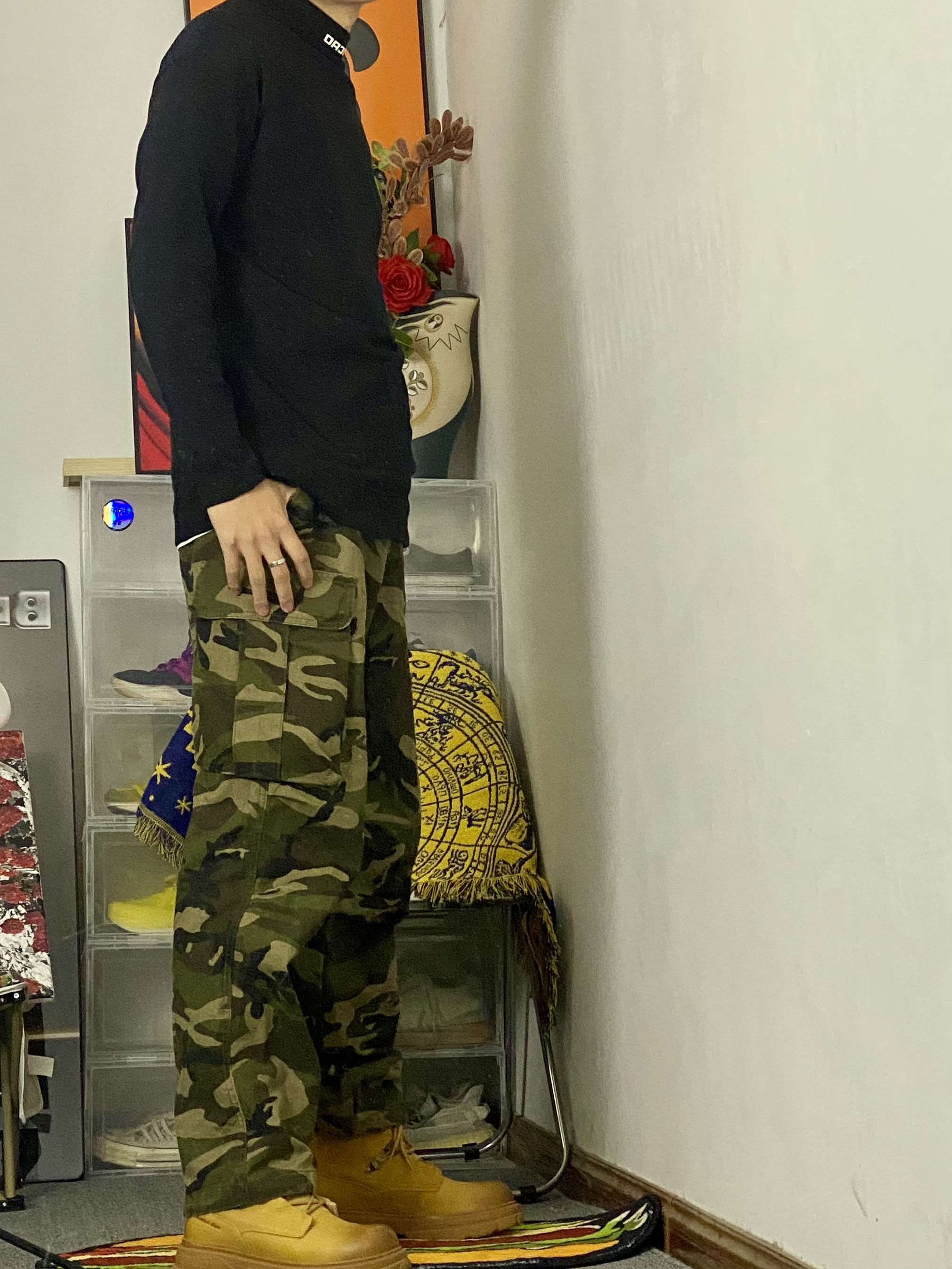 黑色加迷彩配上马丁靴基础又百搭 🥰今日冰美式穿搭分享 👔 衣服是 一件百搭基础加绒T恤 内搭必不可少 脖领小Logo设计时尚潮流 加绒材质上身穿起来感觉很舒服‼️ — 👖 一件迷彩牛仔直筒裤 裤子百搭 面料厚实 厚实的面料,让防风也不错 🤳 — 👟 马克华菲 一双黄色马丁靴 秋冬出门必备 加绒款也不怕冻脚🥰 身高/体重:178/130 👔xl