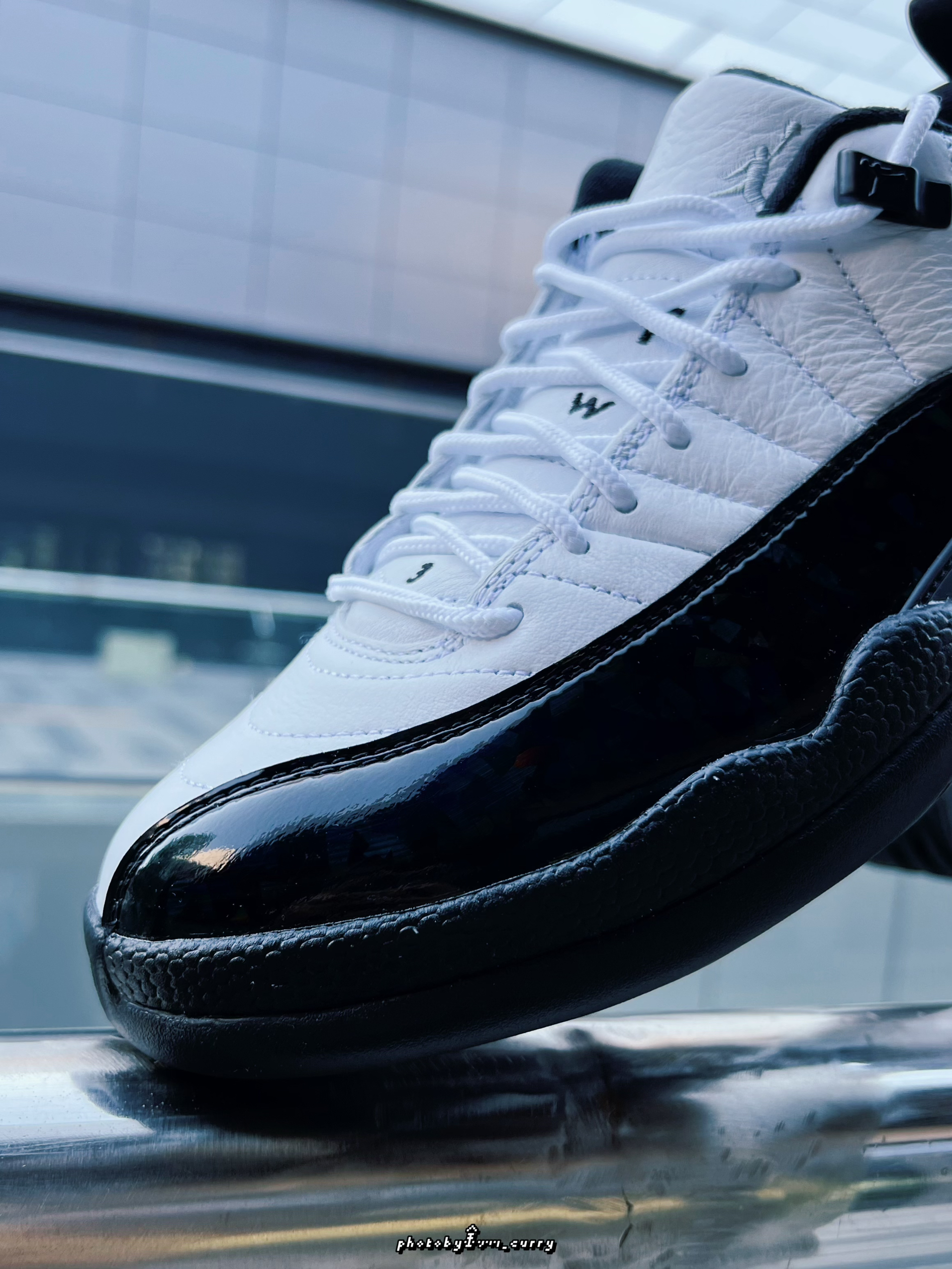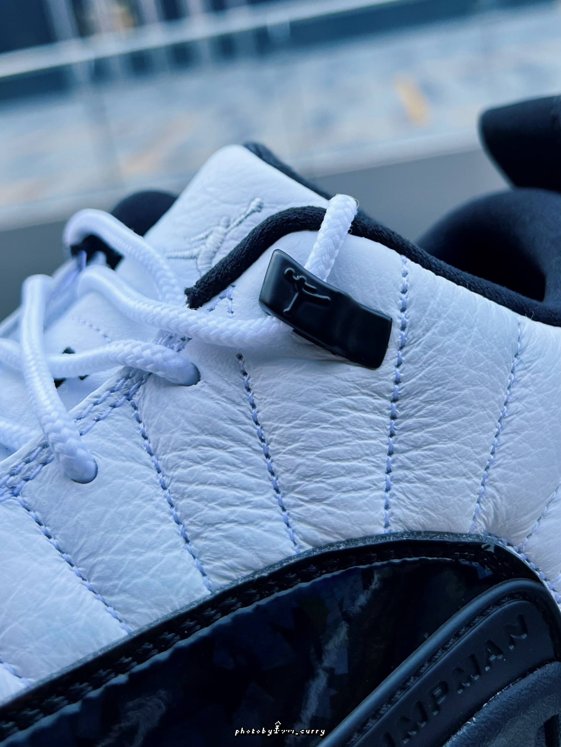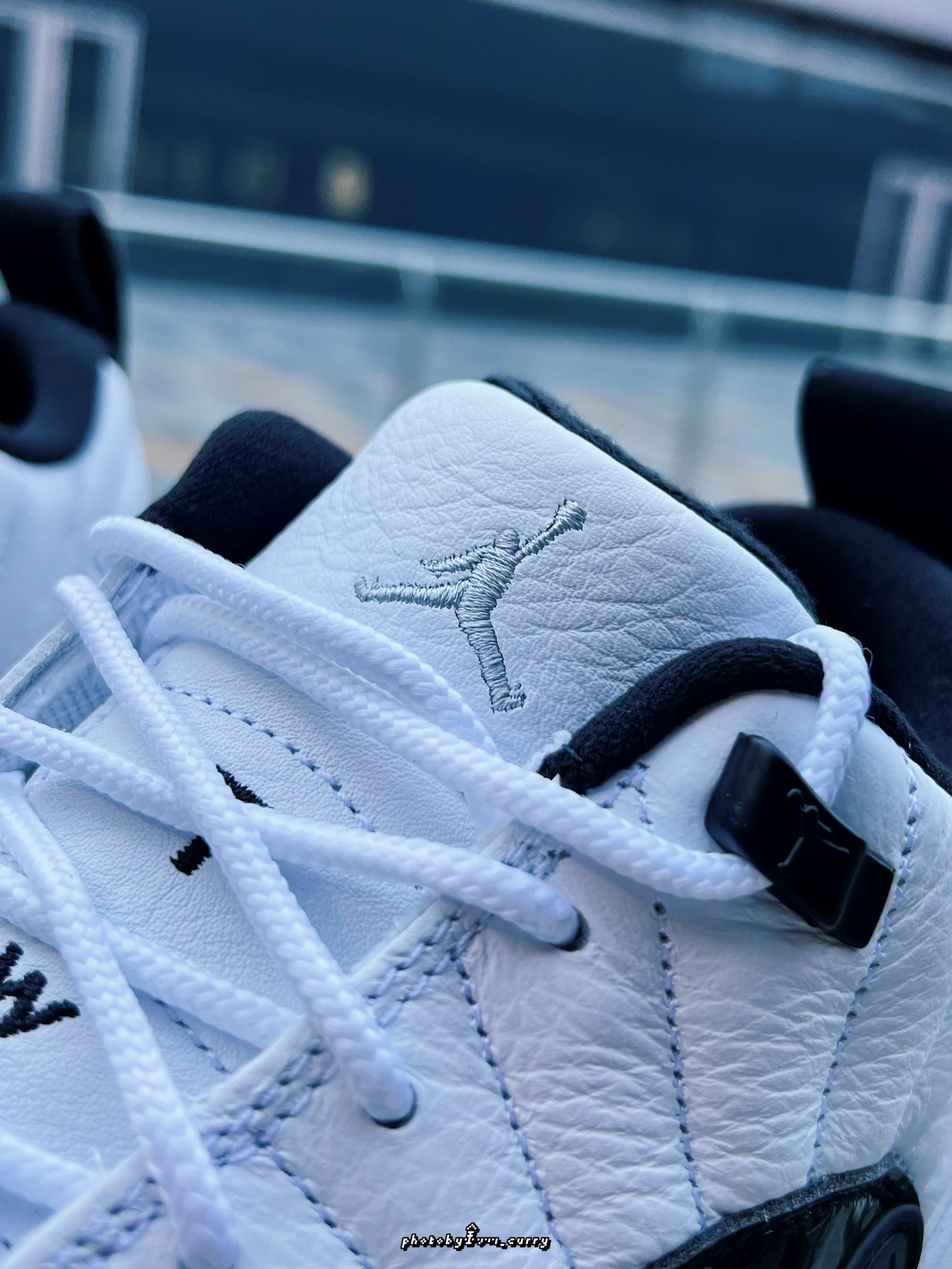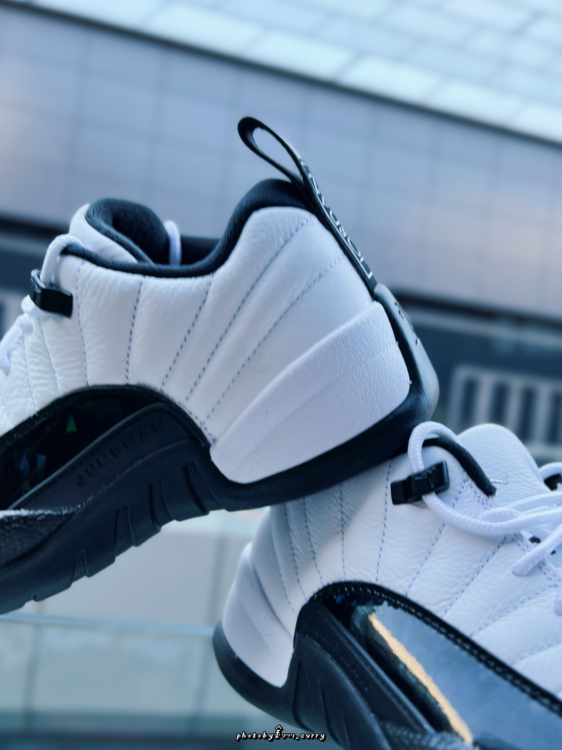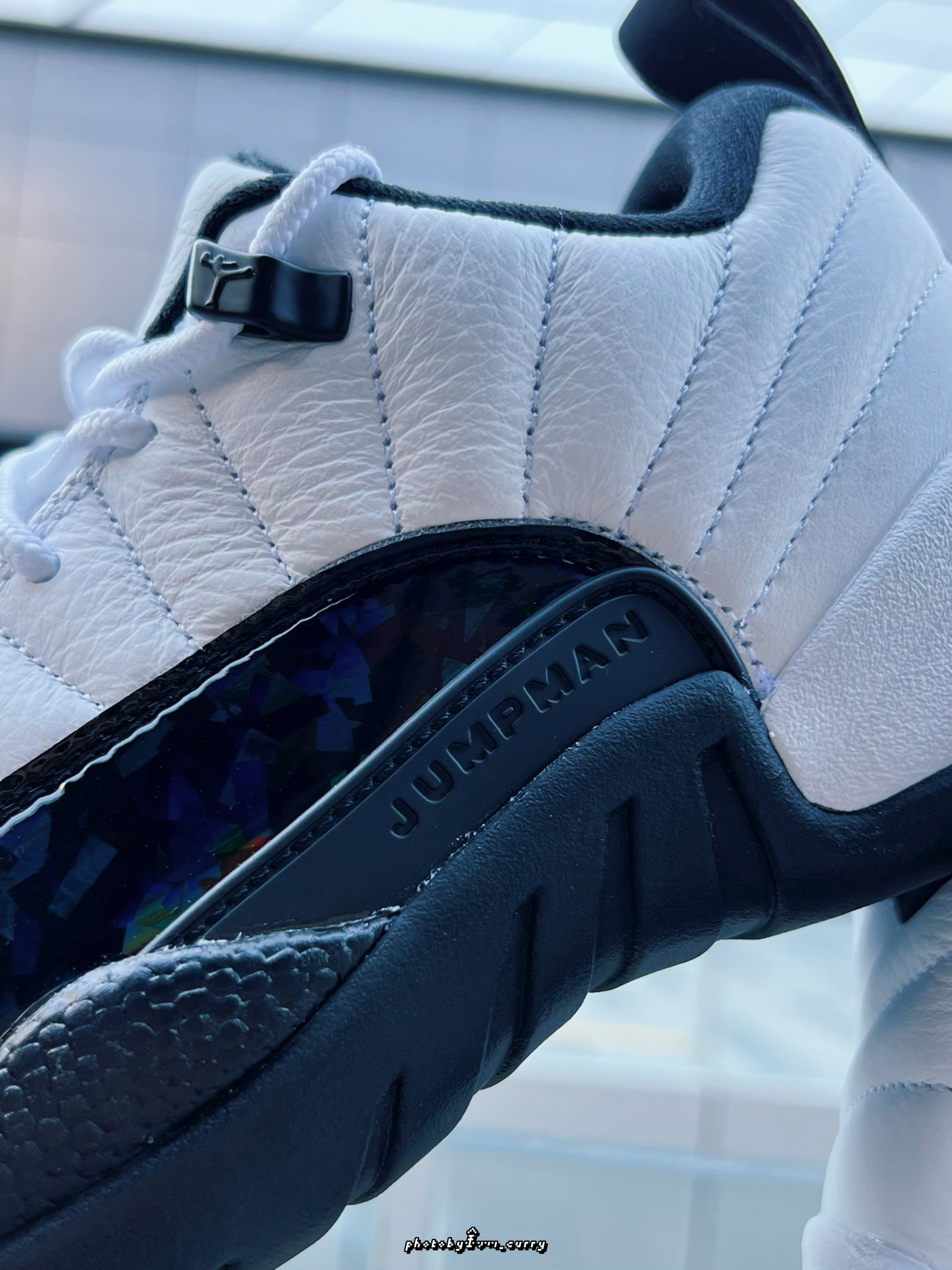 最近的天气很适合穿像AJ12这种大棉鞋!分享一款我新入手的,这双是Low版整体的保暖效果相较于高帮版略微逊色一点,但是性价比还是很高滴~ AJ12大中华地区25周年限定款,又被叫做东单配色!不得不说这双的名字还是很有比格的!整体黑白色拼接设计,视觉效果极具辨识度!但是整双鞋的细节很一般,也被很多人说没诚意!鞋面漆皮材质,并且是带有反光碎片加持,侧面白色皮革材质,质感还是相当不错的!后跟部分左右脚...