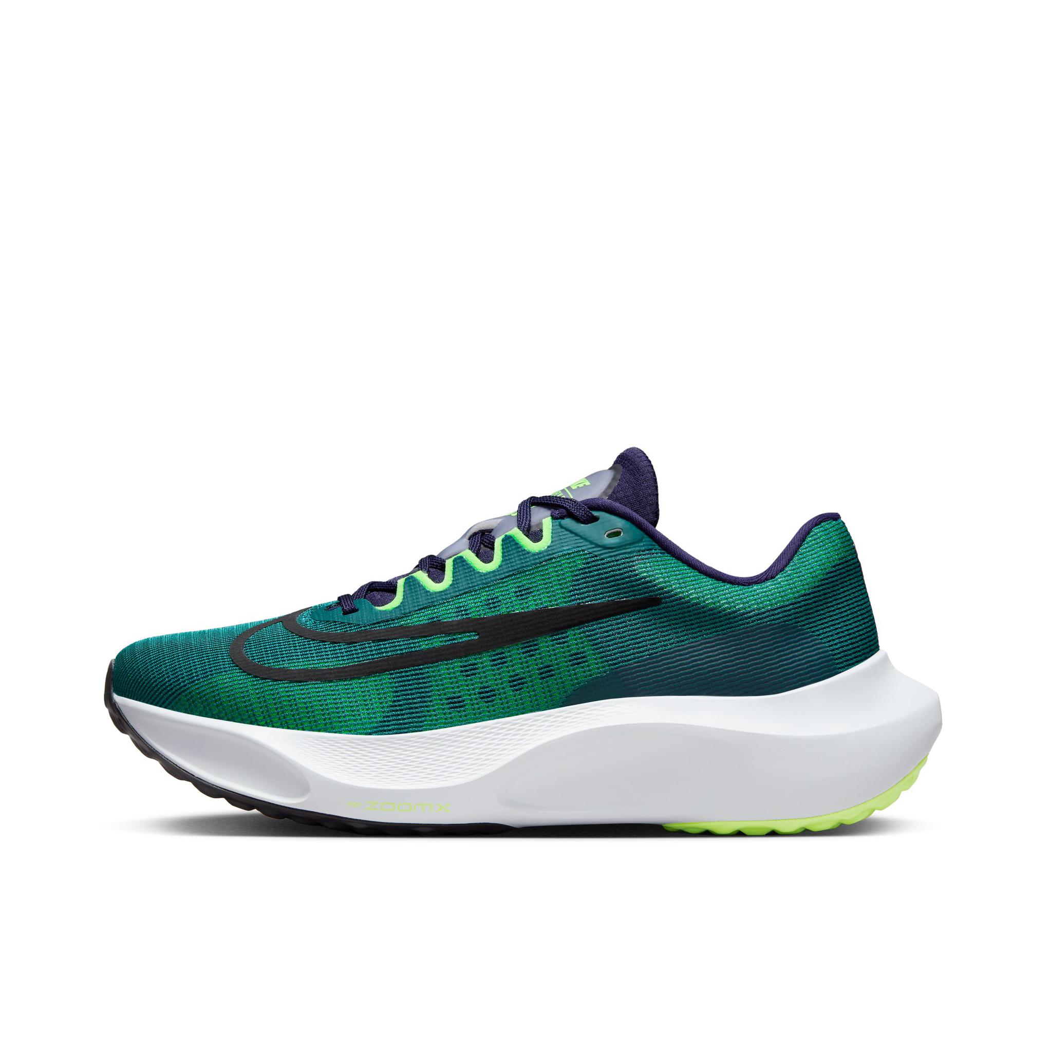 👟Nike Fly 5 跑鞋 ✨Fly 5近期出的配色真的很绝!鞋子整体以绿色为主,个人感觉更像是青色,荧光绿点缀,很亮眼但又低调沉稳的配色。 🌸鞋面采用的网眼材质,透气性是不错的。中底是ZoomX泡棉材质➕轻量级SRO2泡棉载体,内置的碳板让鞋子更有支撑感。 🌟尺码方面按平常穿的选择就可以,加宽的鞋面对宽脚整体还是友好的~