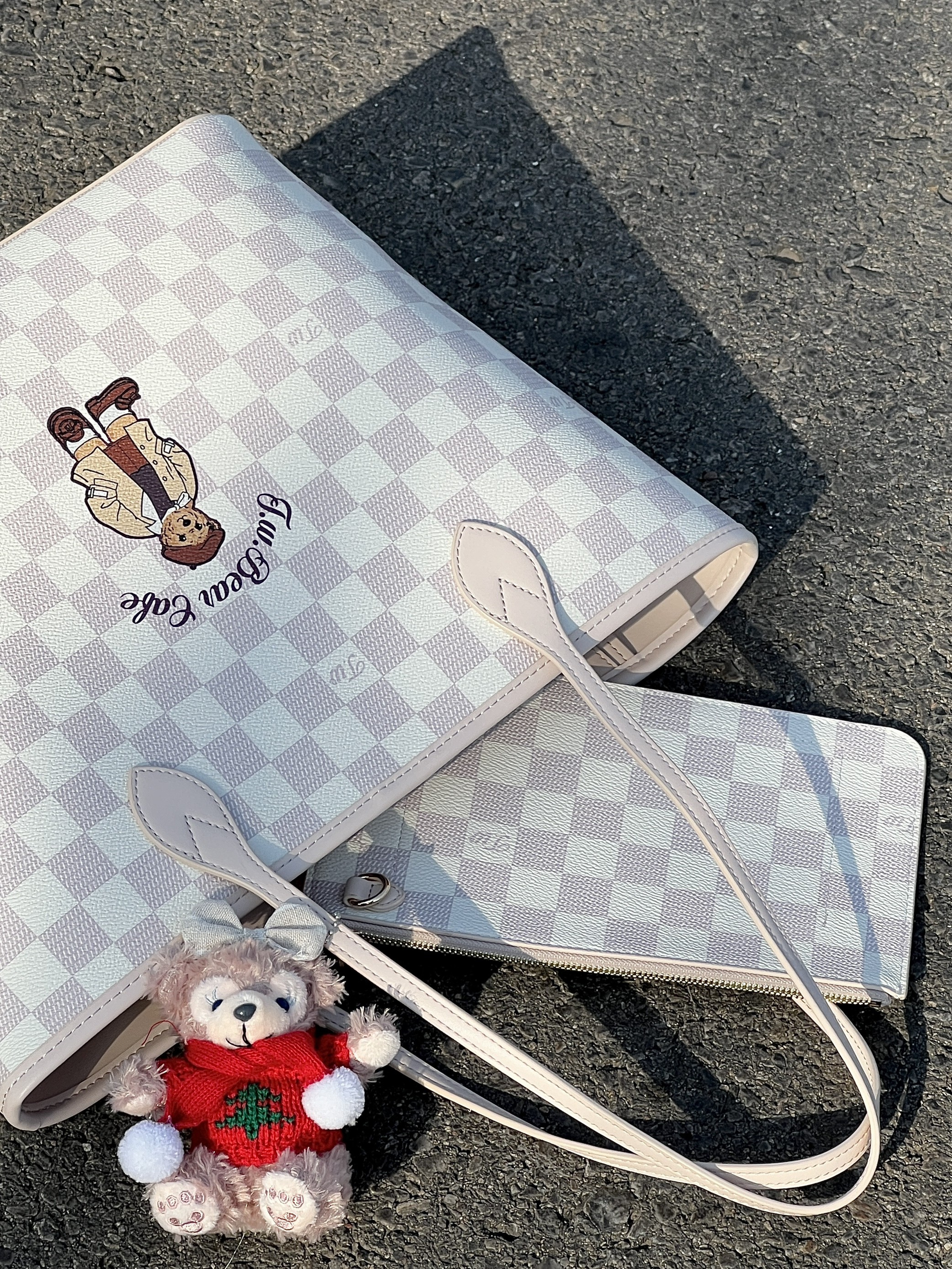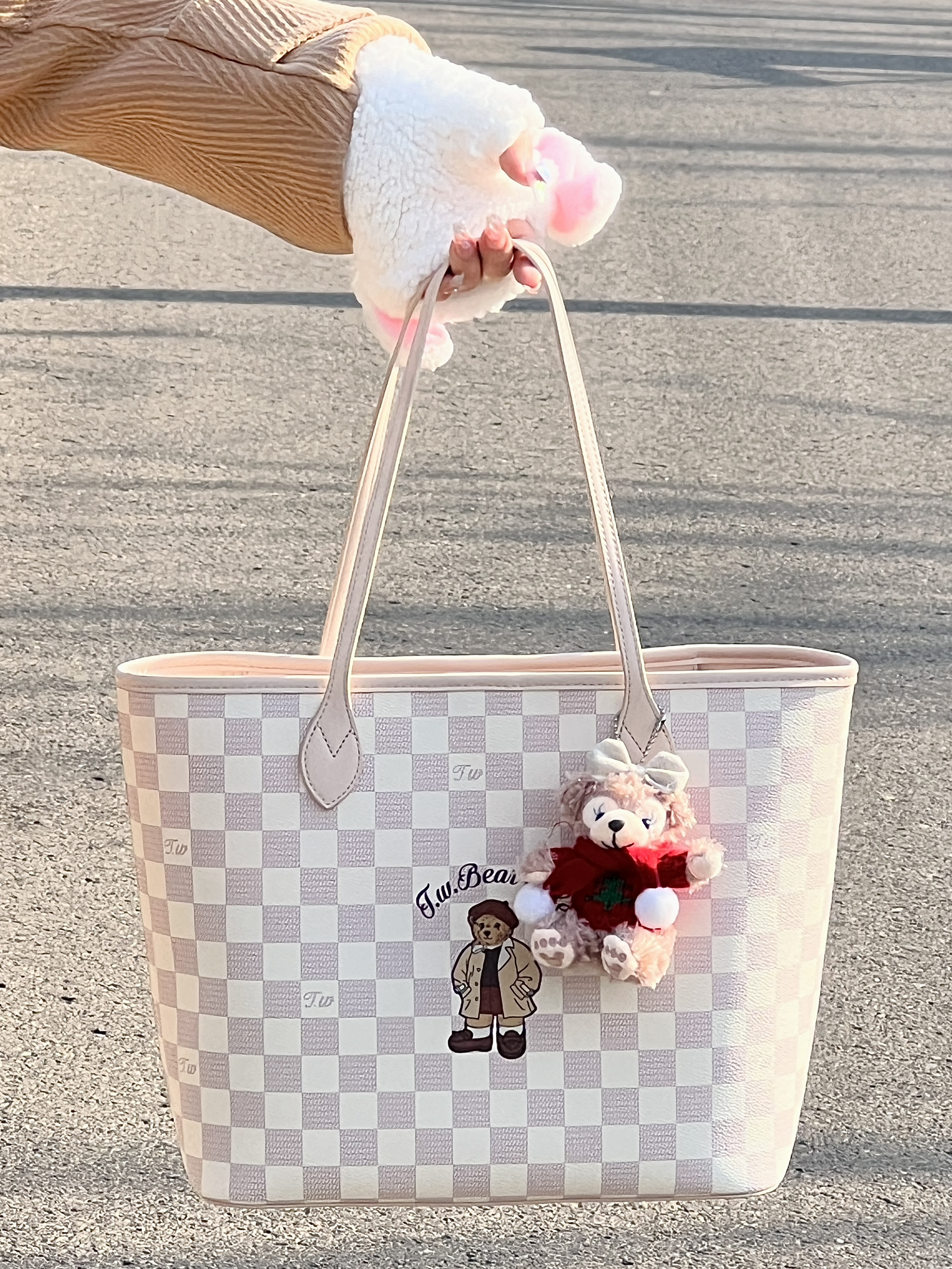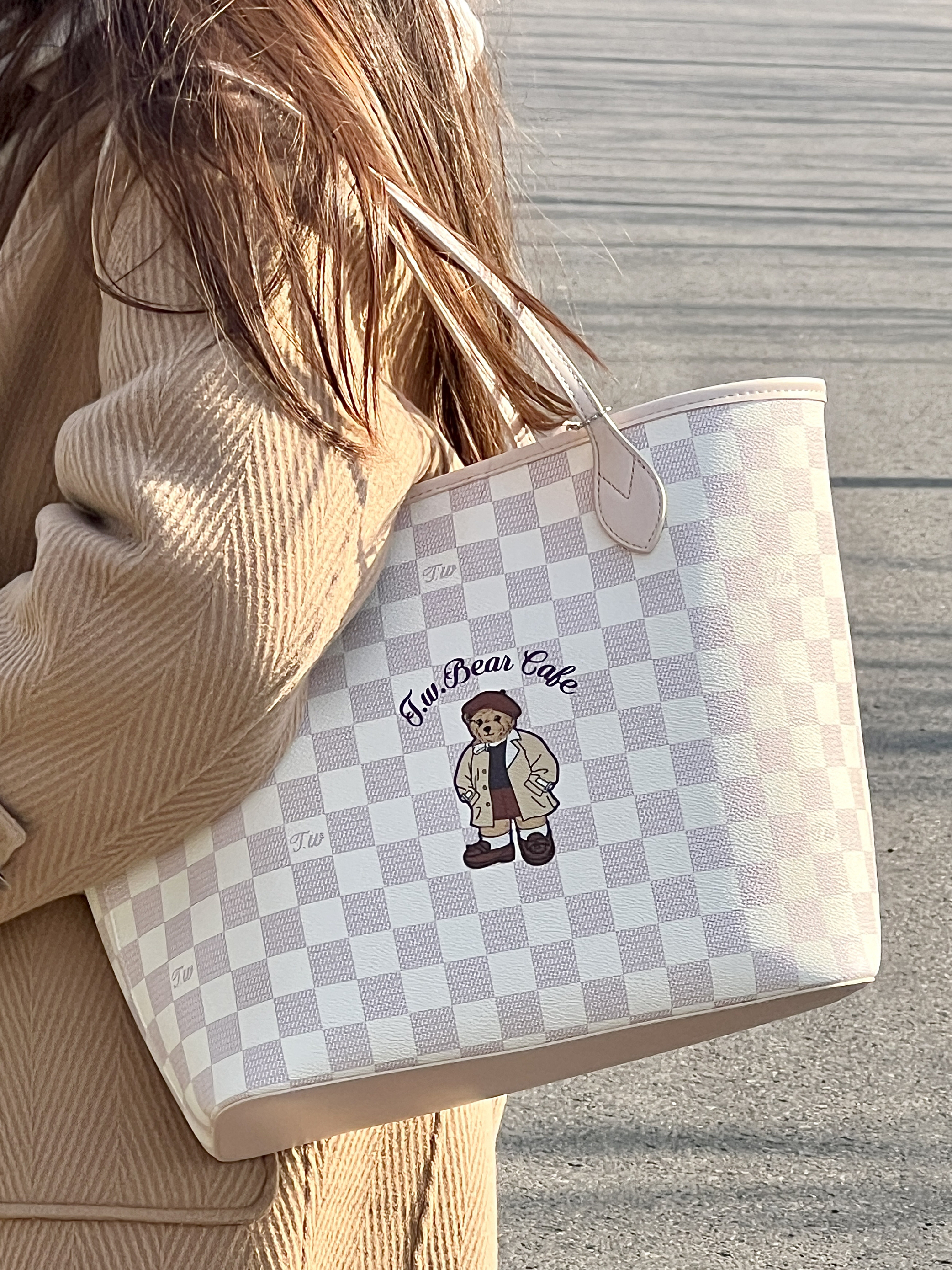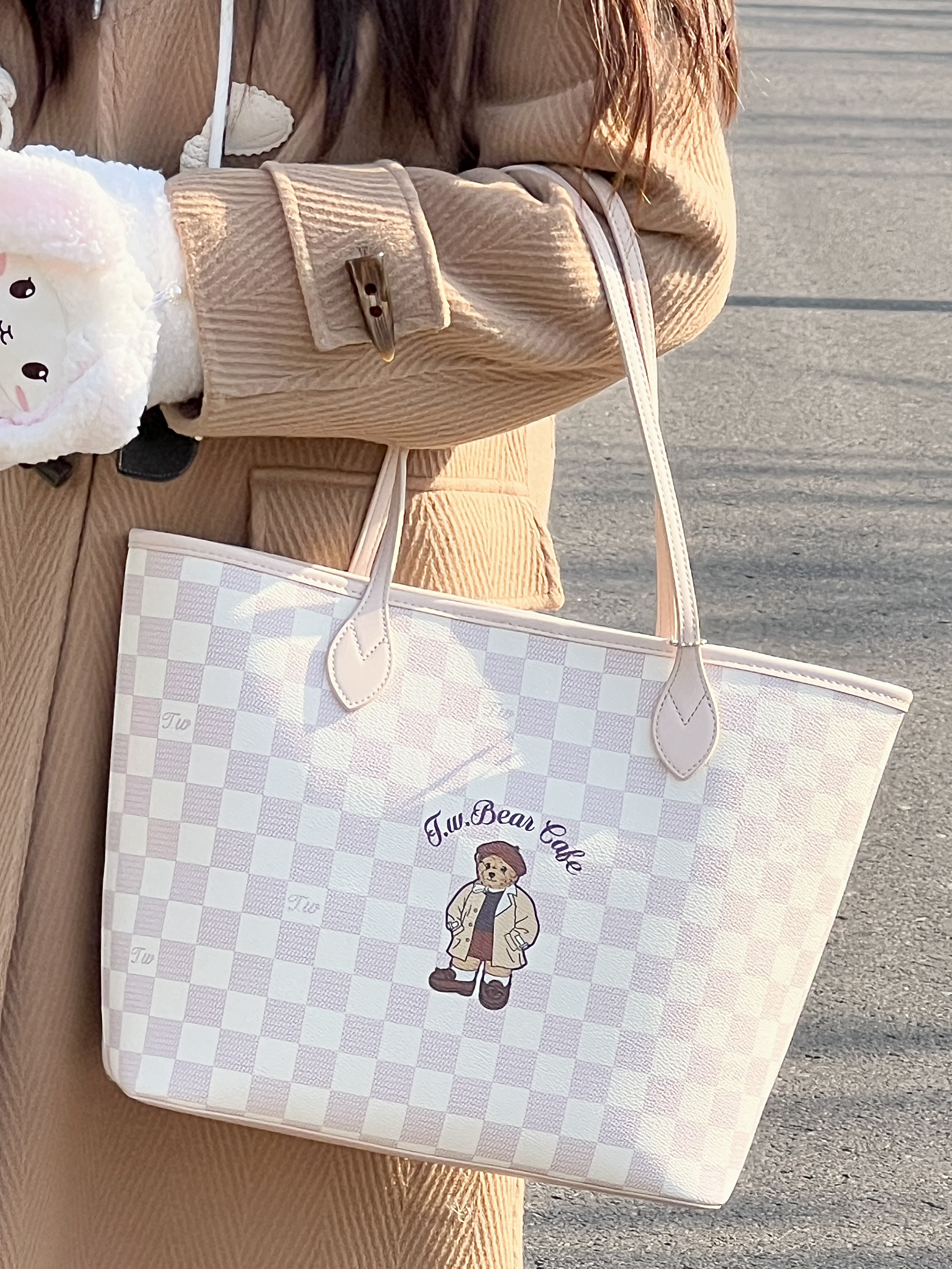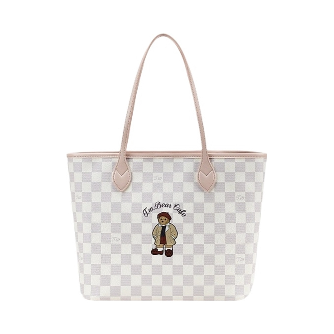 介个棋盘格小熊包包真的好可爱 质感嘎嘎奈斯 还送了子母包~ 荔枝纹面料耐脏也好打理~ 容量敲大!能放下书本电脑之类 而且底部有支撑不会塌哦 一年四季都可背 百搭不挑衣服!