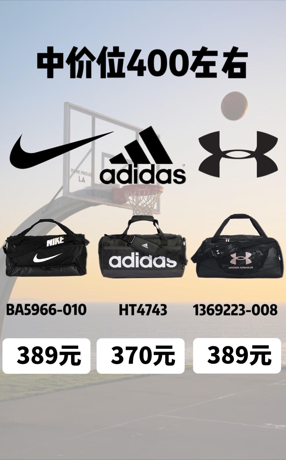 &低价位 200元左右 ☝️耐克 货号:BA5957-010 价格:184元 ☝️阿迪达斯 货号:HT4759 价格:248元 ☝️安德玛 货号:1369221-001 价格:209元 &中价位 400元左右 ☝️耐克 货号:BA5966-010 价格:389元 ☝️阿迪达斯 货号:HT4743 价格:370元 ☝️安德玛 货号:1369223-008 价格:389元 &高价位 500元以上 ☝️...