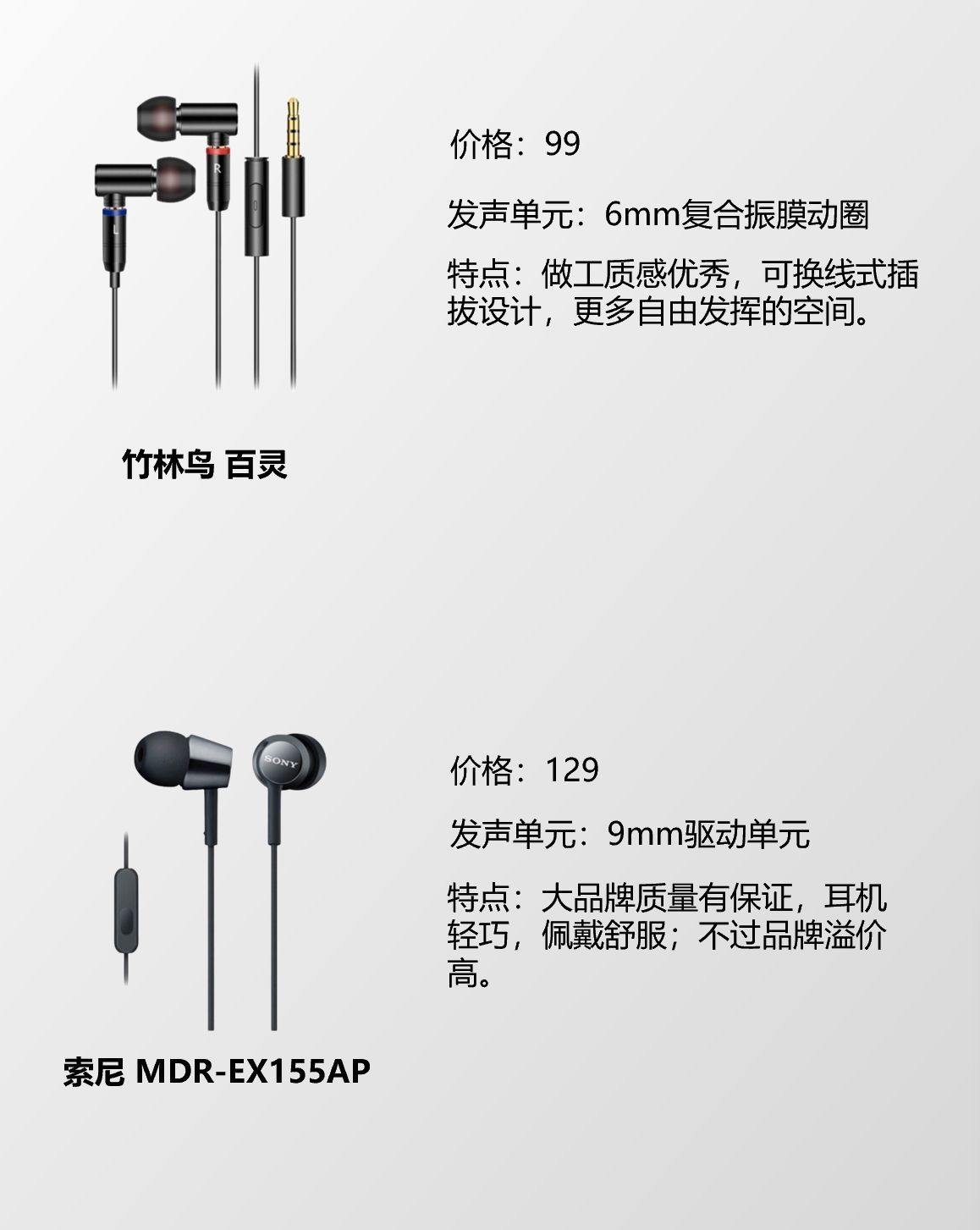 本篇笔记关联了Sony/索尼 MDR-EX155AP 入耳式 有线 耳机 带麦 立体声 重低音 通话 高音质 浅蓝色、SIMGOT/兴戈 桶鲨 EW100 入耳式 有线耳机 游戏音乐 LCP振膜 双腔体动圈耳机电竞 白色、竹林鸟 百灵 入耳式 有线耳机 HIFI高音质 微动圈 曜石黑等商品,为用户提供真实的使用体验和购买参考。