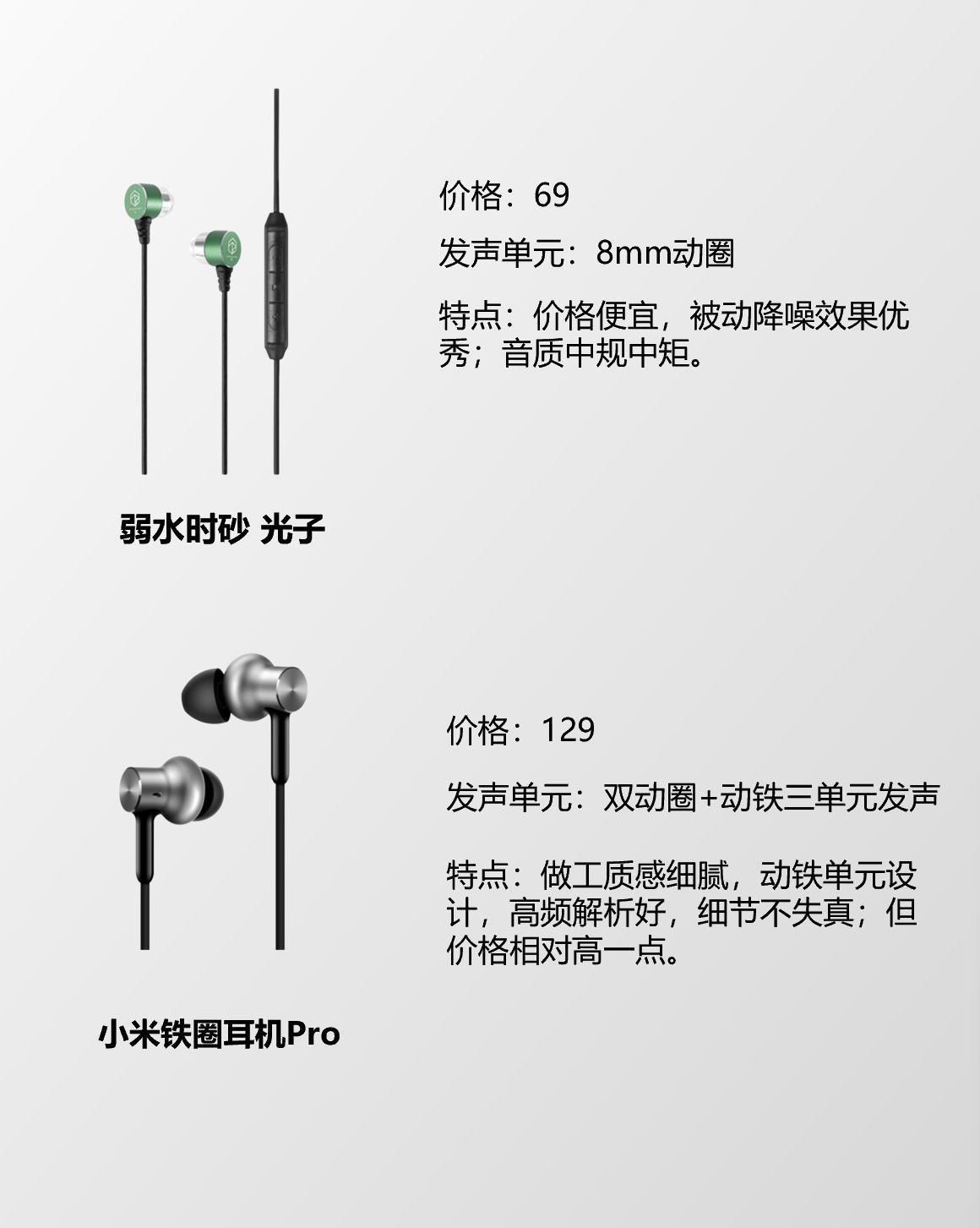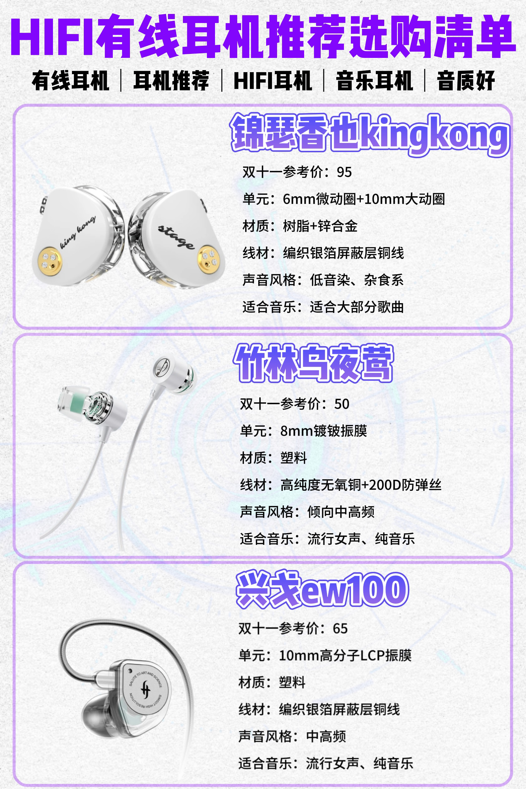 有线耳机怎么选? 下面找了几款给大家对比一下 ①兴戈EW100:小金标认证,整体均匀自然,层次感强;辅以绕耳式佩戴以及轻巧的机身,稳固舒适;性价比高。 ②漫步者HECATE GM260:小金标认证,音质优秀;线材高弹耐用;个人佩戴感受不是很好(效果因人而异)。 ③弱水时砂 光子:价格便宜,被动降噪效果优秀;音质中规中矩。 ④小米铁圈耳机Pro:做工质感细腻,动铁单元设计,高频解析好,细节不失真;但...
