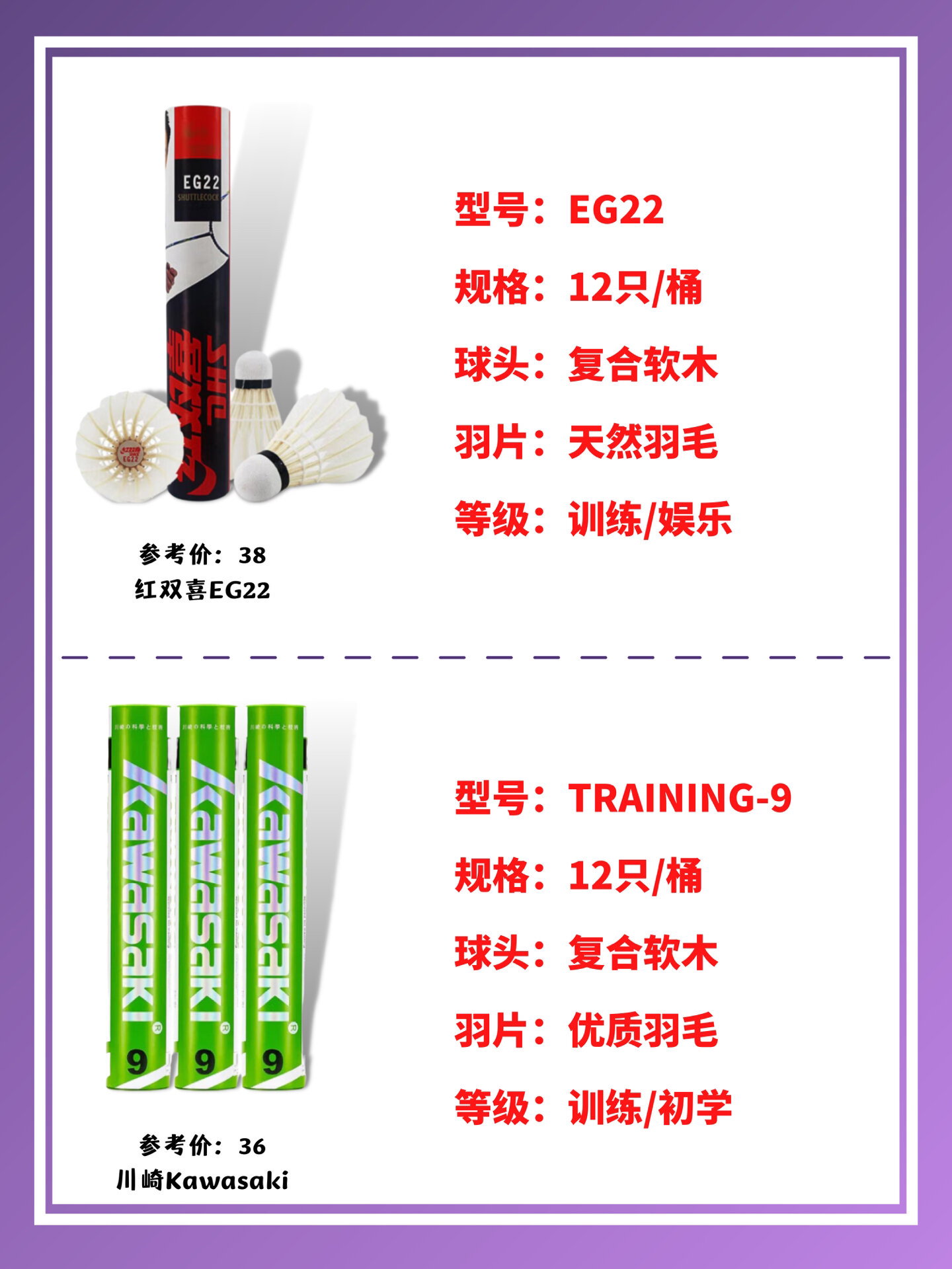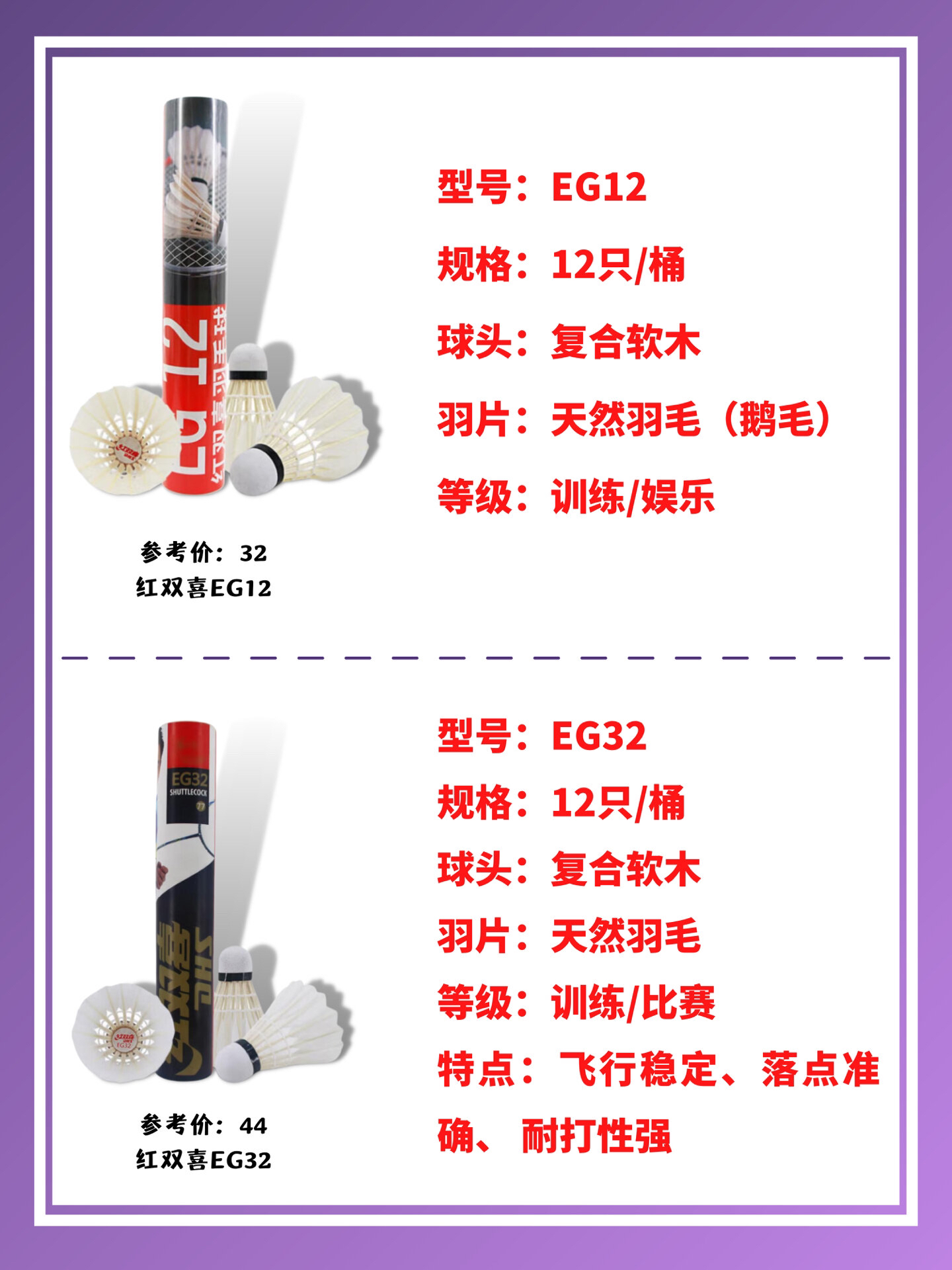 羽毛球推荐|耐打平价便宜|冬季入门必备‼️|||50元以下平价羽毛球合集,新手必看,入门平价款建议收藏分享 红双喜羽毛球EG12 12只装 | 参考价格 32 红双喜羽毛球EG32专业比赛球 12只装 | 参考价格 44 红双喜羽毛球EG22专业训练球 12只装 | 参考价格 38 川崎Kawasaki羽毛球 12只装 | 参考价格 36 威克多VICTOR 胜利羽毛球 12只装 | 参考价格 4...