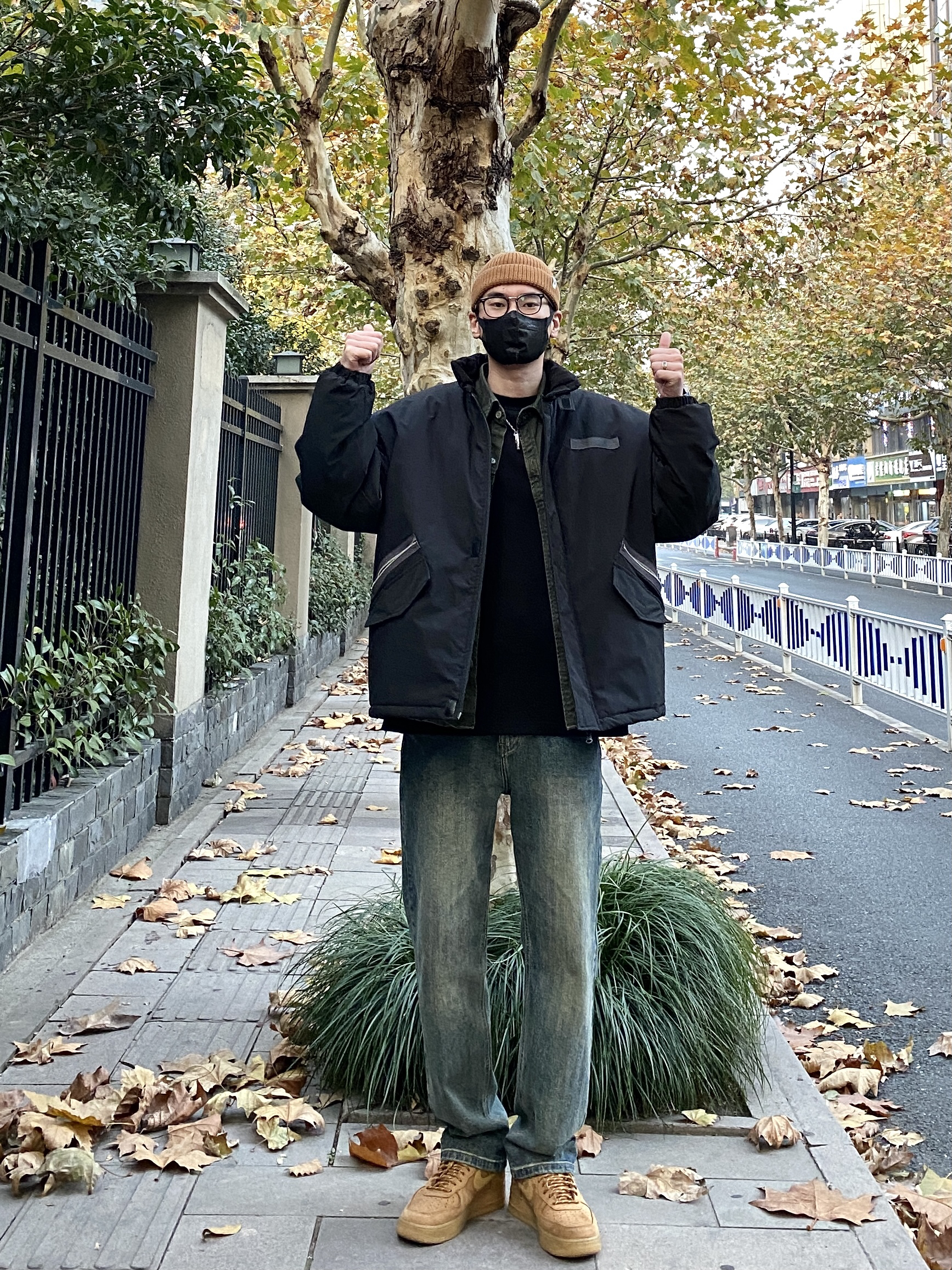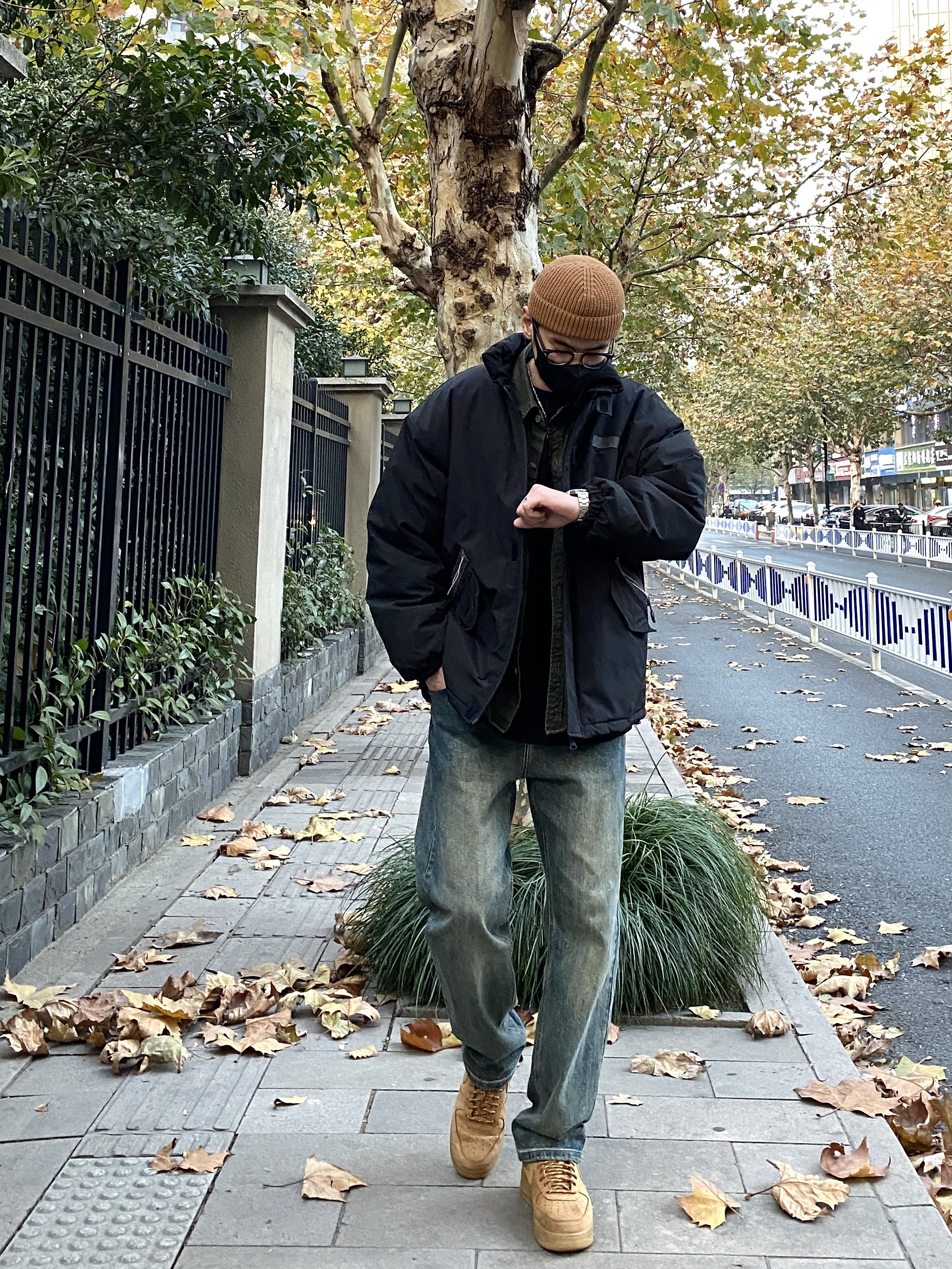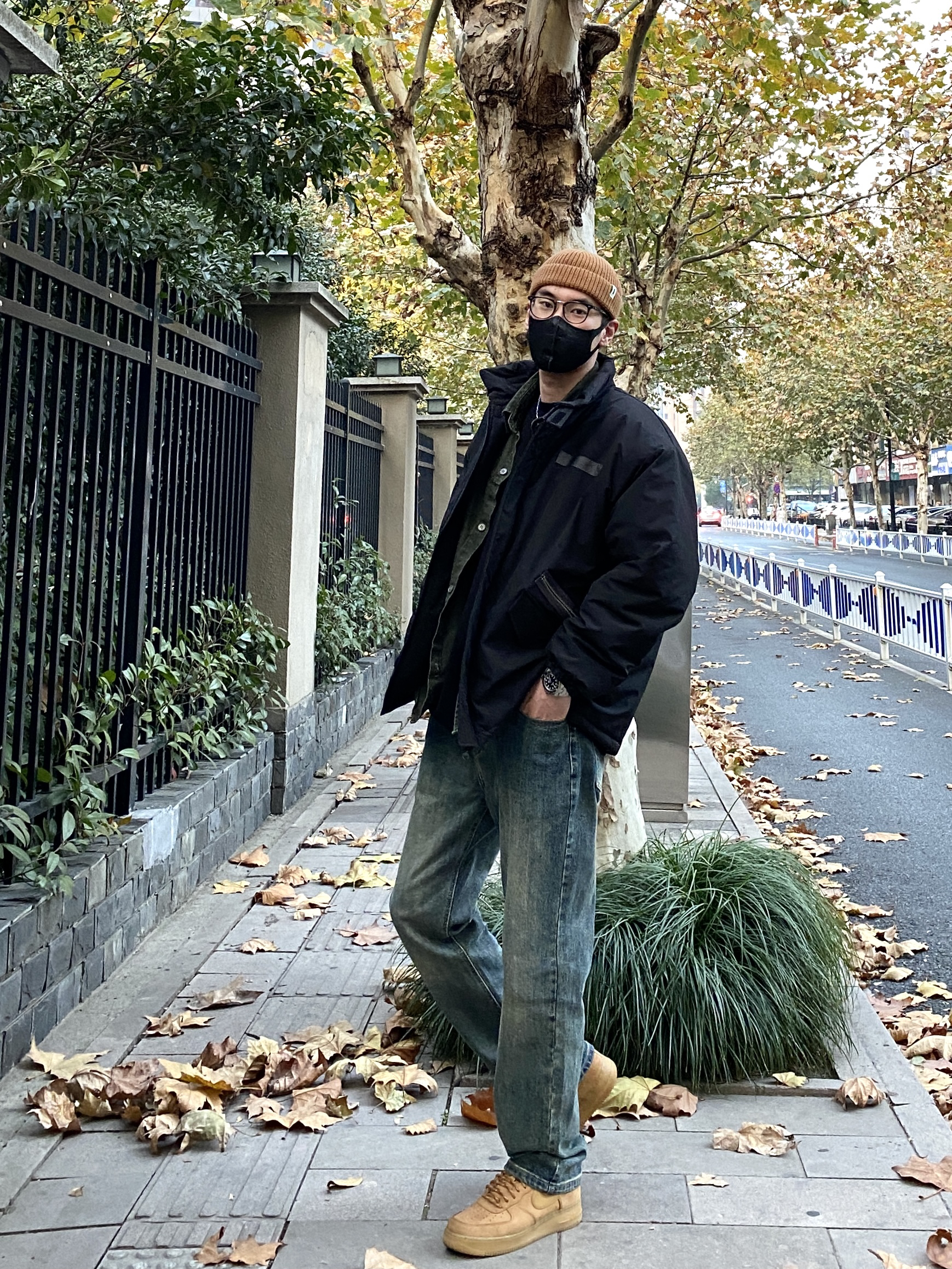 今天这套先用军绿色做旧工装衬衫做叠穿,裤子选择不挑腿型的水洗直筒牛仔裤,鞋子上脚经典百搭的小麦色af1,接着套上黑色宽松阔版多口袋立领棉服夹克,最后戴一顶姜黄色线帽,OK,出门看看搭配效果吧! - 今日穿搭 衣服裤子:NICE LILI 鞋子:AF1小麦