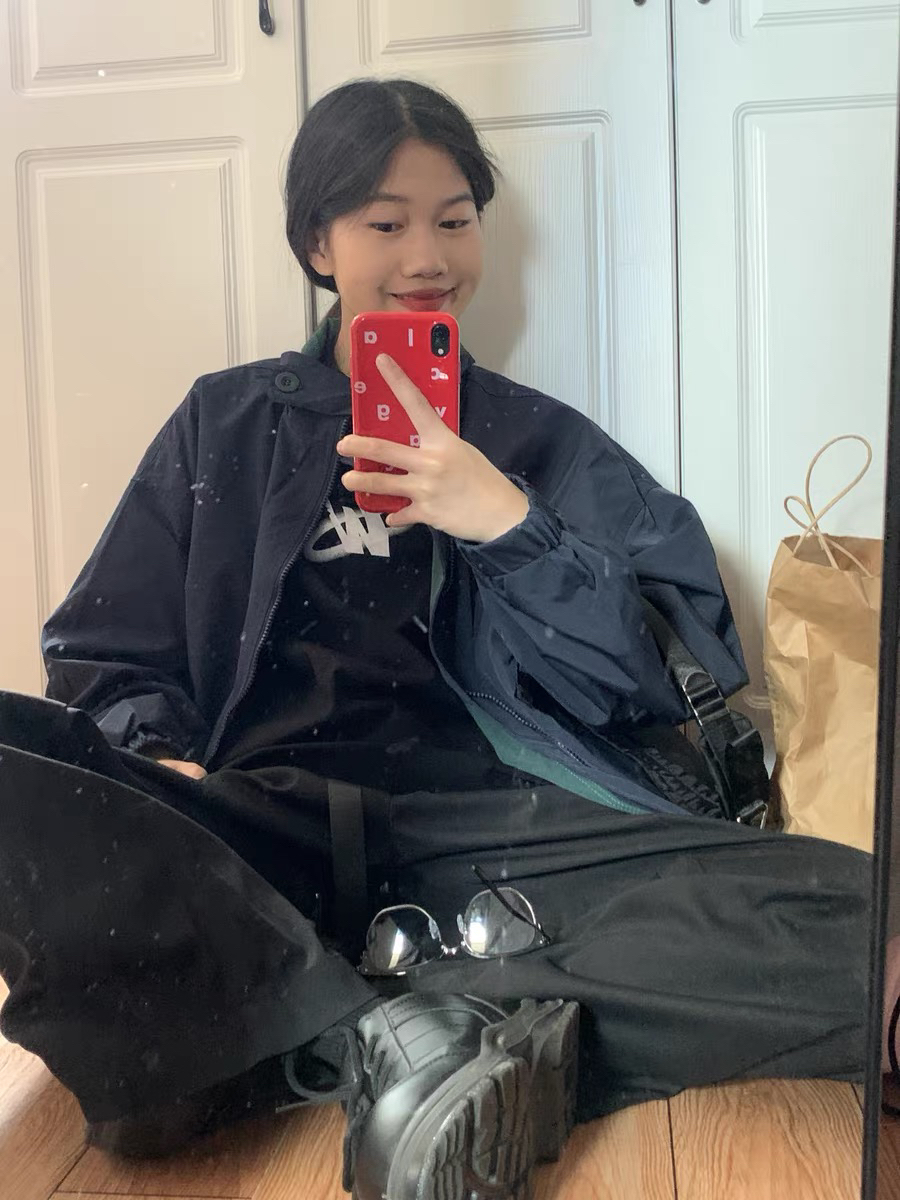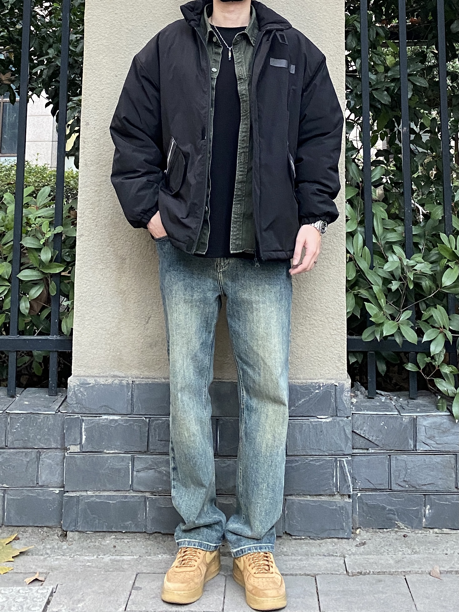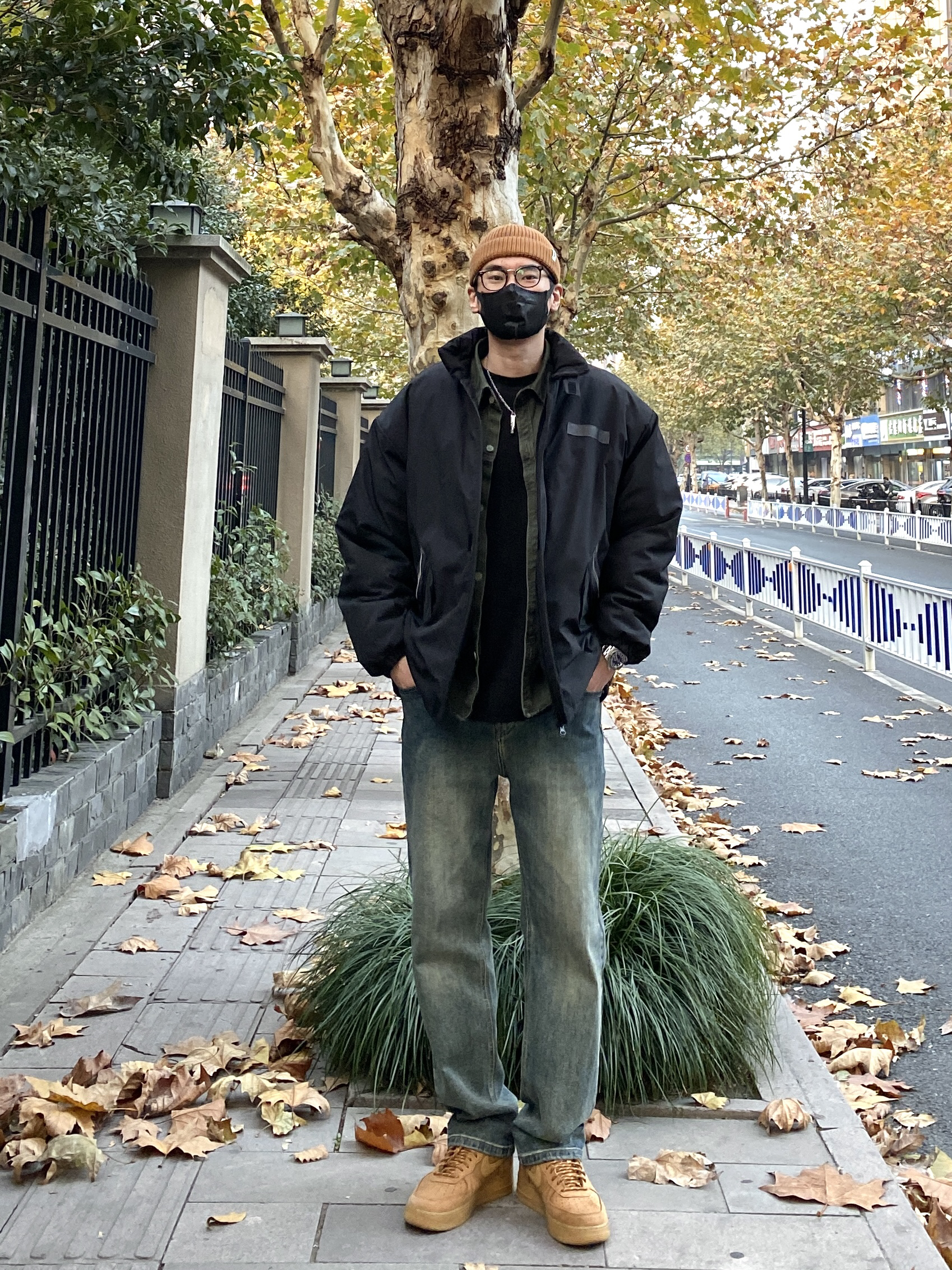 今天这套先用军绿色做旧工装衬衫做叠穿,裤子选择不挑腿型的水洗直筒牛仔裤,鞋子上脚经典百搭的小麦色af1,接着套上黑色宽松阔版多口袋立领棉服夹克,最后戴一顶姜黄色线帽,OK,出门看看搭配效果吧! - 今日穿搭 衣服裤子:NICE LILI 鞋子:AF1小麦