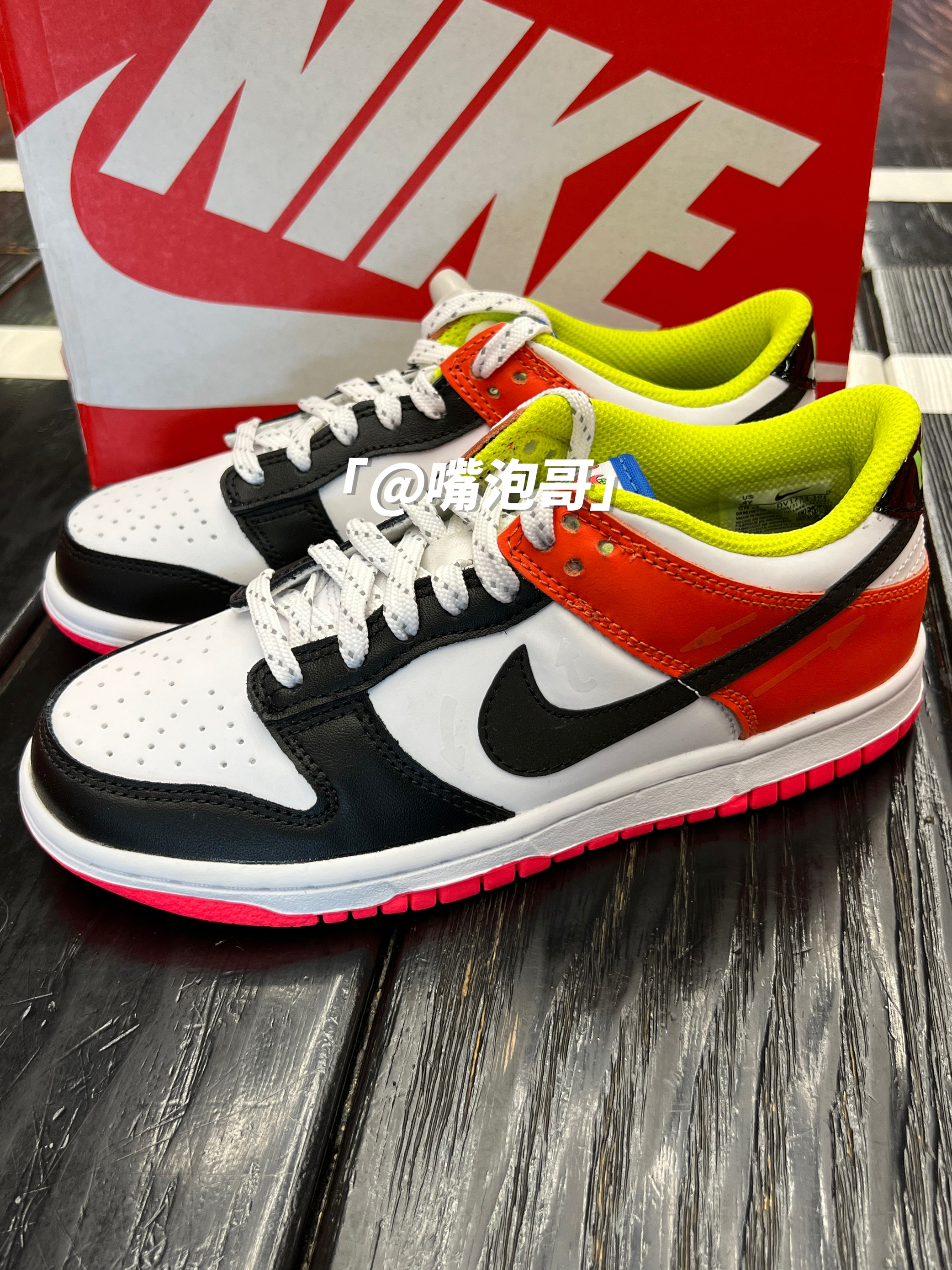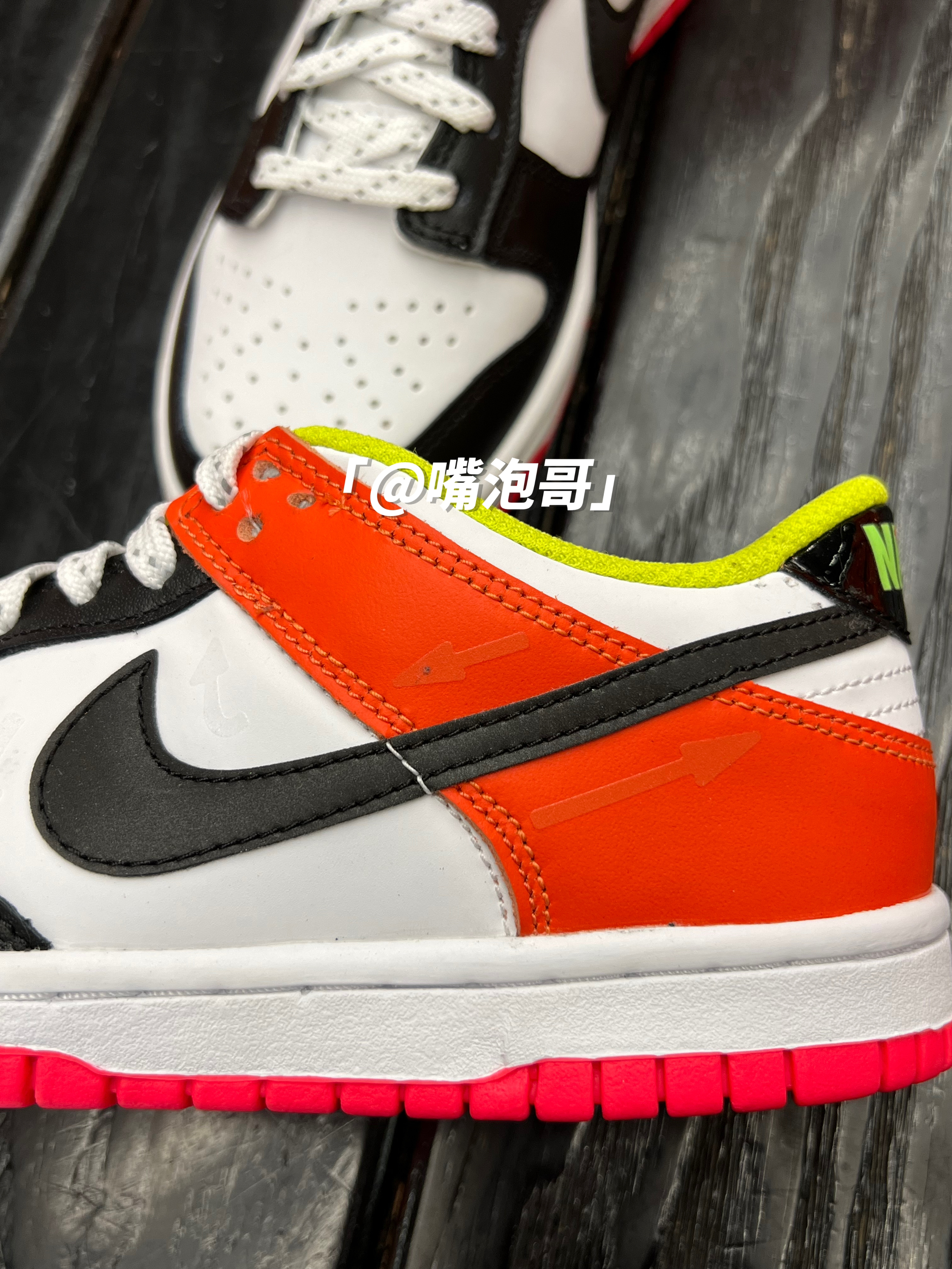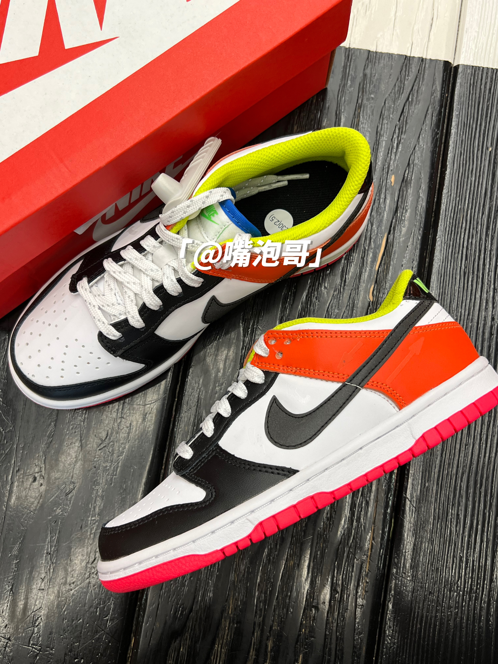 👟:Dunk Low Cartwheel 彩色拼接 简介: 鞋款是低帮的Dunk鞋型,整体外观还是比较比较具有辨识度,运用多了多种不同颜色组合而成,比较的炫酷,皮革制作的鞋面与织物型鞋舌的组合,又提升了整体穿着舒适度,不过脚感依旧会偏硬一些。 细节: 鞋面使用了复合皮革打造而成,鞋身前半段使用了白色与黑色的皮革拼接,具有百搭的熊猫配色效果,后跟及鞋帮处运用白色与橙色的组合,增添了活力感...