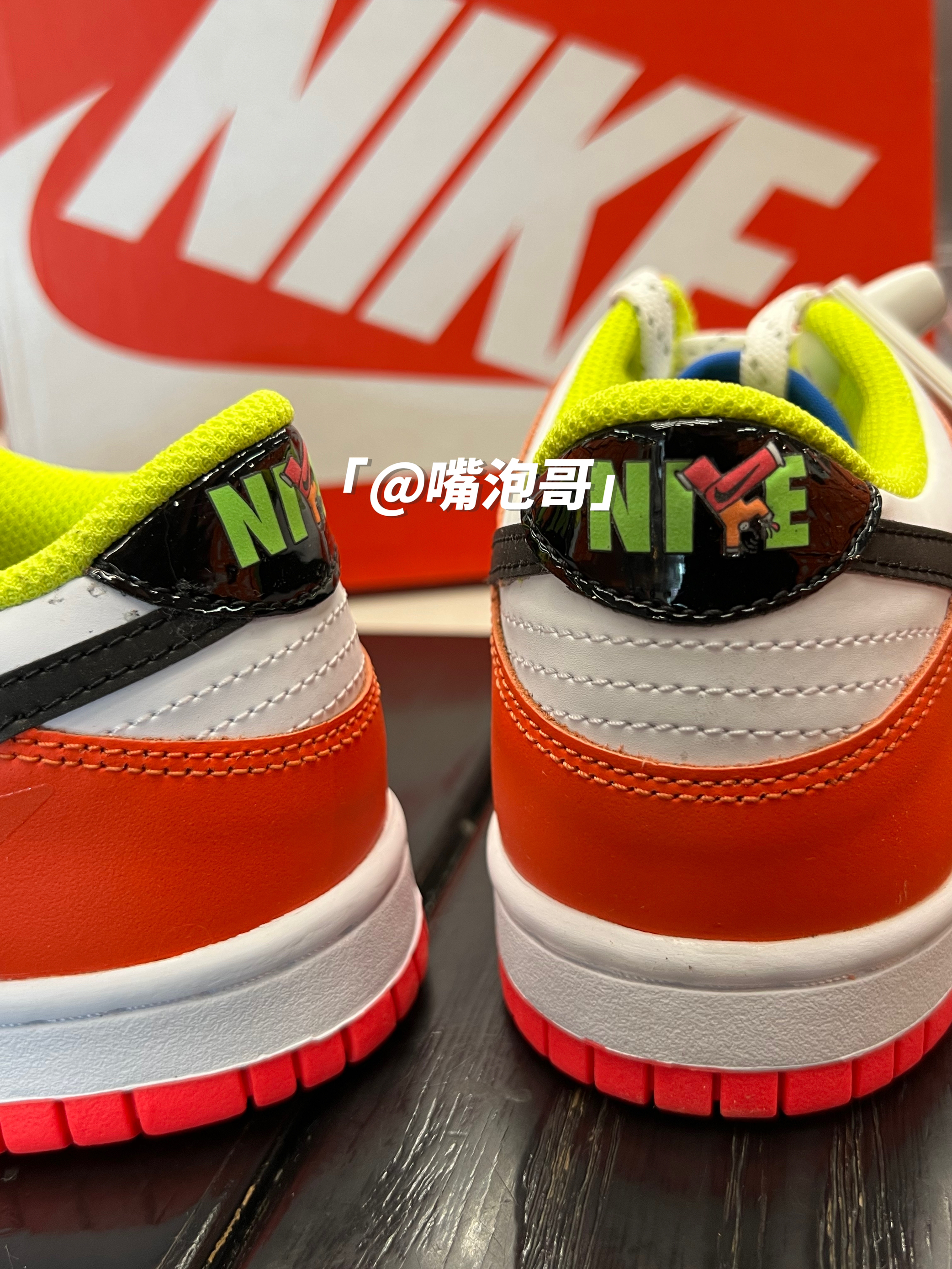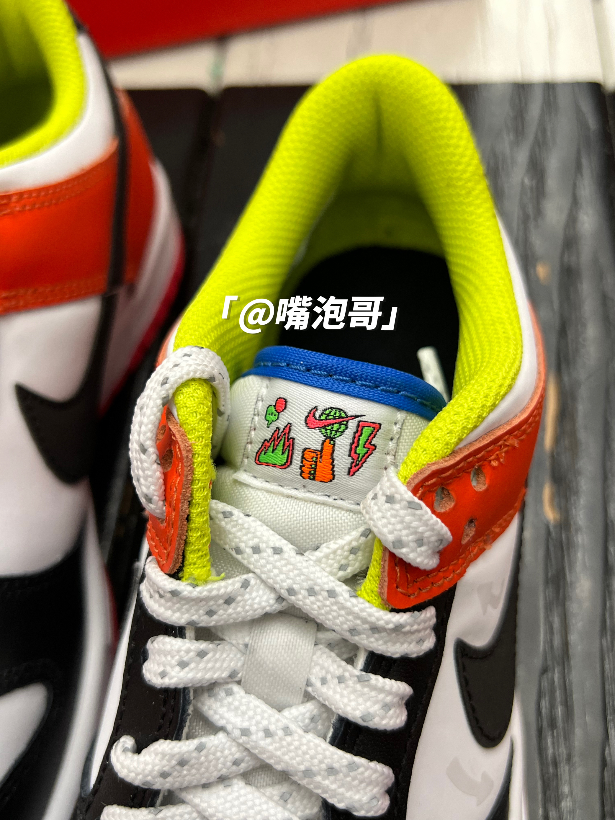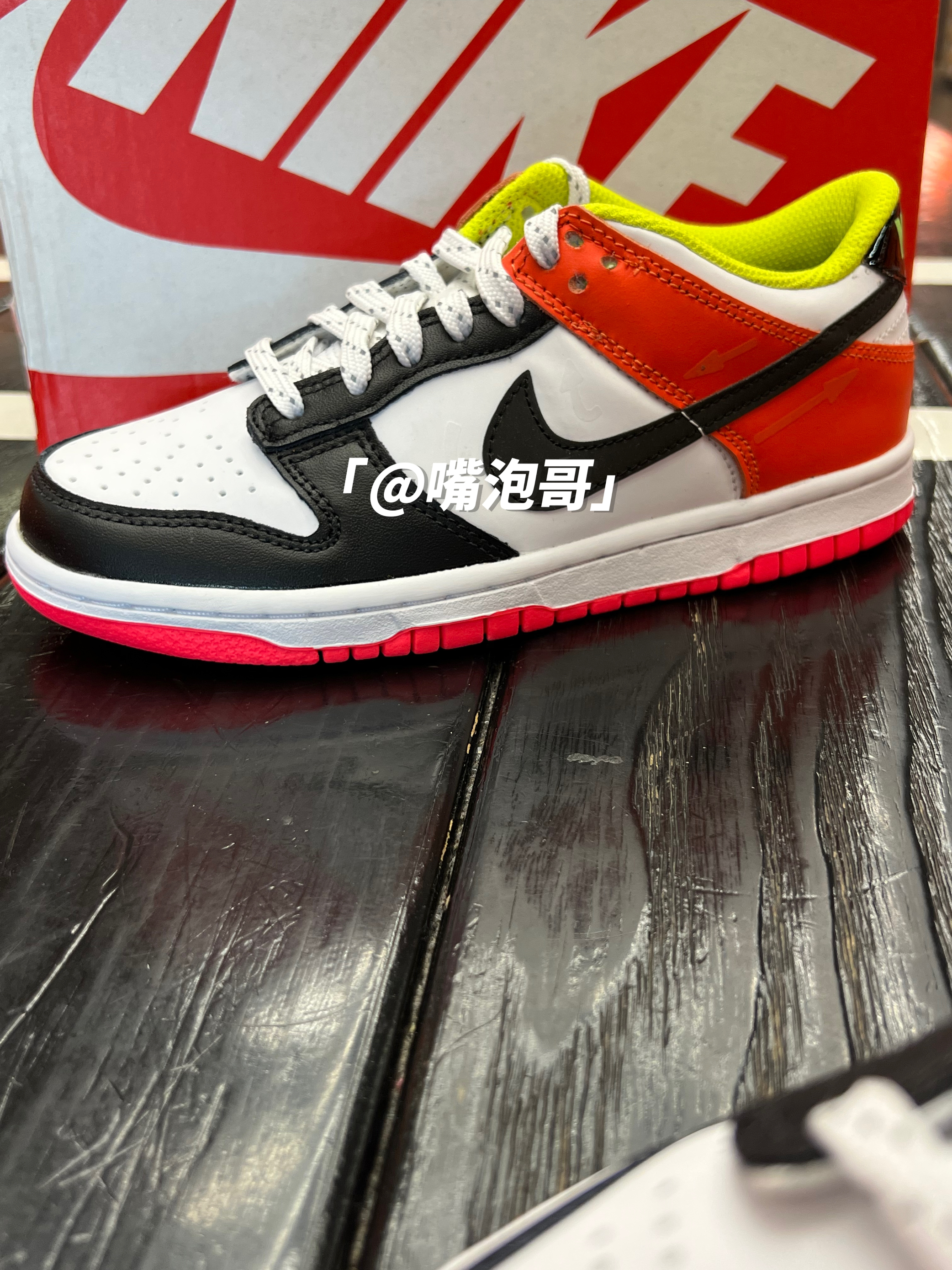 👟:Dunk Low Cartwheel 彩色拼接 简介: 鞋款是低帮的Dunk鞋型,整体外观还是比较比较具有辨识度,运用多了多种不同颜色组合而成,比较的炫酷,皮革制作的鞋面与织物型鞋舌的组合,又提升了整体穿着舒适度,不过脚感依旧会偏硬一些。 细节: 鞋面使用了复合皮革打造而成,鞋身前半段使用了白色与黑色的皮革拼接,具有百搭的熊猫配色效果,后跟及鞋帮处运用白色与橙色的组合,增添了活力感...