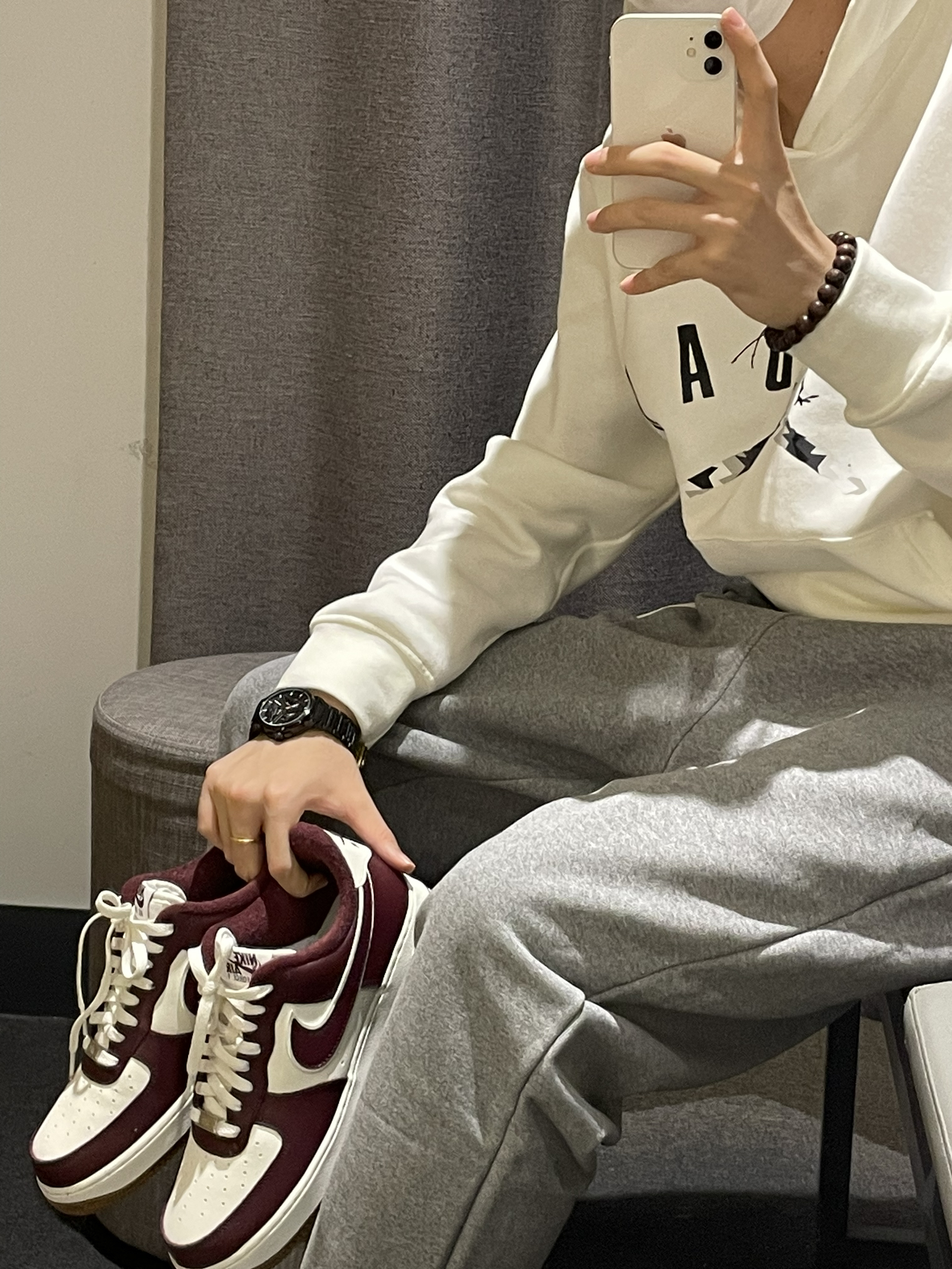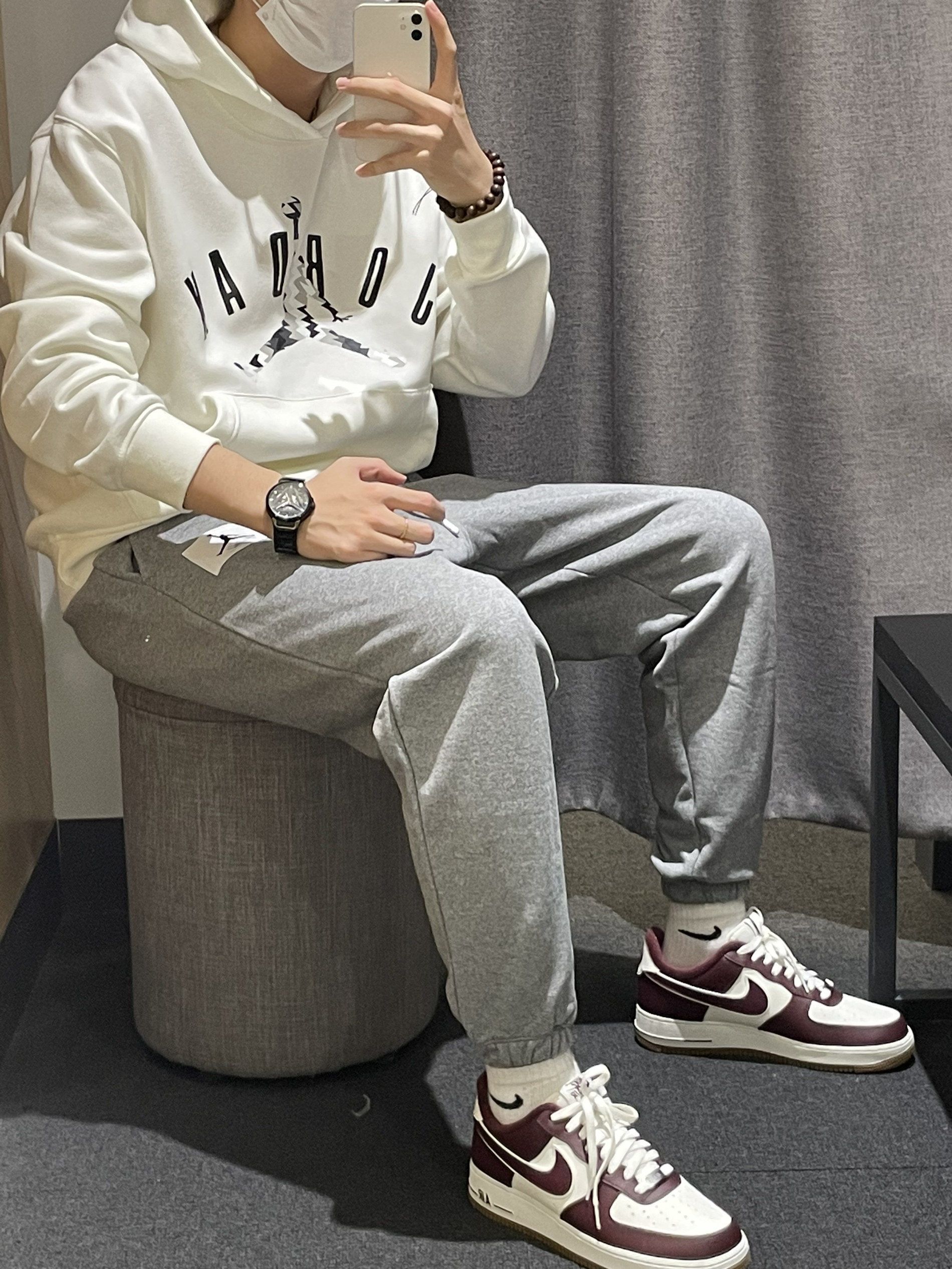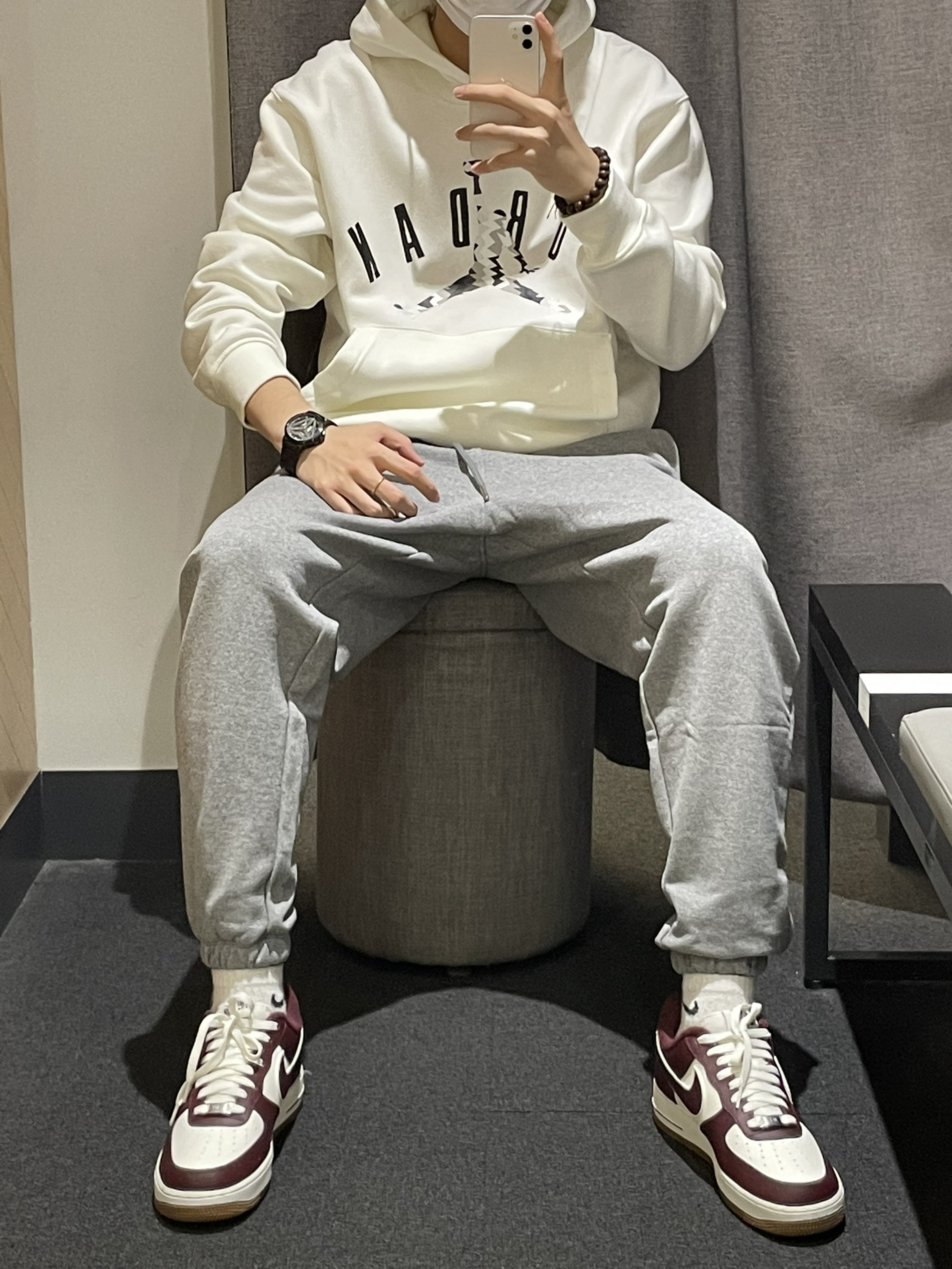 今天带来一身男孩子👦休闲穿搭推荐! 首先这件白色 Ai系列套头卫衣 内衬加绒 单穿叠穿都是非常不错的 面料舒适 版型宽松 搭配同系列灰色长裤 也是内衬加绒 👟鞋子是空军一号的酒红复古经典配色 易搭配