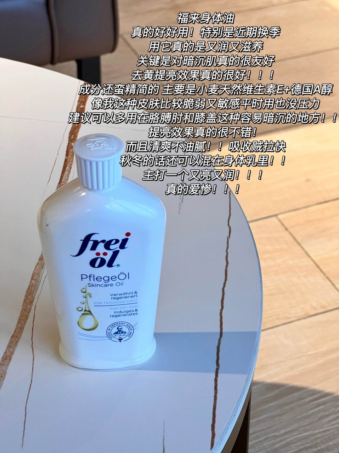 🛒好物名称:福来身体油 🤔推荐理由:福来身体油真的好好用!特别是近期换季用它真的是又润又滋养 关键是对暗沉肌真的很友好去黄提亮效果真的很好!!!成分还蛮精简的主要是小麦天然维生素E+德国A醇 我这种皮肤比较脆弱又敏感平时用也没压力建议可以多用在胳膊肘和膝盖这种容易暗沉的地方!!提亮效果真的很不错!而且清爽不油腻!!吸收贼拉快秋冬的话还可以混在身体乳里!! 主打一个又亮又润!!!真的爱惨!! 🛒好...