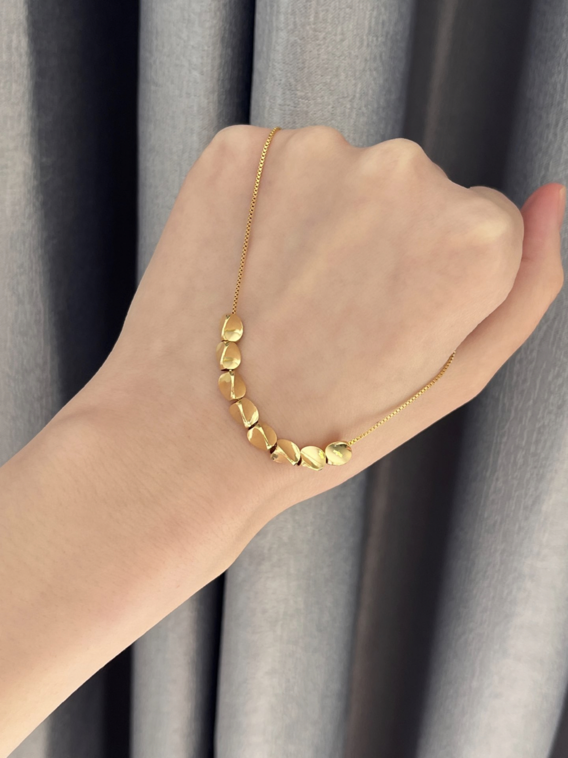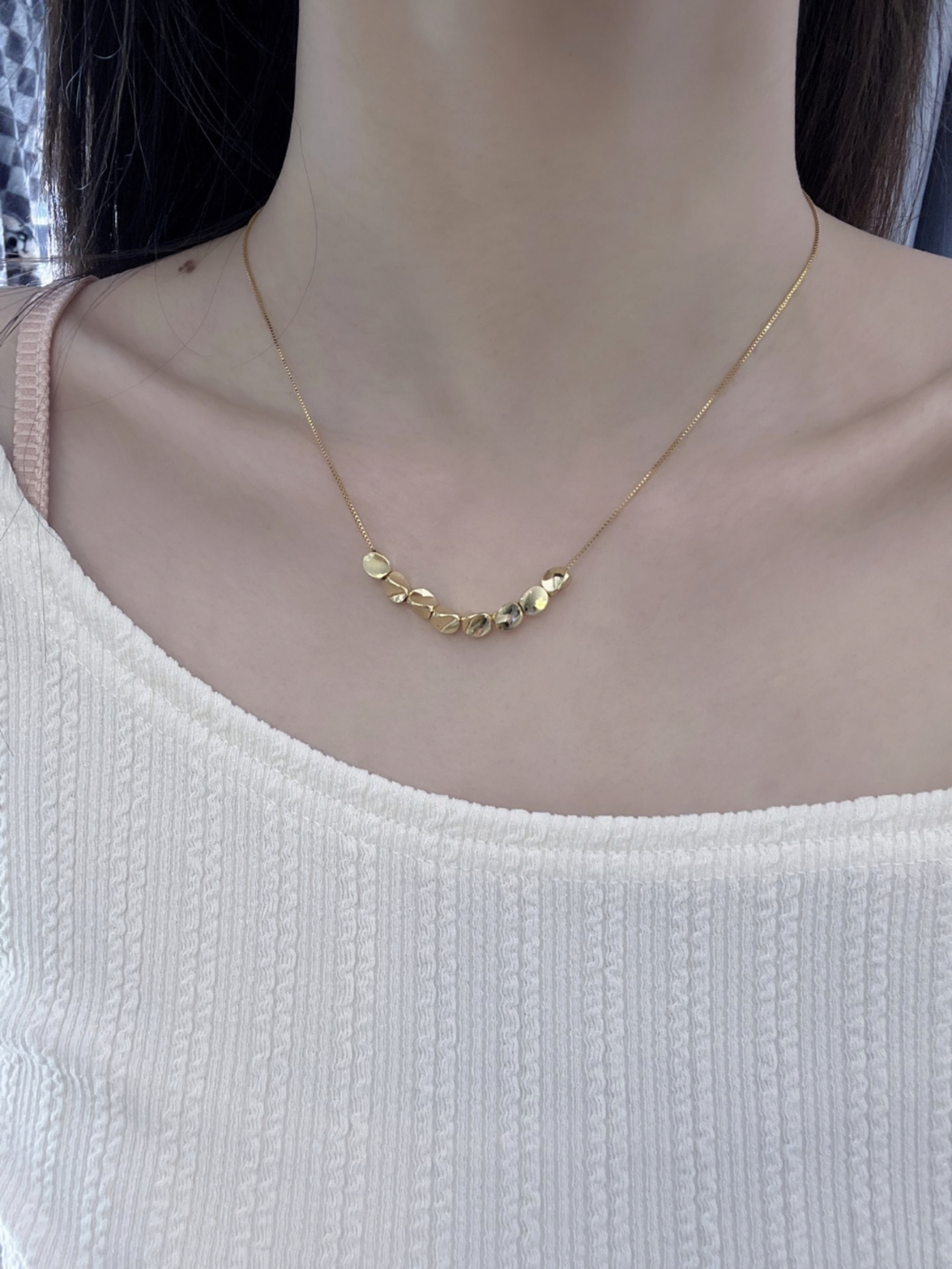 年纪越大越喜欢黄金是真的! 新入的扭扭珠项链 刚打开就迫不及待带上啦 有棱有角有曲线 在光下bulingbuling 闪闪发光 寓意着扭转乾坤 珠事顺利- 实物很绝!搭配我的连衣裙太有气质啦