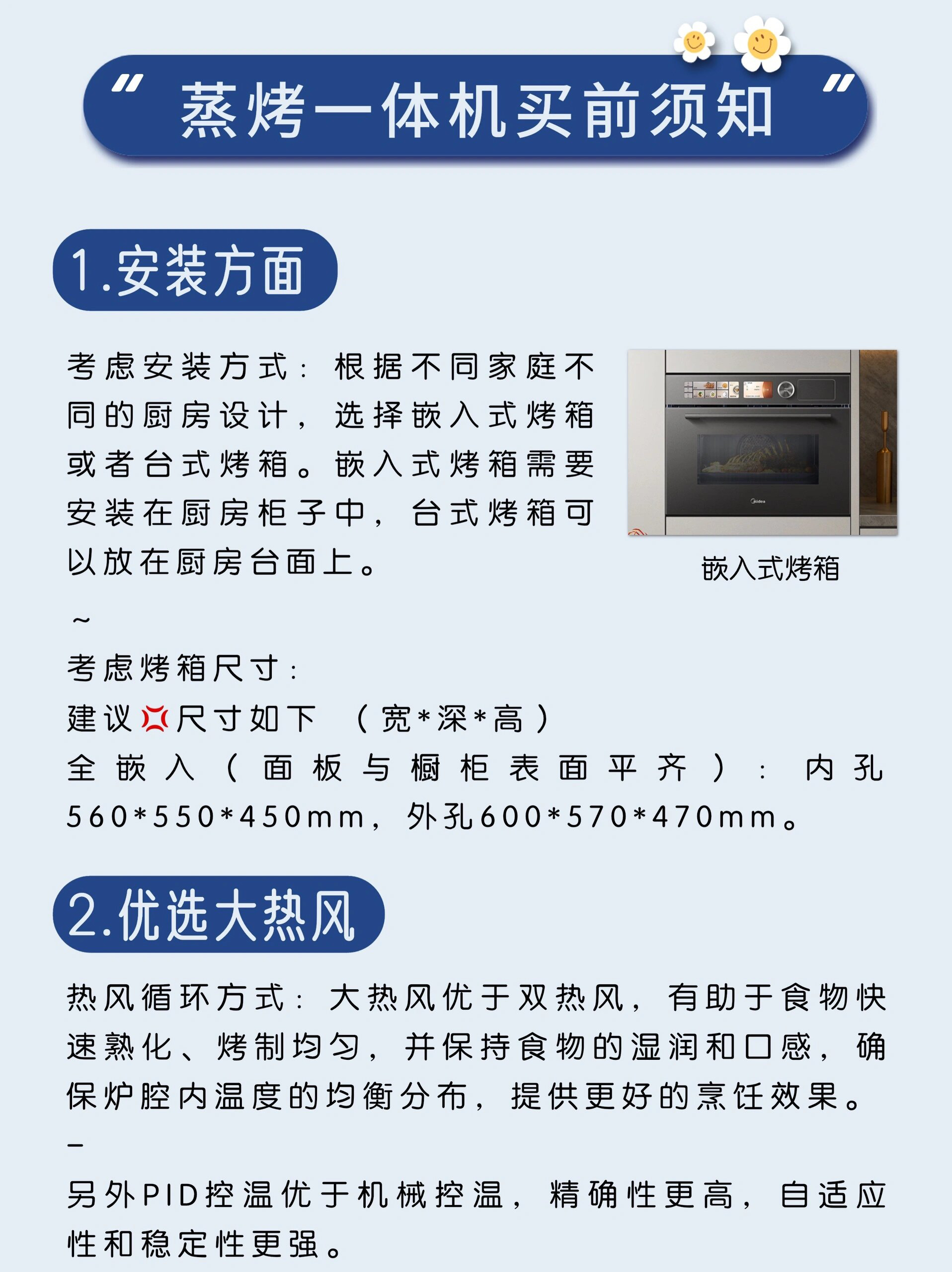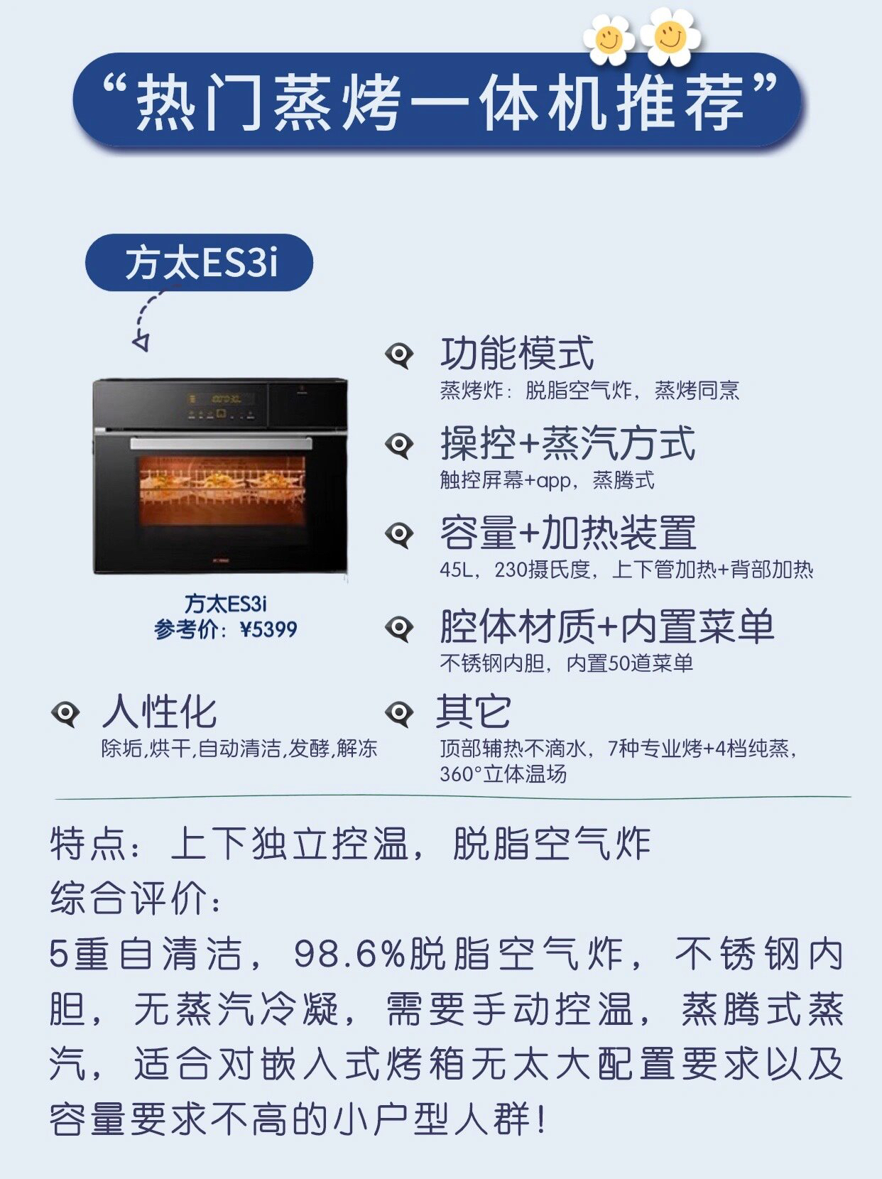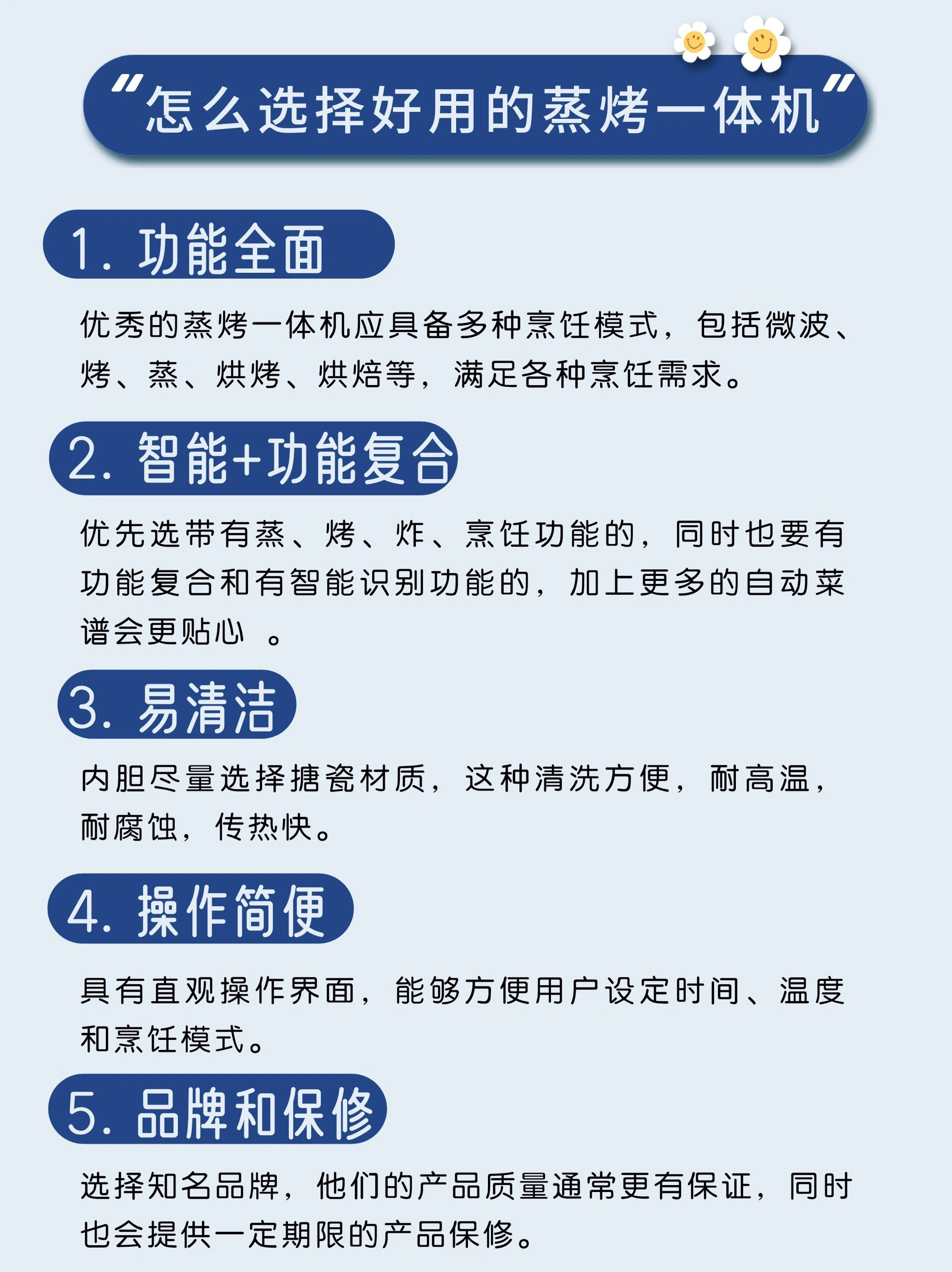 准备入手蒸烤一体机的小伙伴听我一句建议!要选什么?不要选什么?一篇讲懂! -选: 功能全面:多种烹饪模式,包括烤、蒸、烘烤、烘焙等,技多不压身。 智能操作:除去要有蒸、烤、炸、烹饪功能也要选择有功能复合和智能识别功能的,加上自动菜谱更是锦上添花 。 易清洁: 选择内壁采用易清洁材料制成,或者具有自清洁功能的蒸烤一体机。内胆尽量选择搪瓷的,这种材质表面光滑,不易生锈,清洗方便;耐腐蚀;耐高温,传热快...
