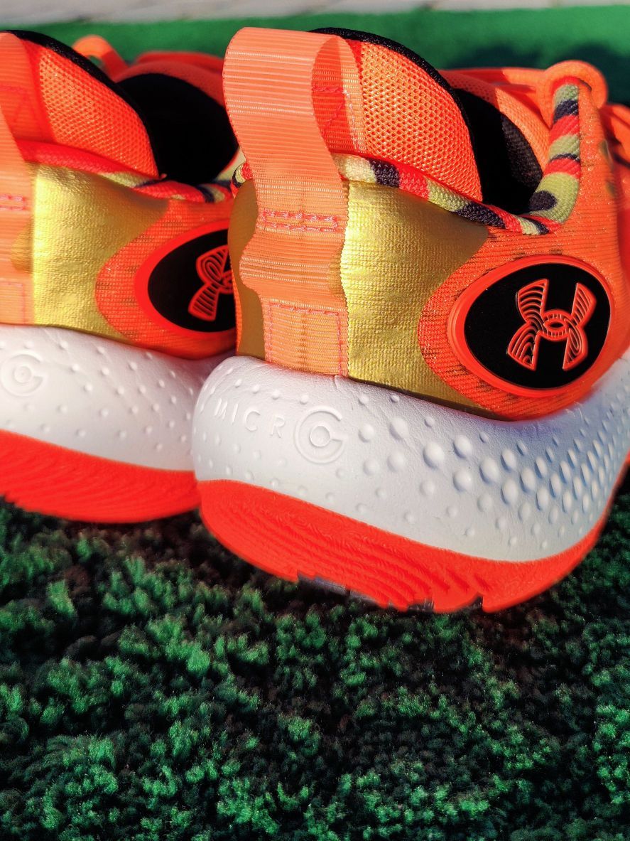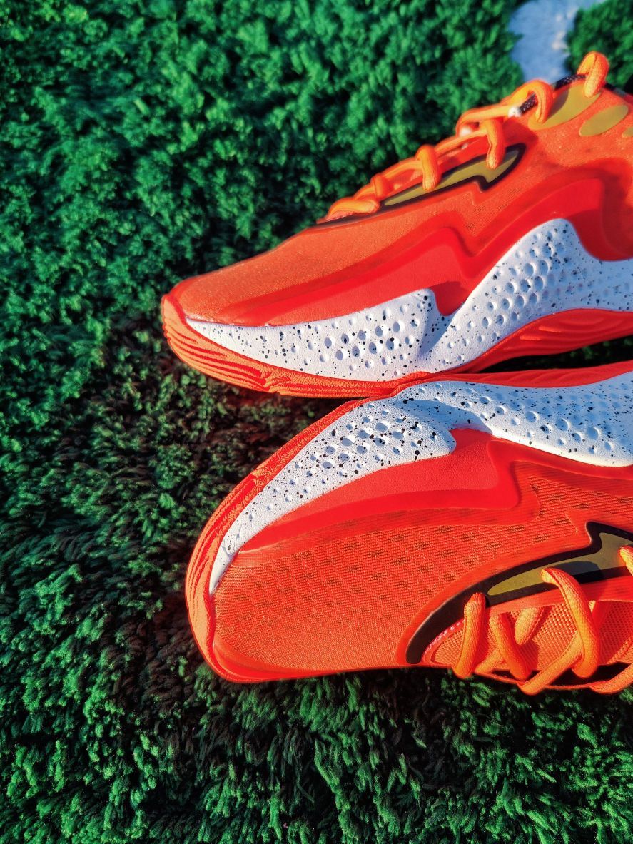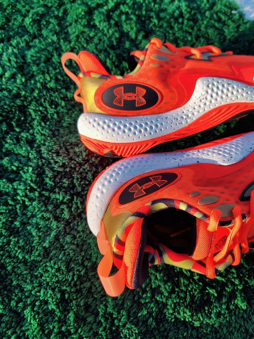 这双来自UA的Anatomix Spawn 5,一开始你可能会被整体荧光橙的配色吸引,但紧接着就是独具风格的等高线鞋底,这样独特的设计也是带来非常不错的抓地力表现,且耐磨不错。 · 🌅Micro G中底,硬,一如既往,这代是带了一款名为Cushioned Achilles的衬垫,带来缓震属性的些许提升。 · 🕌 总体来说,是一双非常不错的小体重后卫鞋。