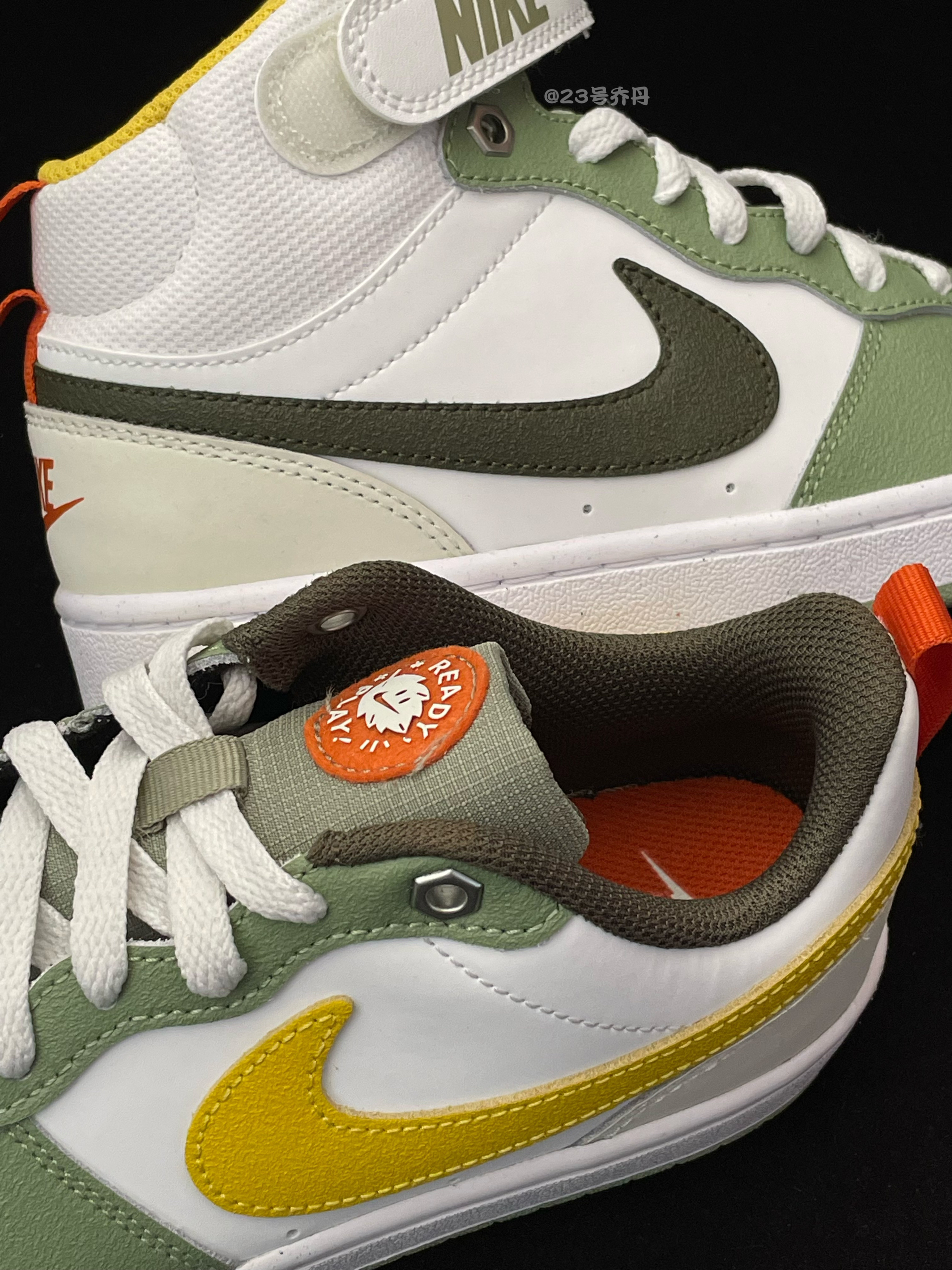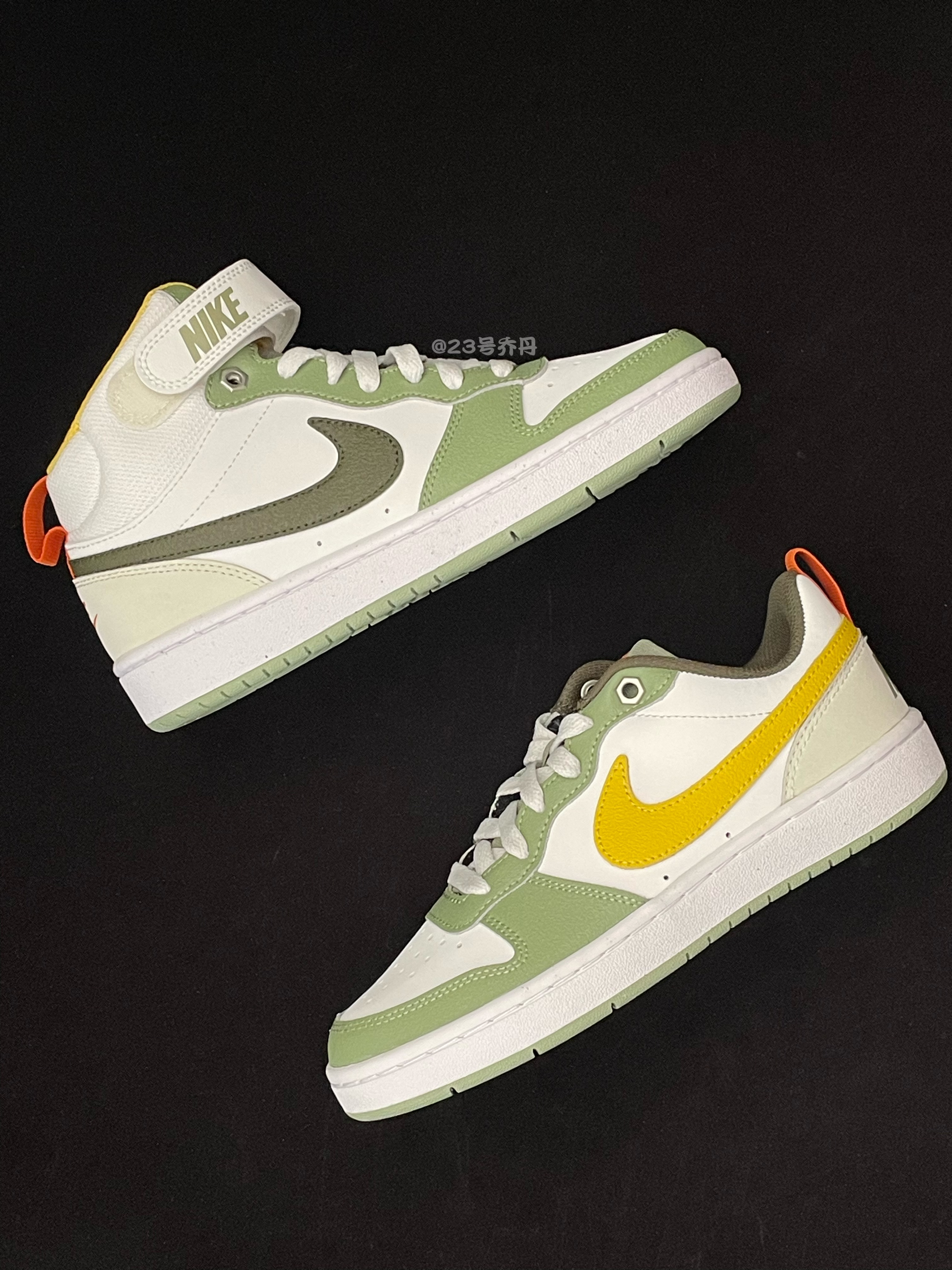 今天给大家分享两双颜值和性价比都不错的 Court Borough Low&Mid『白绿色』小板鞋👟 鞋款均以清新的白色和绿色为主色调 细节部分则运用了橙色/黄色/黑色等点缀 鞋面由光滑皮革/硬质纹路皮革/绒面皮革拼接 鞋头的透气孔设计保证了良好的透气性 鞋舌部分都设计有橙色圆形的TPU鞋舌标签 最后一组鞋带孔使用了六边形的金属螺帽设计 鞋尾的织物提拉带则方便日常穿脱调整 中帮鞋型在鞋口设计可调节...