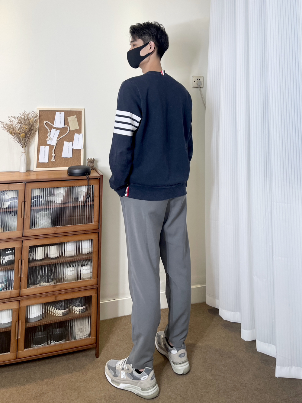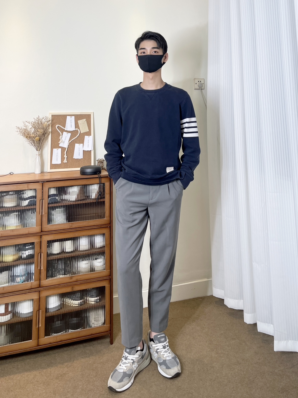 🧥- 素人也能穿好看系列,这件TB经典卫衣,有同款的同学请举手!百搭、亲肤,轻松搭配 👖- UR直筒西裤,版型偏休闲,有一定的面料质感,灰色调极简美学必备色,和任何色系都可以搭配出不同的感觉,彰显时尚 👟- NB的992元祖灰