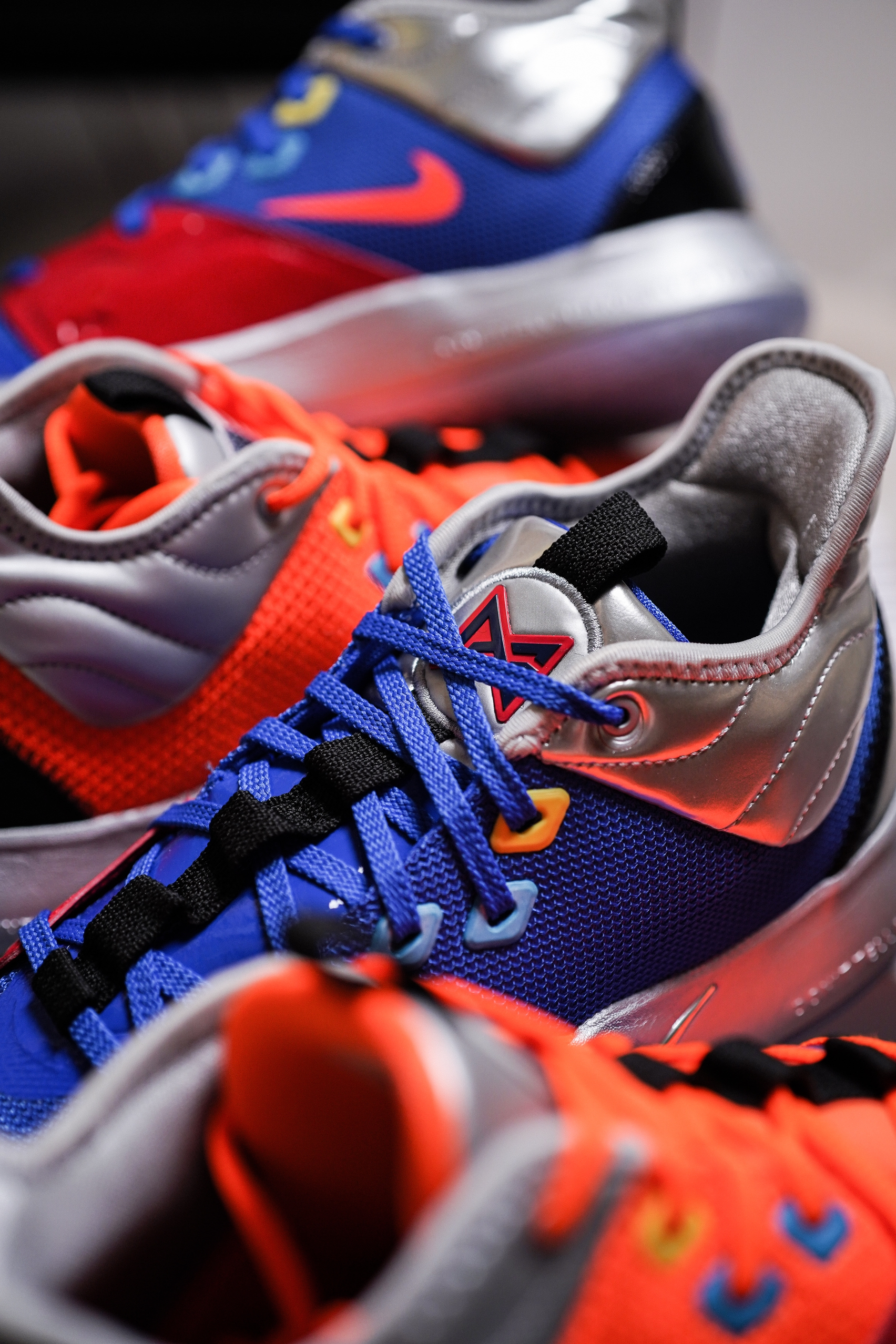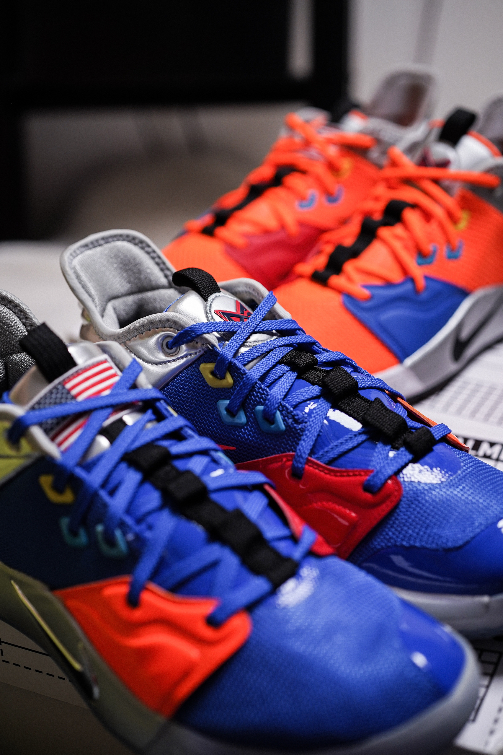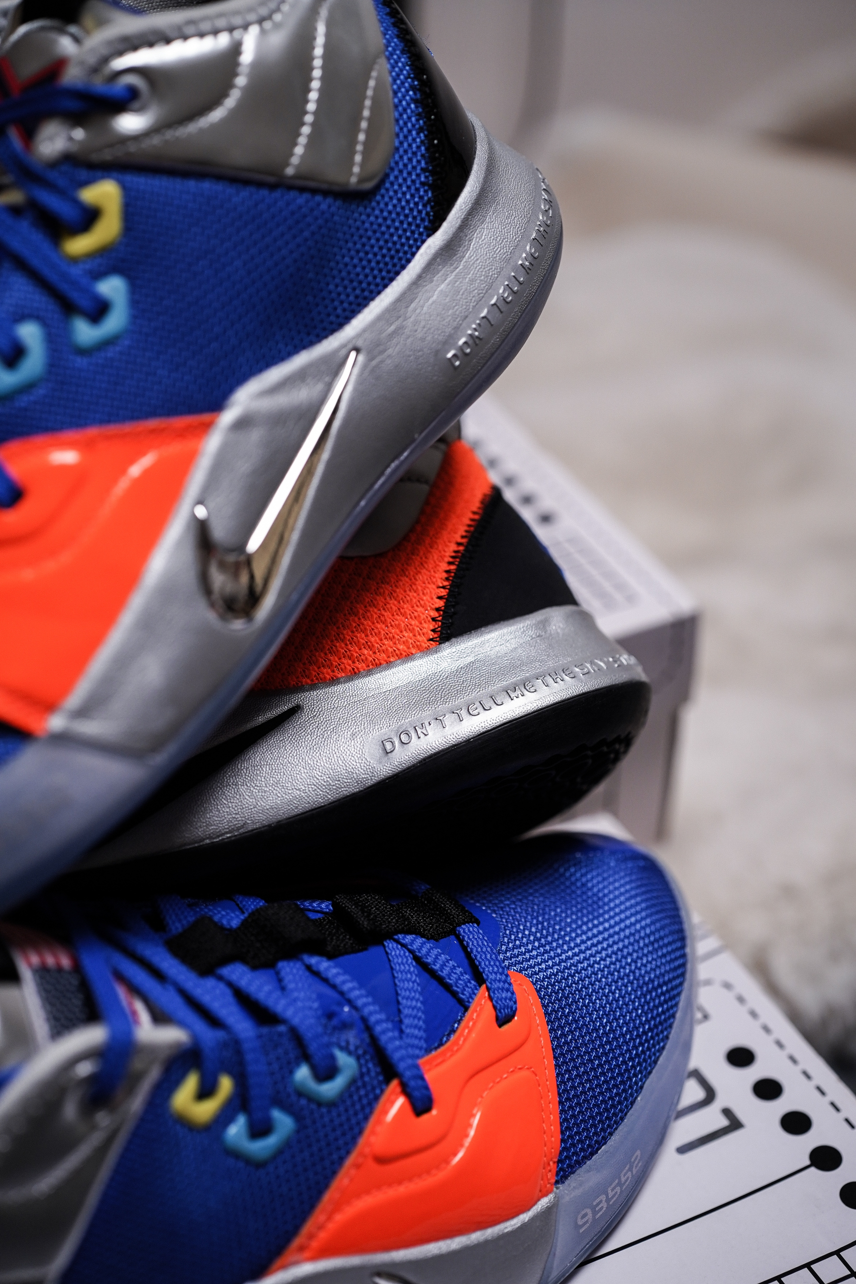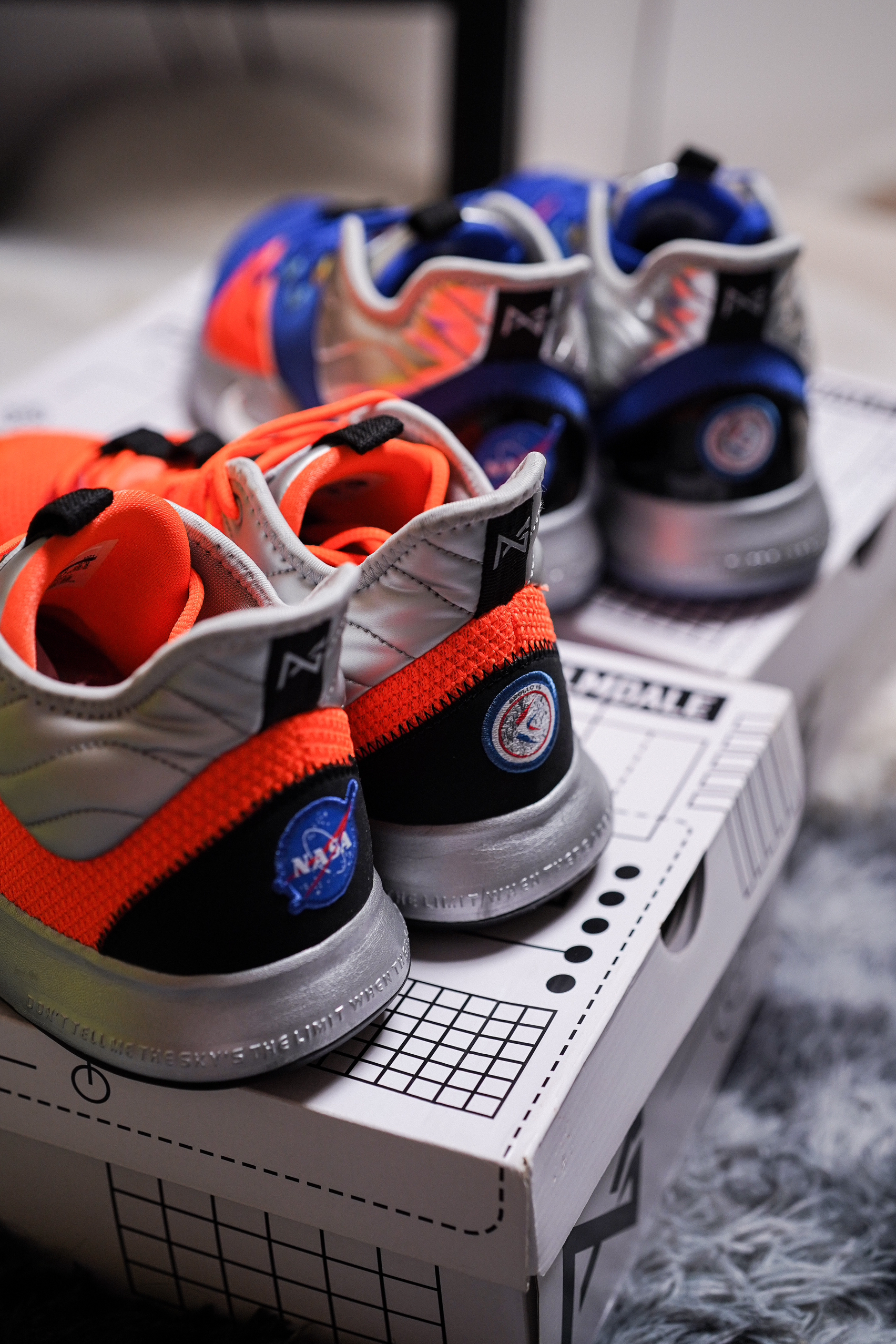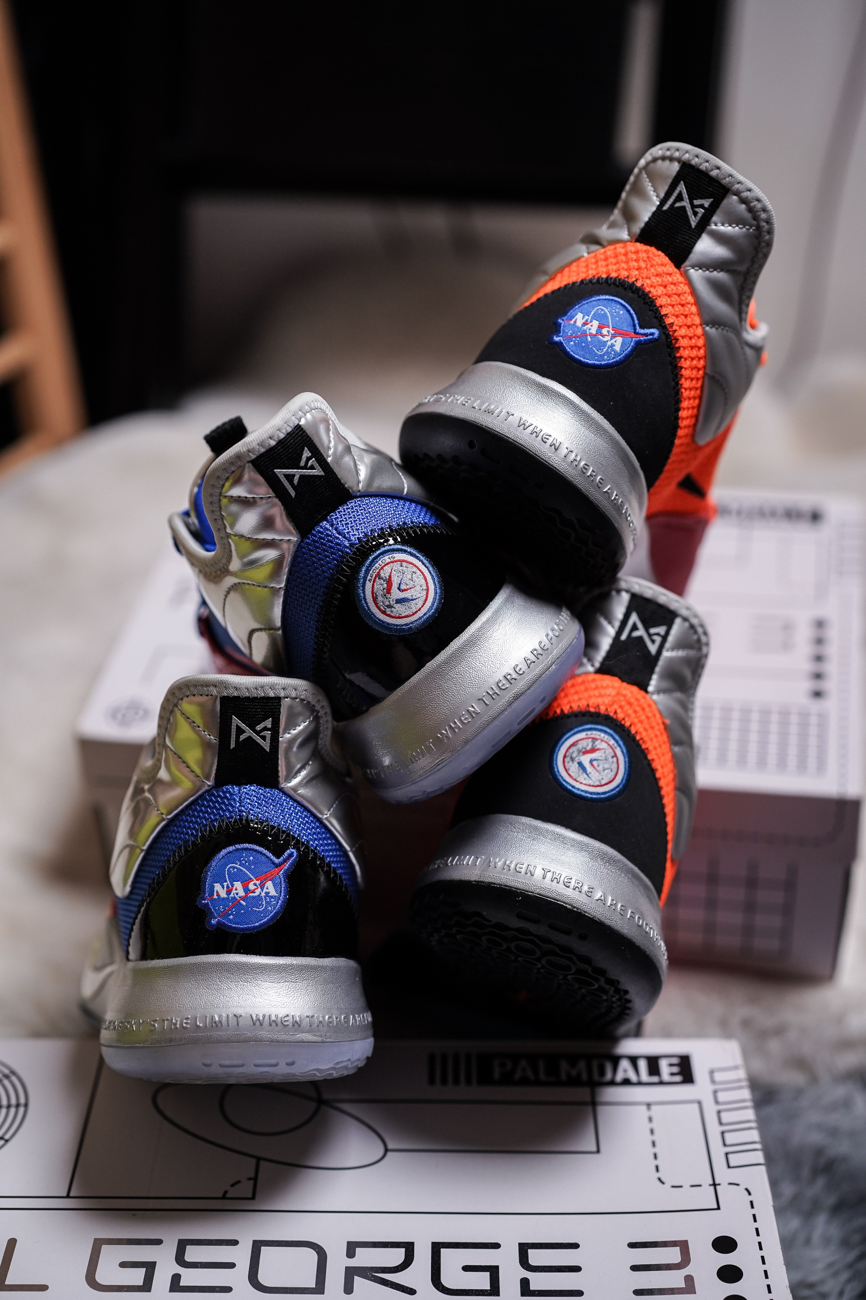 最近几场乔治真是打的太挣扎了,各种9中1 11中2开局,你得支棱起来啊!前几天跟朋友一起淘来两双PG3 NASA联名,一人一只脚组了双鸳鸯。希望泡椒汁能退步到4年前雷霆时期的状态吧!
