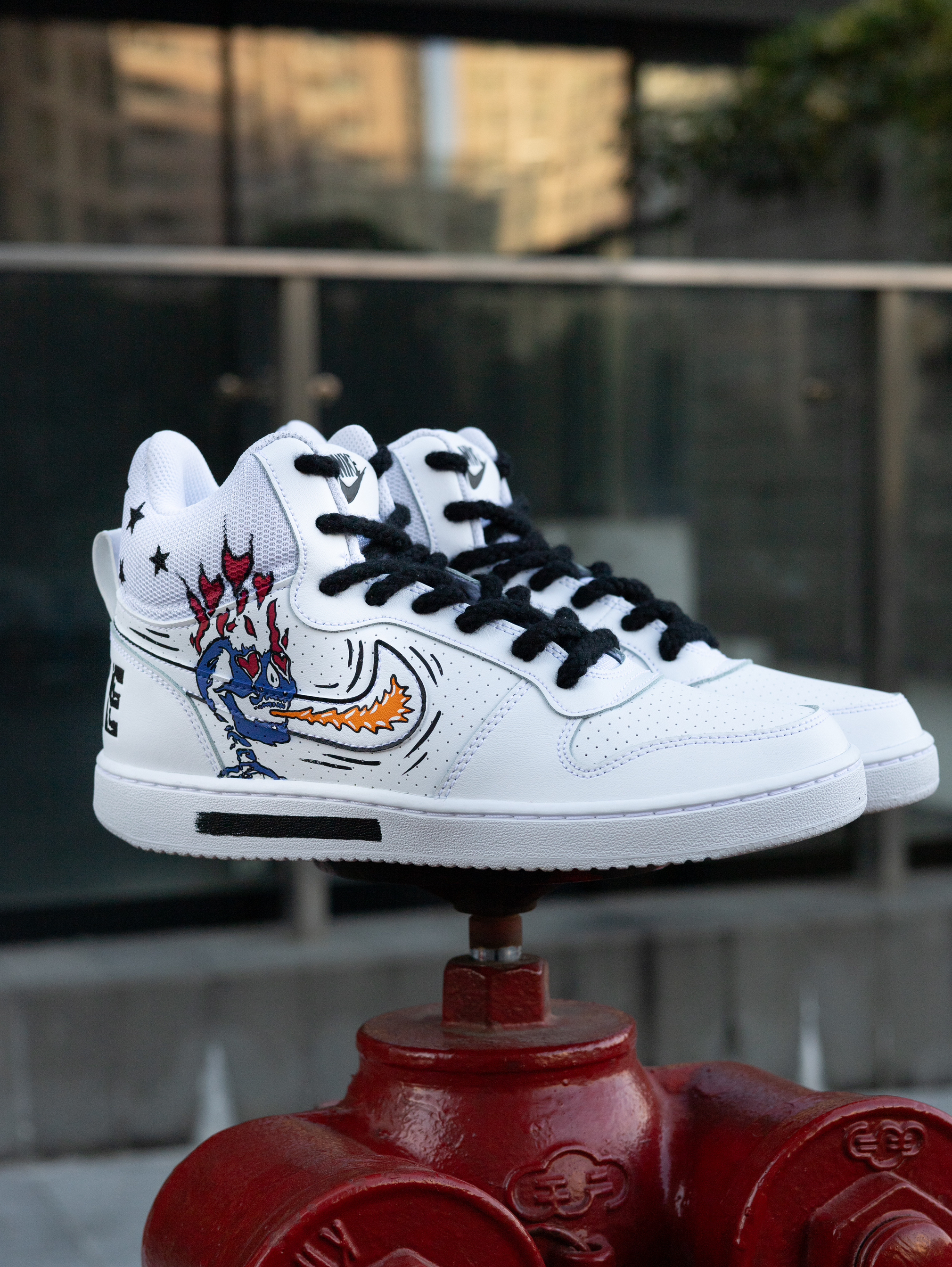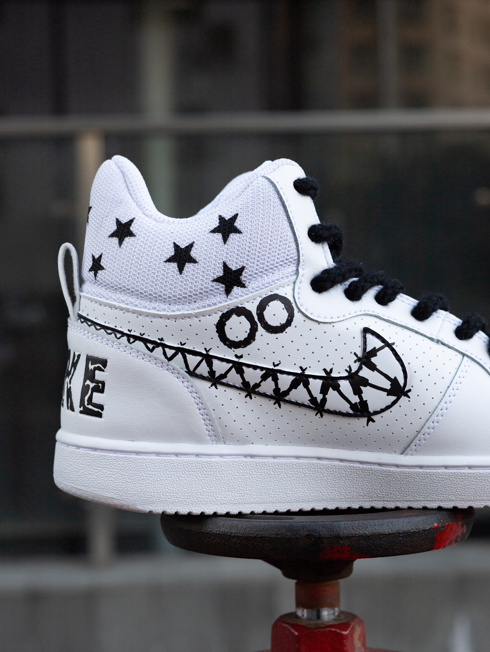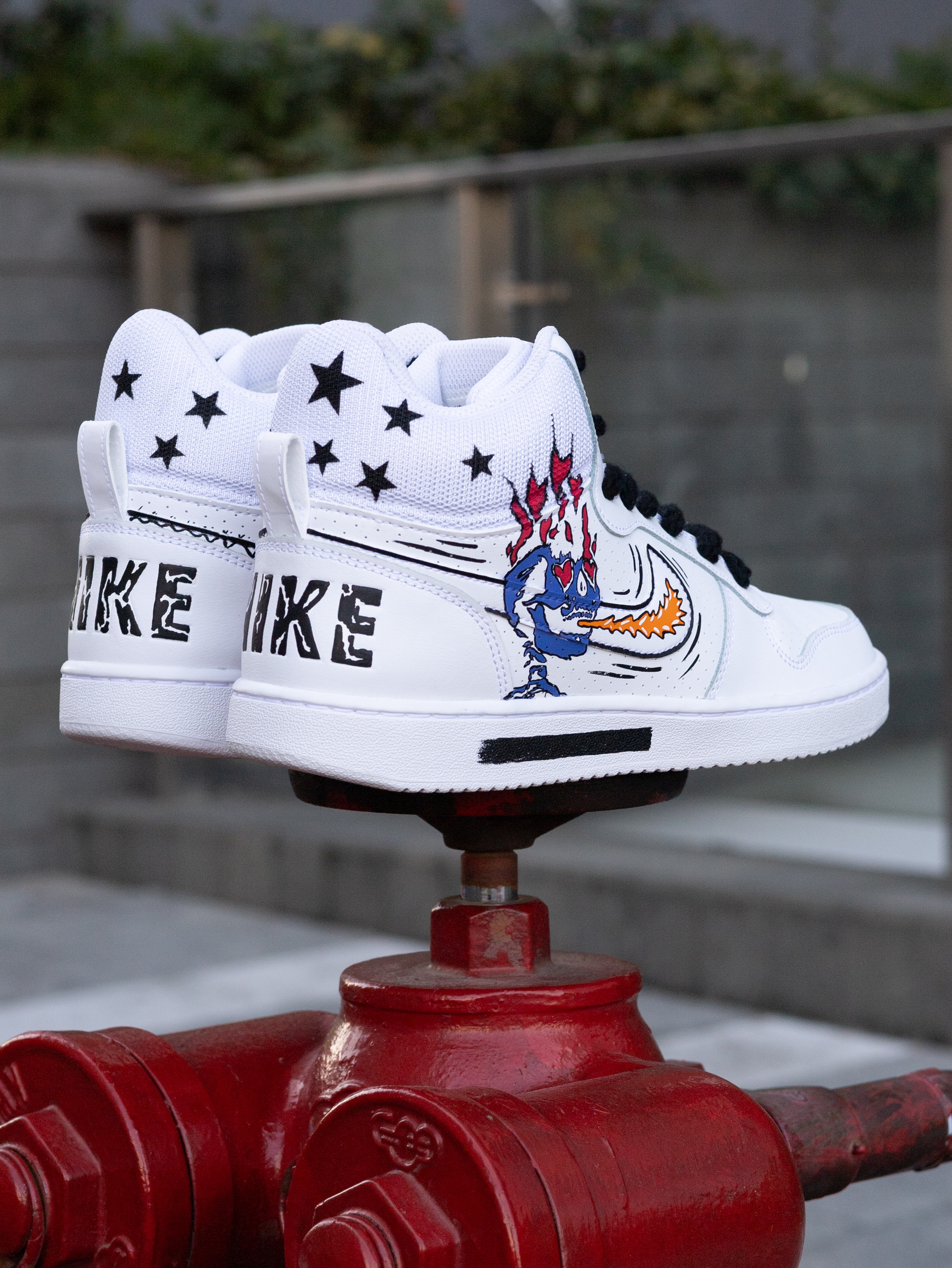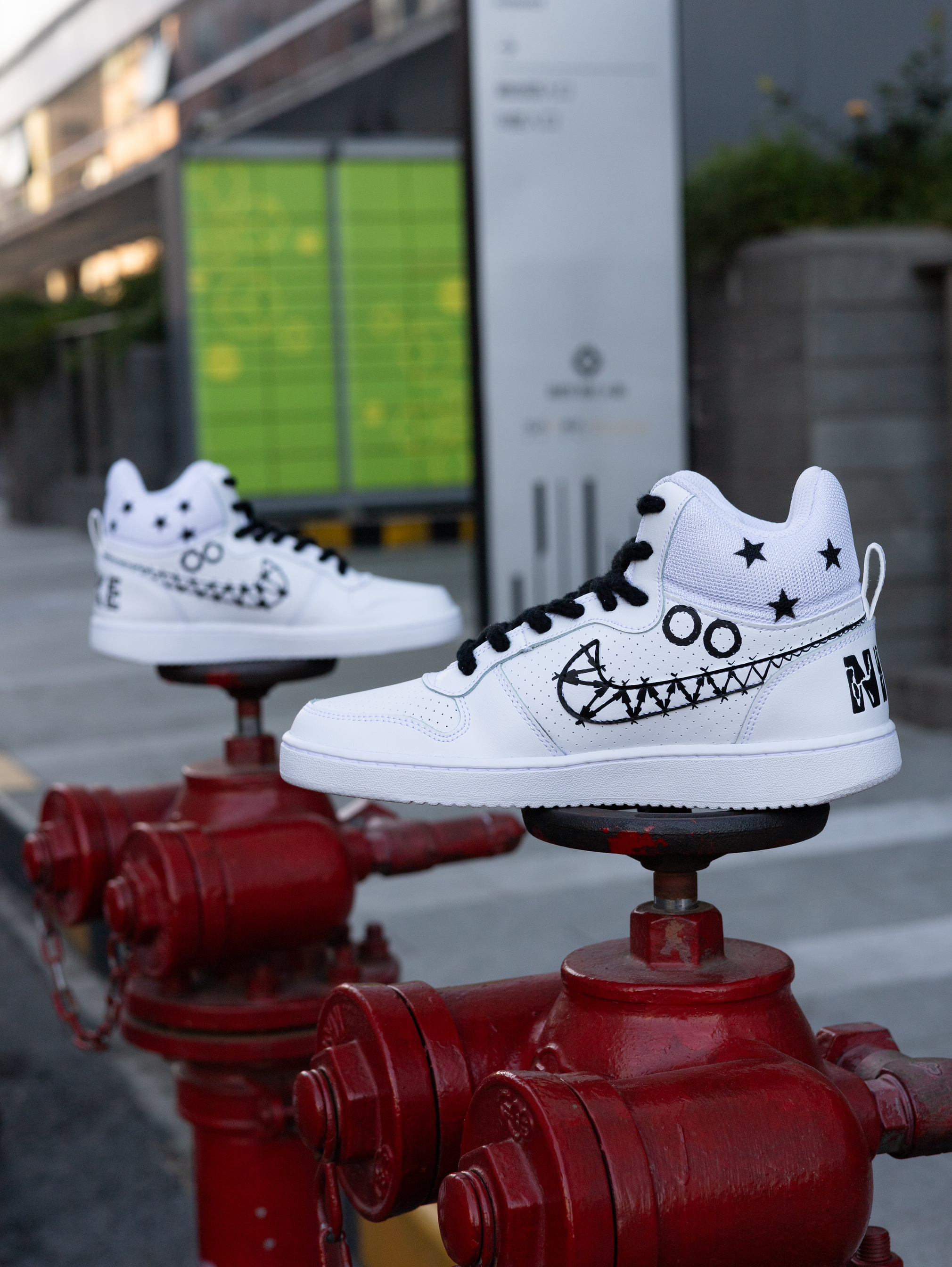 今天给大家分享一双很酷帅的定制板鞋👟 Court Borough美式涂鸦 高帮板鞋👟 整双鞋采用了Court Borough纯白为设计模版 鞋身外侧加入了幽灵👻/火焰🔥的彩色涂鸦元素 内侧则是黑白色调的机器人🤖笑脸和哭脸图案 鞋帮部分还设计有黑色星星⭐️图案 鞋身的密集透气孔保证了较好的透气性 鞋舌与鞋尾均设计有品牌Logo图案 鞋尾还设计有方便穿脱调整的织物提拉带 最后由白色的中底和同色多纹路橡...