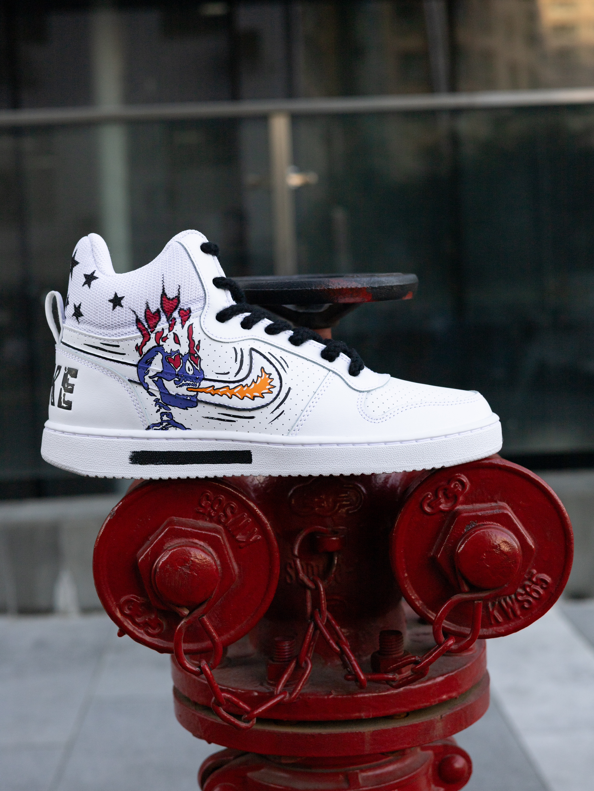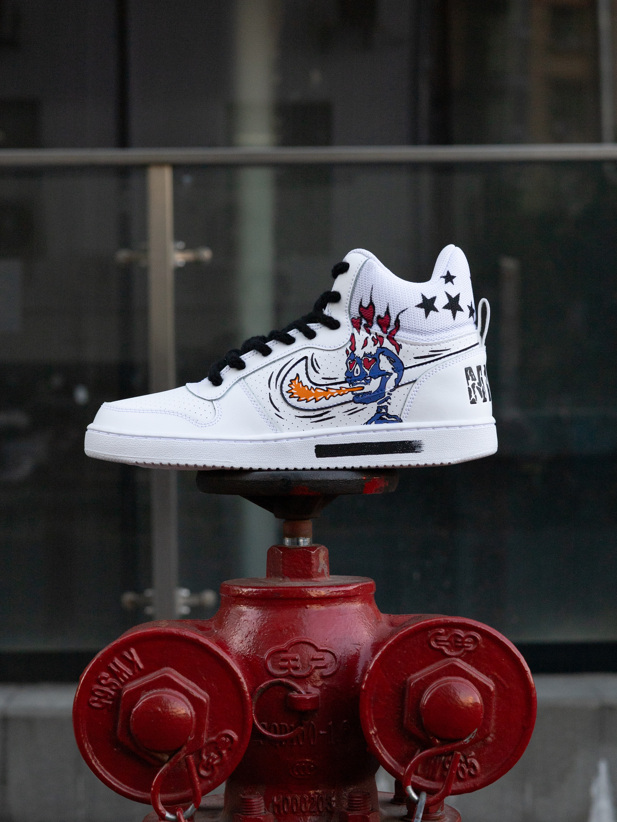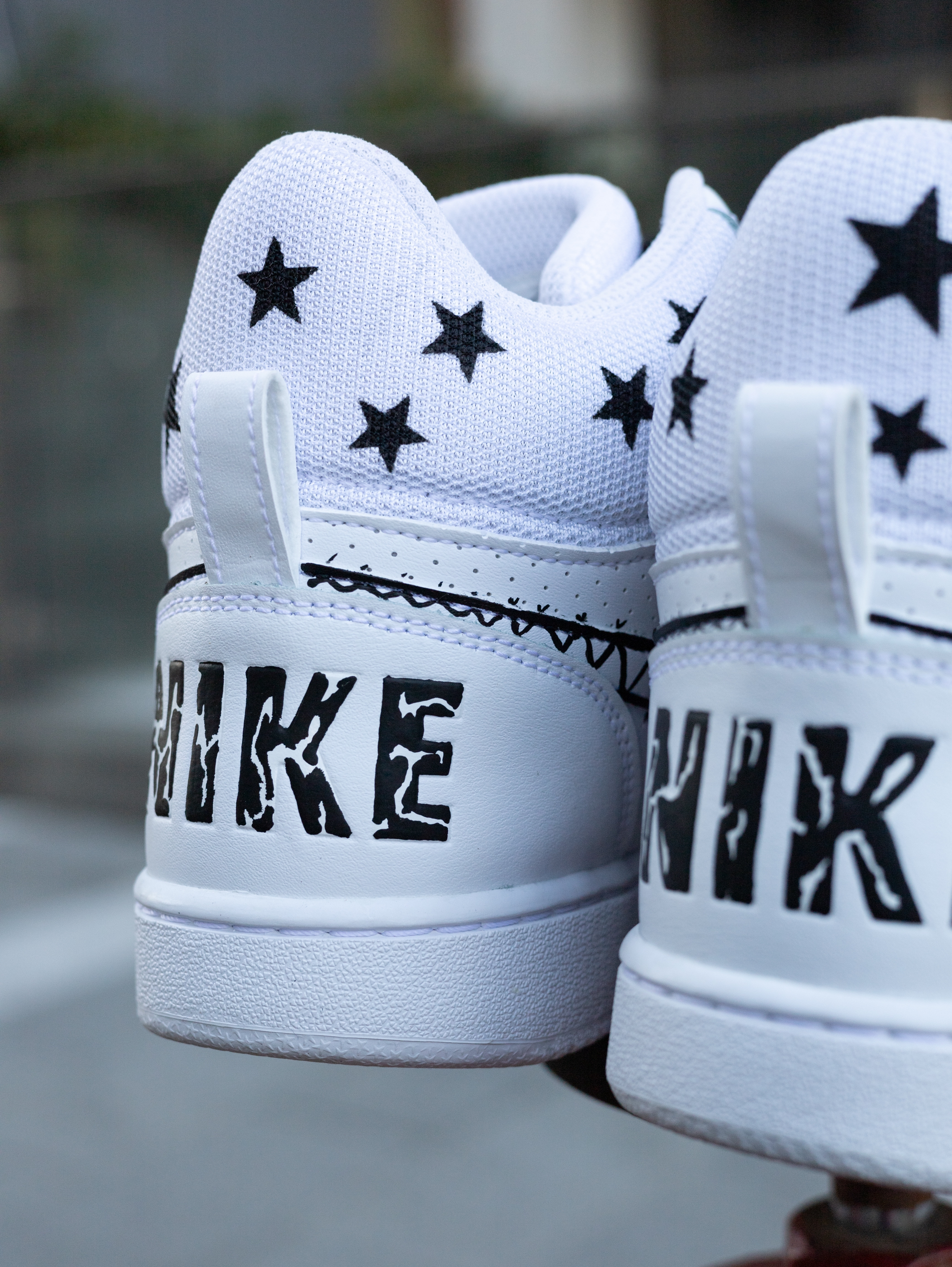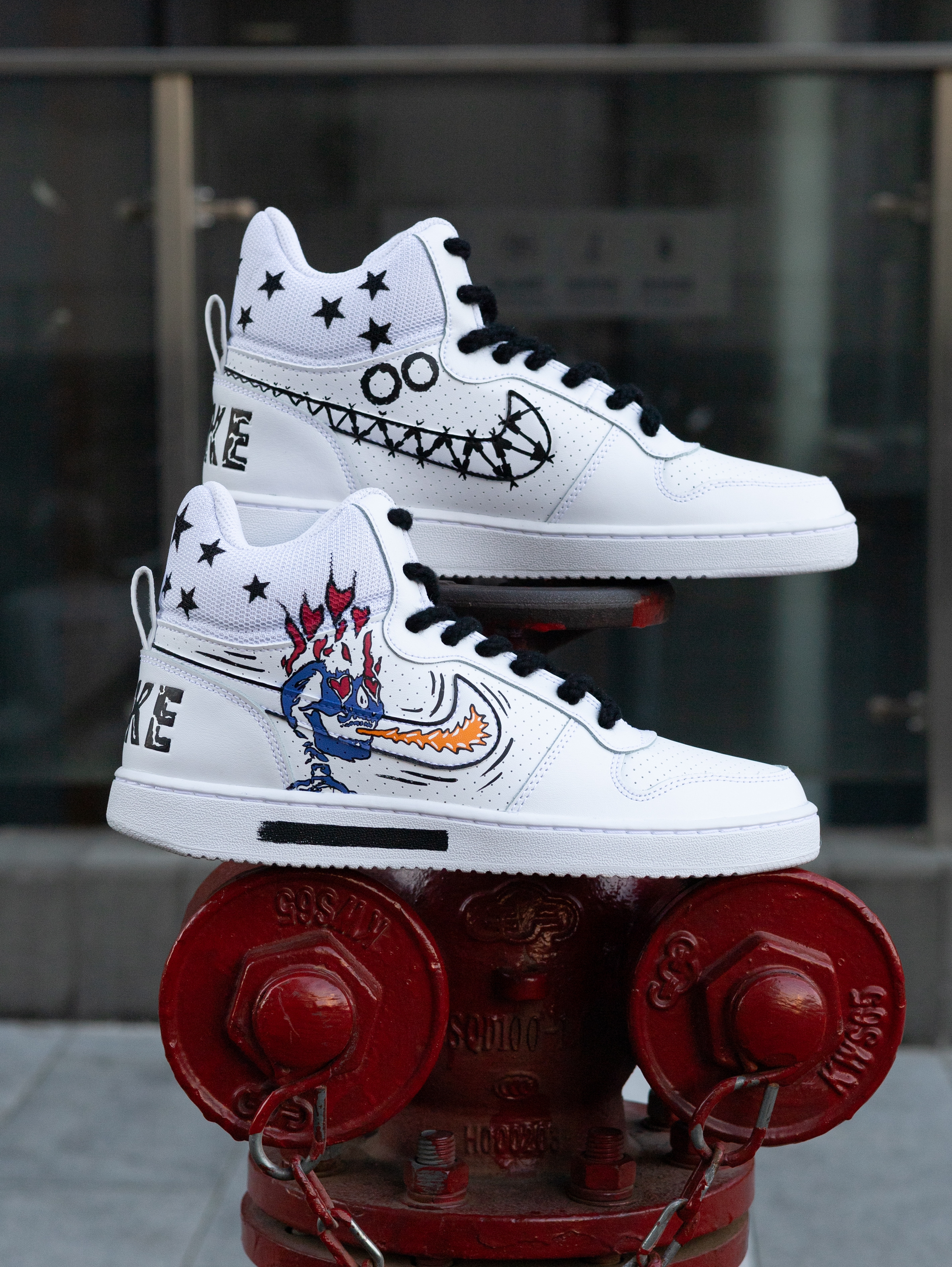 今天给大家分享一双很酷帅的定制板鞋👟 Court Borough美式涂鸦 高帮板鞋👟 整双鞋采用了Court Borough纯白为设计模版 鞋身外侧加入了幽灵👻/火焰🔥的彩色涂鸦元素 内侧则是黑白色调的机器人🤖笑脸和哭脸图案 鞋帮部分还设计有黑色星星⭐️图案 鞋身的密集透气孔保证了较好的透气性 鞋舌与鞋尾均设计有品牌Logo图案 鞋尾还设计有方便穿脱调整的织物提拉带 最后由白色的中底和同色多纹路橡...