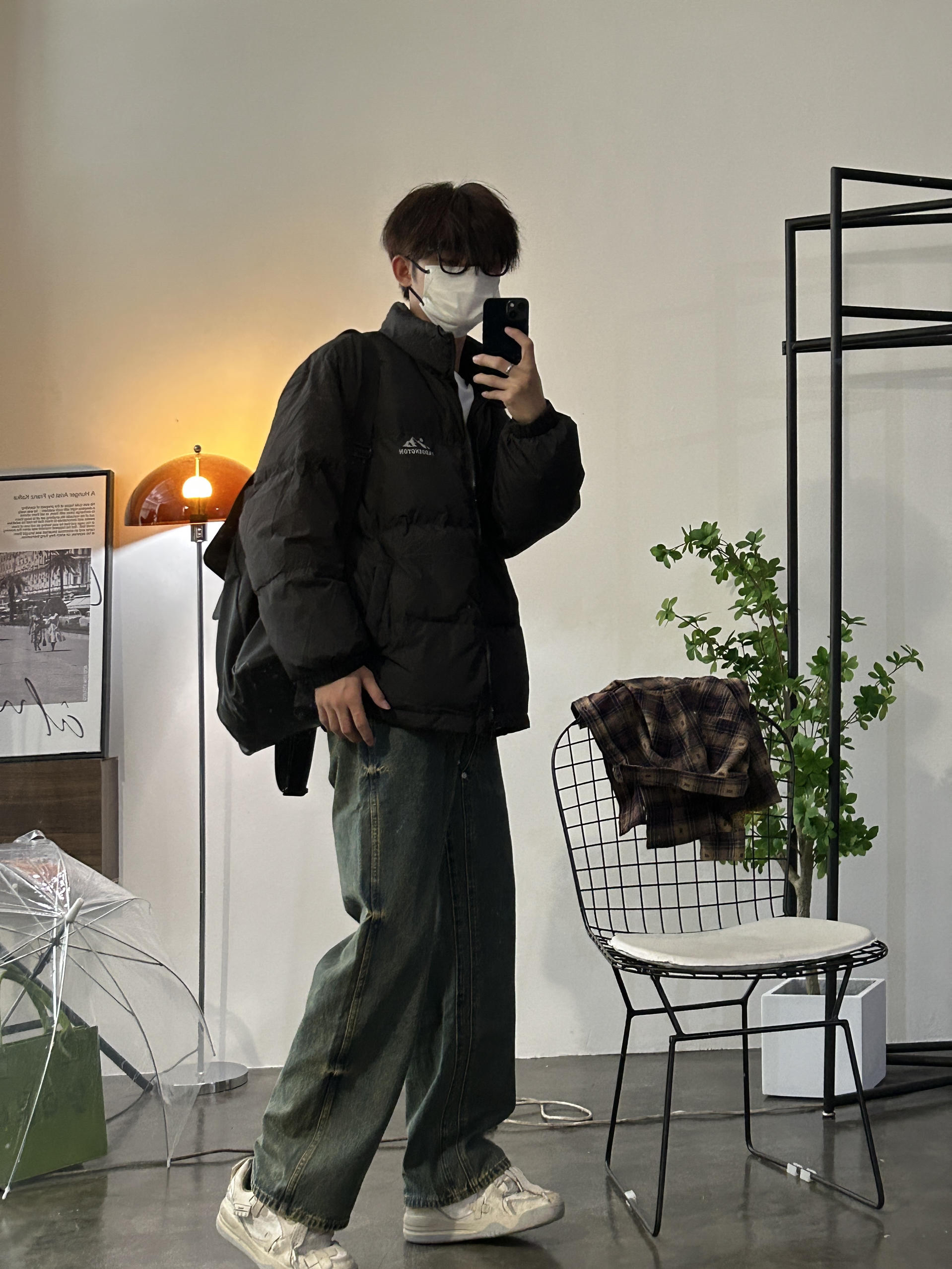 🙋♂️身高 体重: 180|130 今日份Ootd: 上衣选择一件黑色羽绒服外套❄️ 内搭一件灰色卫衣叠穿白色打底衫🌟 立领设计款羽绒服上身百搭耐看 胸前搭配图标设计logo设计简约大气🉑️ 裤子选择了复古牛仔裤版型上身显瘦显腿长,裤脚微宽设计 鞋子选择了百搭款运动鞋 整套搭配下来,又帅又暖