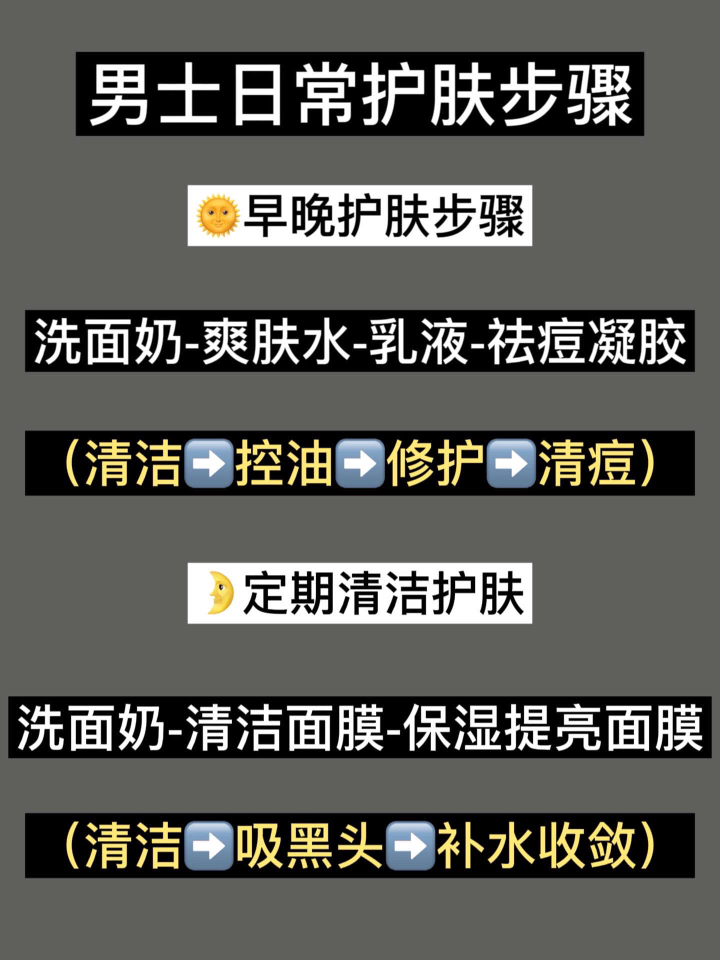 日常精简护肤流程|男生秋冬护肤看这里!|||分享近期一直在用的护肤套装! 一整套精简实用!搭配也是恰到好处 附上详细的早晚护肤流程图! 不懂护肤怎么用的兄弟可以参考。 - 男士早晚护肤步骤 1kske洗面奶(清爽又去油,早晚各一次 2kske爽肤水(调节水油平衡,用前摇匀 3kske保湿乳(保湿维稳修护,按压两泵 4kske祛痘凝胶(抚平修护痘痘睡前点涂 - 男士周末清洁护肤步骤 1kske洗面奶...