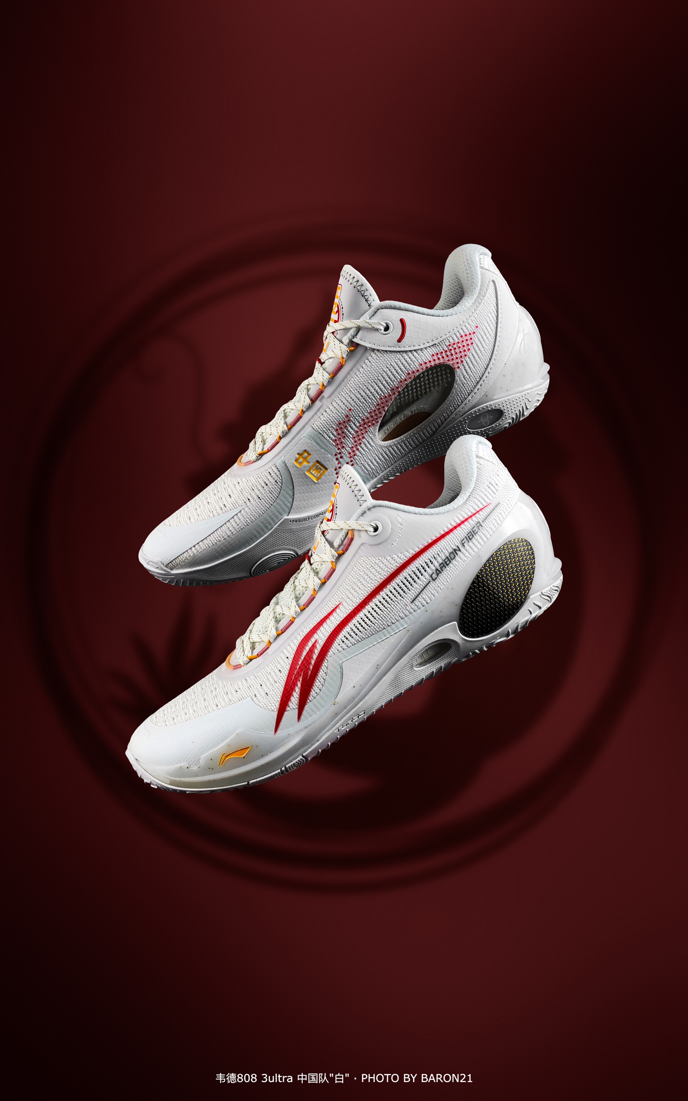 在这双韦德808 3ultra的身上,可以看到很多中国元素的细节。比如鞋后跟的“龍”字,还有内侧前段的“中国”二字和鞋舌的“CHINA”字样。最后就是整体的颜色了,中国国家队的专属红白配色。这款鞋市售有一段时间了,很容易就能入手!