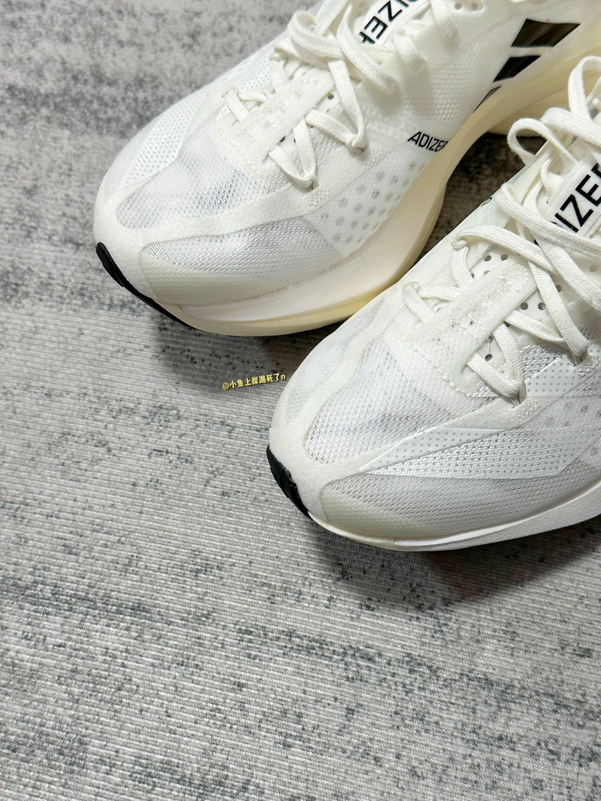 哈喽 小鱼🐟来喽! 今天给大家推荐分享这双迪子的adios pro 3代 白色 这双颜值是真的很高一眼就爱了 但是也真的很不耐脏 鞋面全织物网布设计 透气性很不错 但是北方冬天穿冷 下雨天也不要穿 鞋头很不好清理污渍 而且那一块材质偏硬 所以码数不能买小 不然会很顶脚趾的中底Lightstrike Pro缓震科技 静态效果下脚感都是很澎湃的 回弹效果也很不错 但是门槛较高 不适合普通跑者 而且日常...