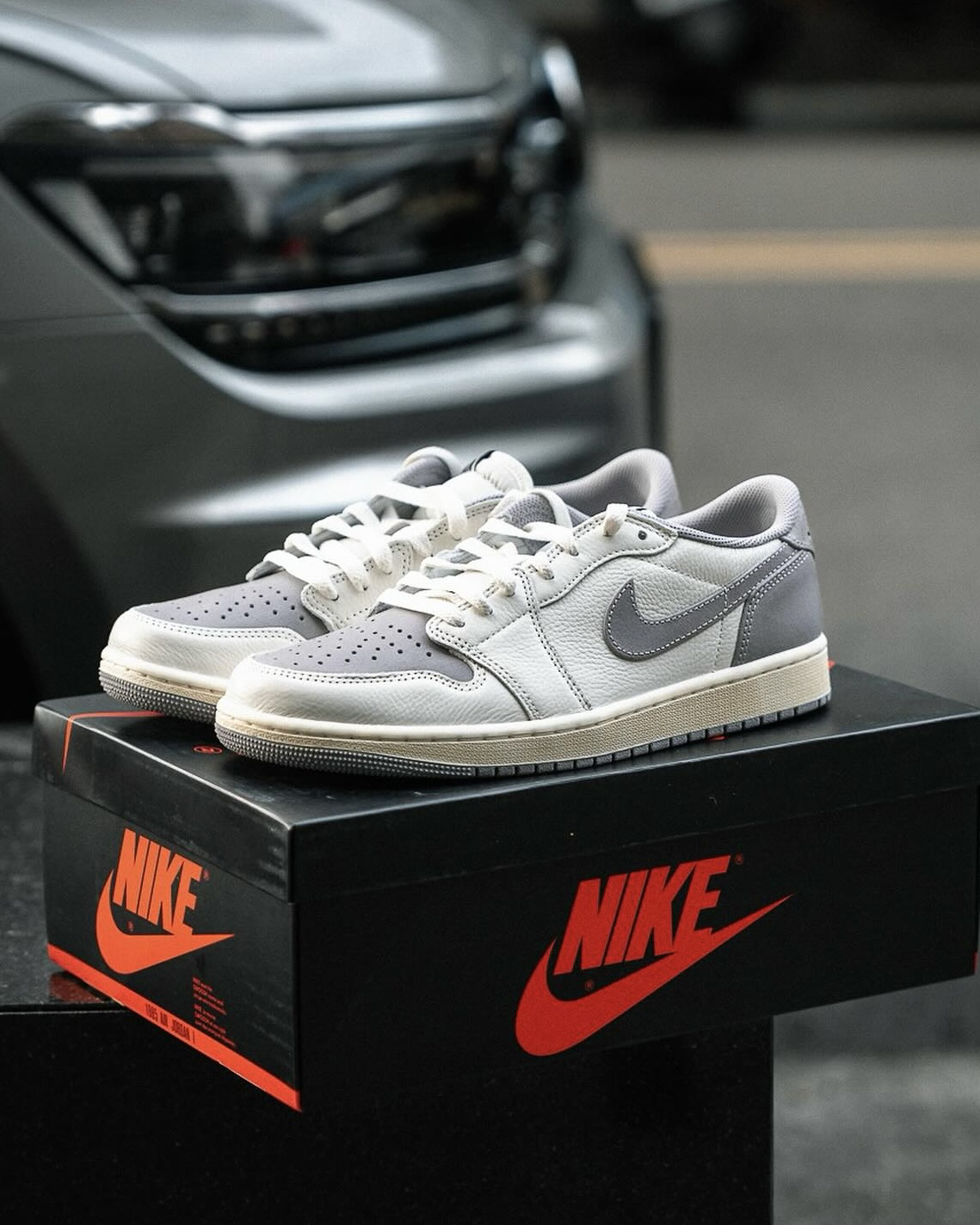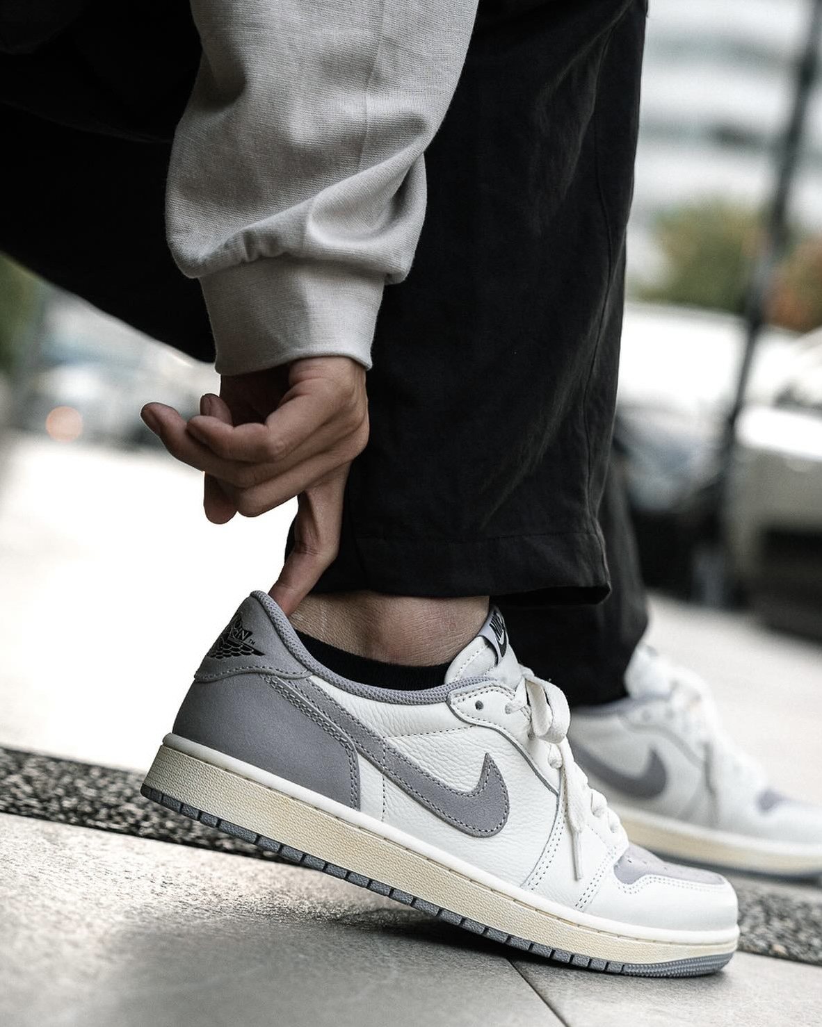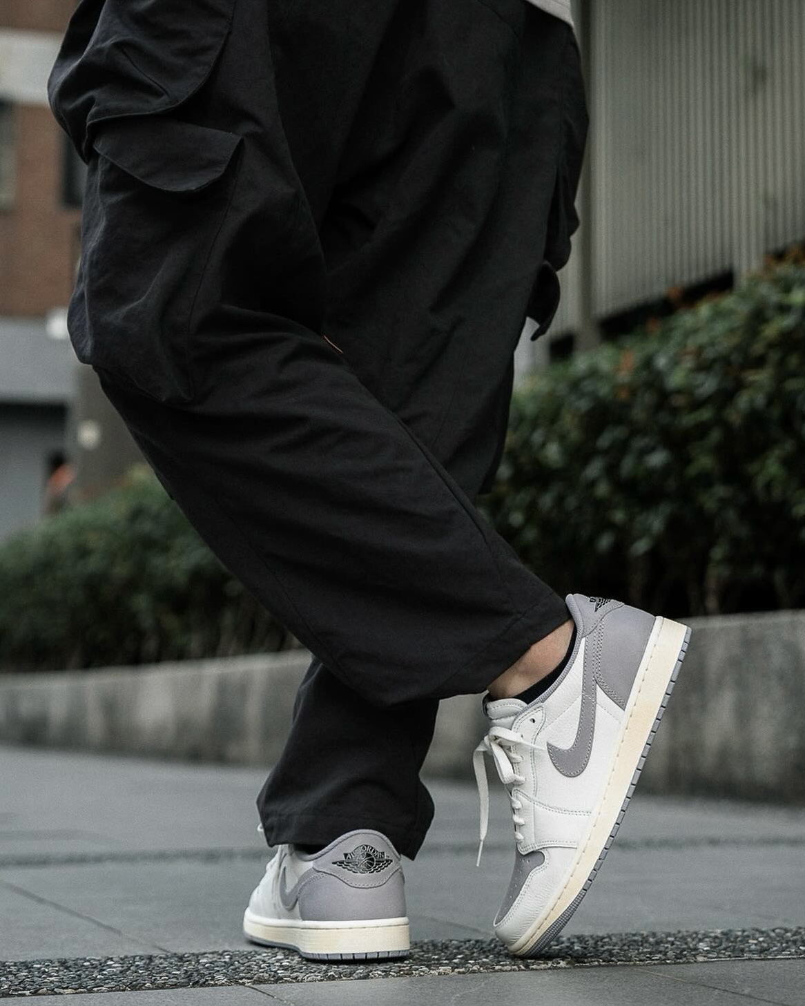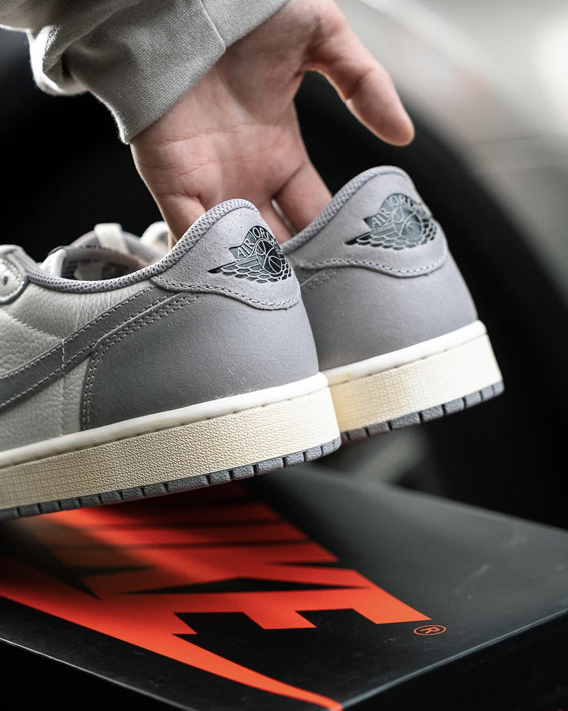 鞋名:Air Jordan 1 Low "Atmosphere Grey" 灰色 外观及细节: 这双经典的低帮AJ1 整体的颜色以做旧色为主,选用了灰色与米色组合构成鞋面,不同质地的皮革拼接而成,触摸上去的手感挺不错的,织物鞋舌也是保证了透气性,米黄色的中底也是比较具有复古感,深灰色的大底和鞋面又有着鲜明的对比。
