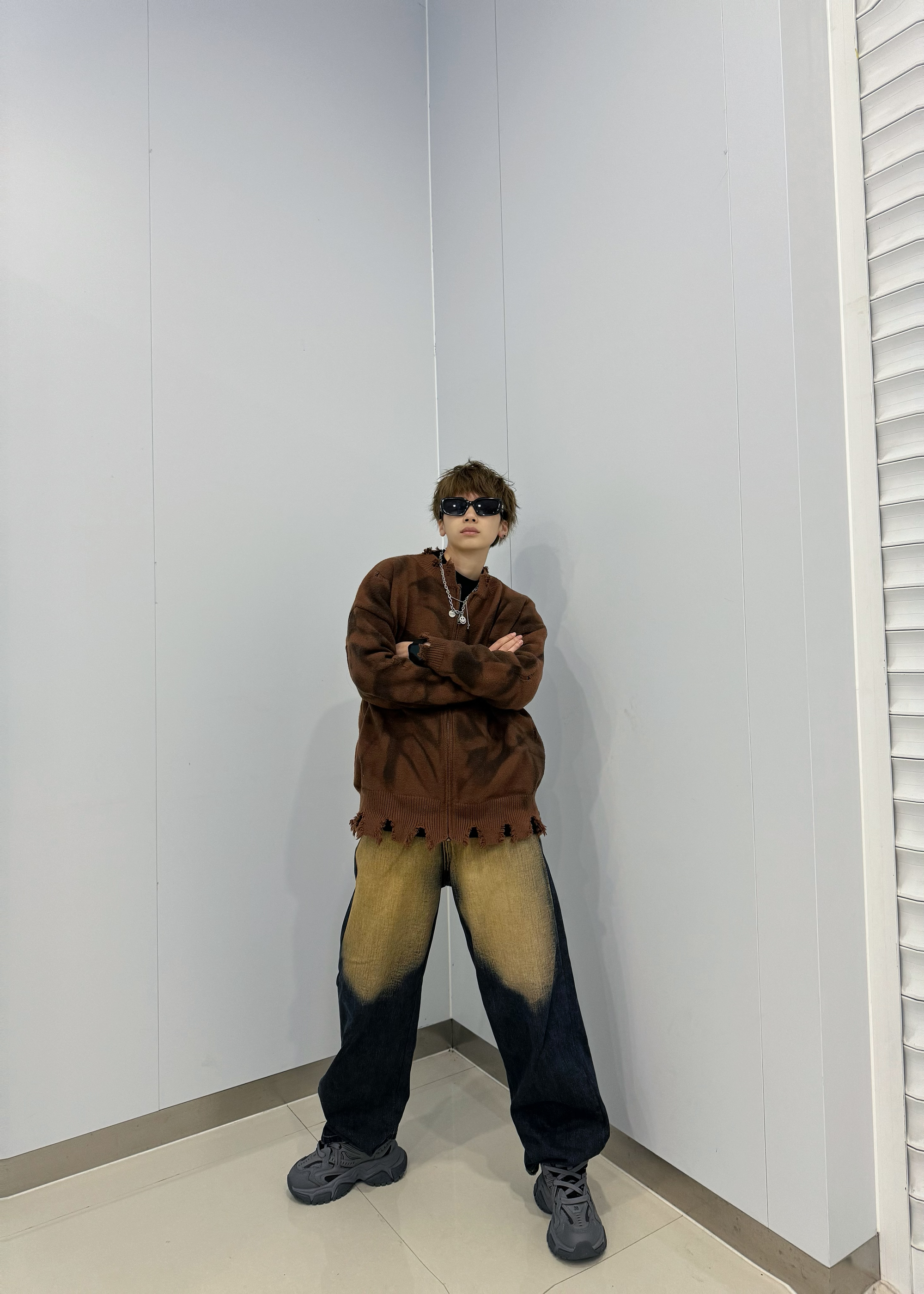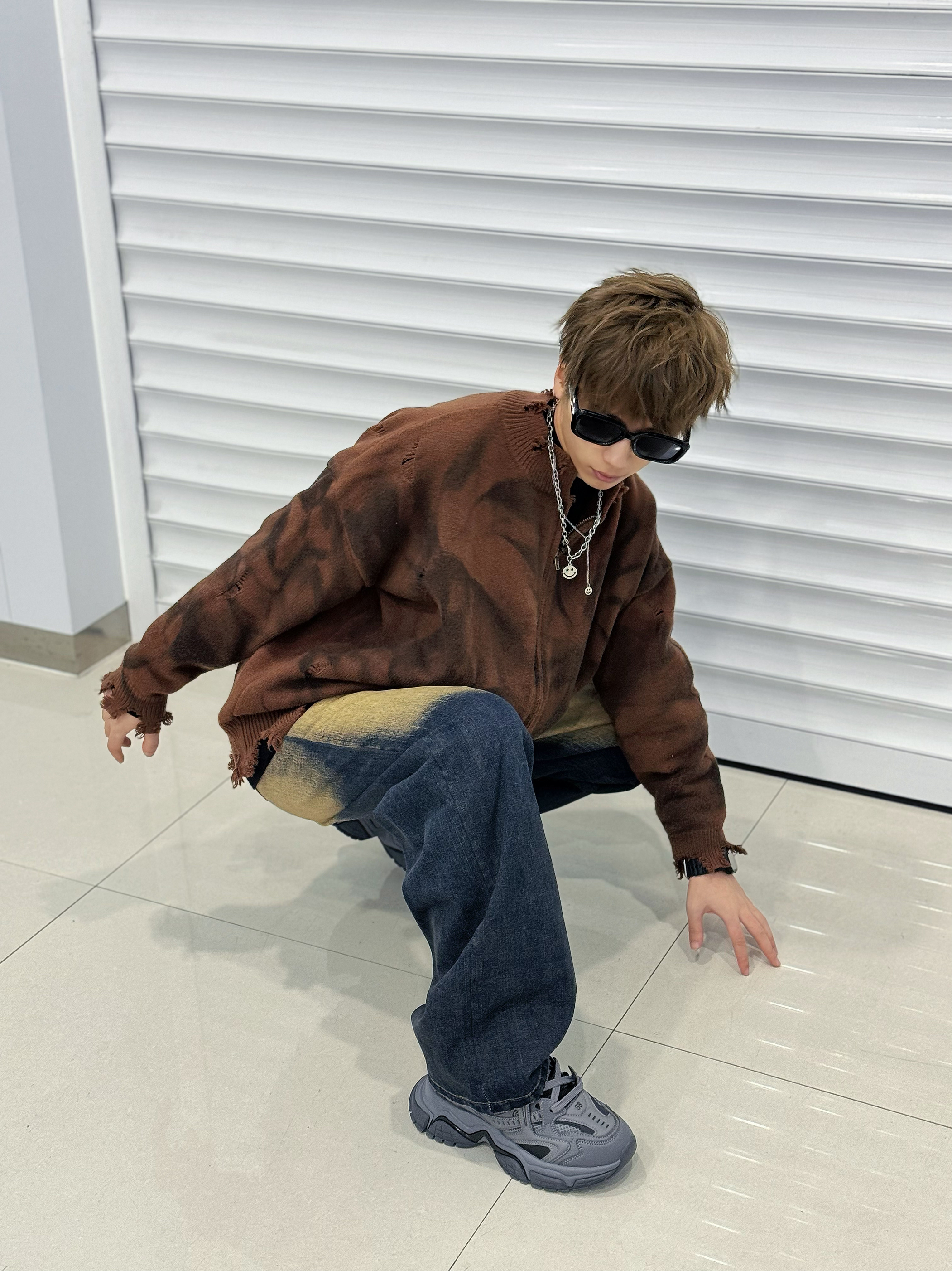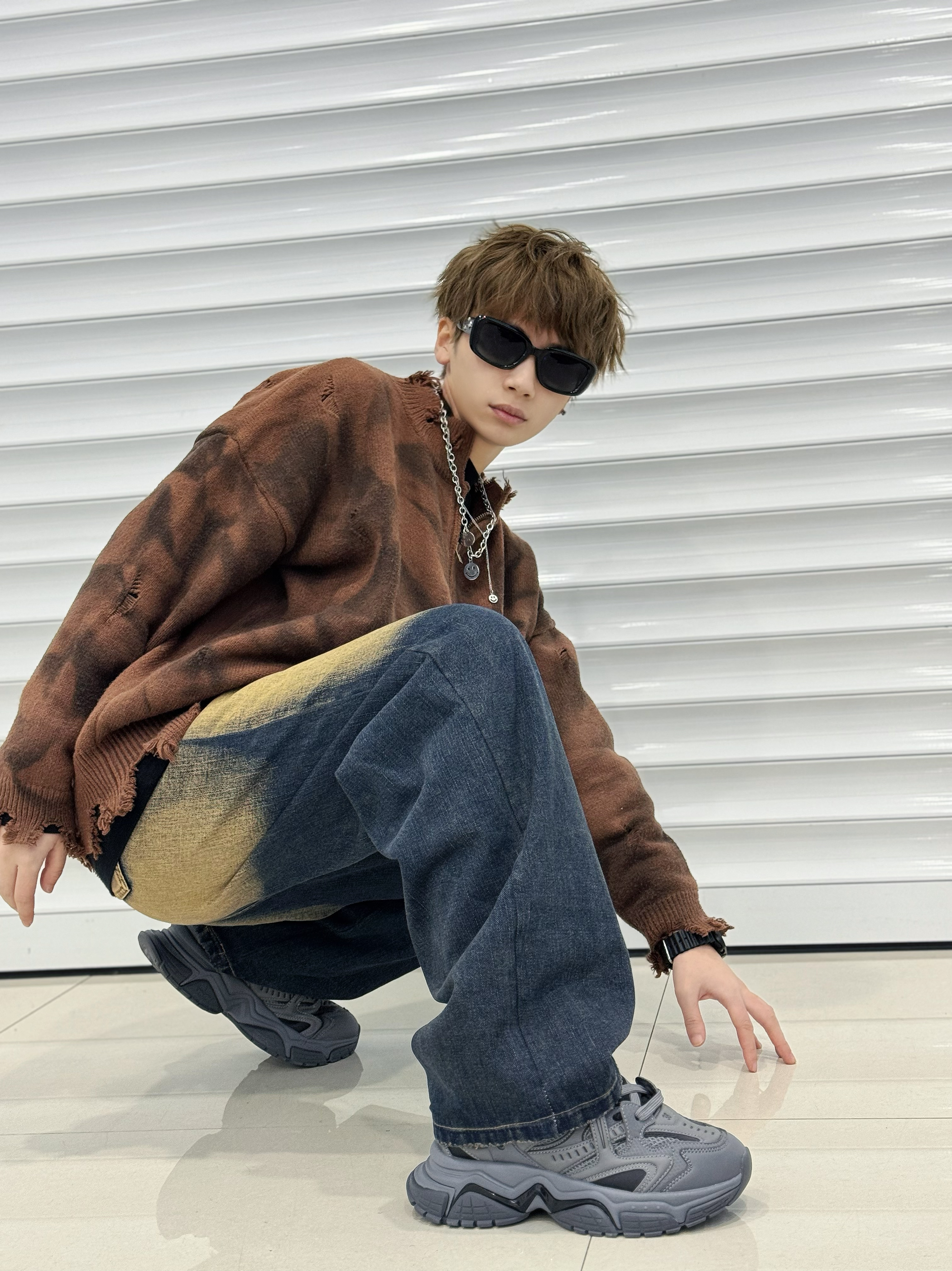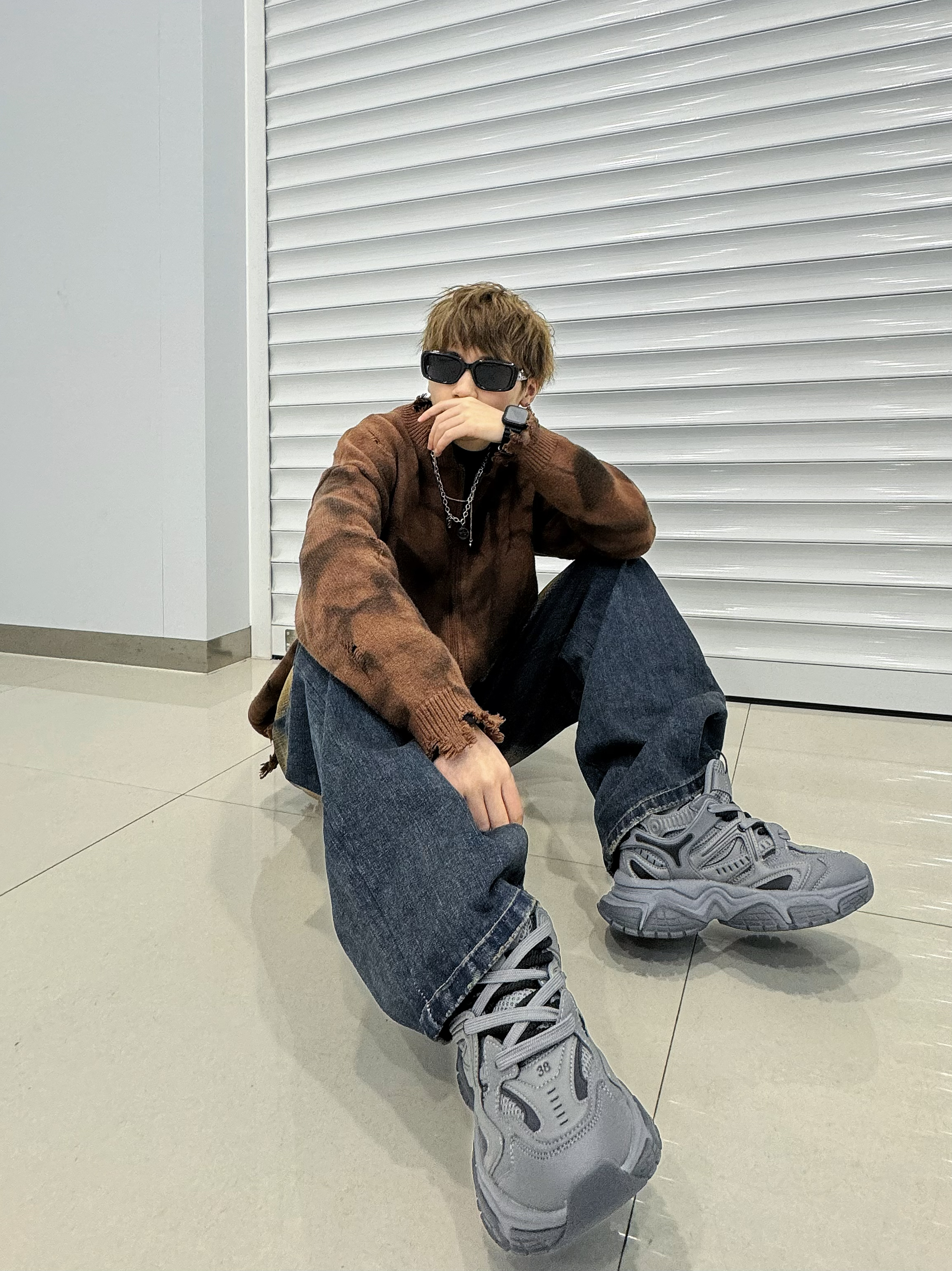 halo这里是嘎嘎的日常穿搭分享🥳 - 看腻了千篇一律的黑白灰,可以试试美拉德 棕色的开衫毛衣,做旧的破坏风设计很有街头感 内搭黑T和一串项链增加层次感 下身选择渐变做旧的直筒牛仔裤 宽松的裤型让整体穿搭变得很松弛 最后搭配一双灰色老爹鞋 纵横交错的拼接设计,机能感十足 5cm的增高厚底,可以拉长腿部比例 脚感软弹适中,日常搭配无压力✔️